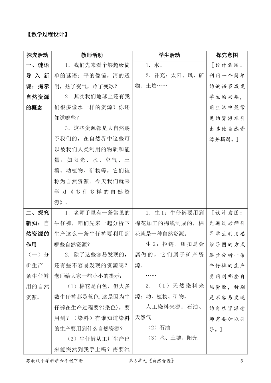 苏教版小学科学六年级下册第3单元《自然资源》1学科网(北京)股份有限公司9.多种多样的自然资源【课标落实】1.本单元通过一系列观察、比较、实验、模拟、交流等活动,落实《课程标准》高年段的课程目标。科学知识:认识人类与自然资源和能源的关系,知道地球是人类应当珍惜的家园。科学探究:能基于所学的知识,从事物的结构功能、变化及相互关系等角度提出可探究的科学问题。能基于所学的知识,从事物的结构功能、变化及相互关系等角度提出有针对性的假设,并能说明假设的依据。能基于所学的知识,通过观察、实验、查阅资料、调查、案例分析等方式获取事物的信息。科学态度:表现出对事物的结构、功能、变化及相互关系进行科学探究的兴趣。能接受别人的批评意见,反思、调整自己的探究;在进行多人合作时,愿意沟通交流,综合考虑小组各成员的意见,形成集体的观点。科学、技术、社会与环境:认识到人类、动植物、环境的相互影响和相互依存关系,了解地球上的资源是有限的,人类活动会对环境产生正面和负面的影响,自觉采取行动,保护环境。2.本课学习内容基于《课程标准》课程内容中“地球与宇宙科学”的高年段要求。3.认识人类与自然资源和能源的关系,知道地球是人类应当珍惜的家园。【教材分析】《多种多样的自然资源》是苏教版科学六年级下册第3单元《自然资源》的第一课时。通过前几年科学课的学习,这节课所讲的这些自然资源对学生来讲都比较熟悉。本课重在让学生注意到人类的生产生活中离不开多种多样的自然资源,特别是一些间接利用到的自然资源,用科学语言、概念图等方式记录整理有关自然资源的信息,表述探究结果。本课教学内容分三个部分:第一部分,这是一个导入活动,老师引导学生思考一个物品的生产会用到那些自然资源资源,了解到人类的生产生活离不开各种自然资源。第二部分,通过对各种自然资源的分类整理,进一步了解自然资源。第三部分,通过阅读资料,分析整理记录整理有关热带雨林、海洋自然资源的信息。苏教版小学科学六年级下册第3单元《自然资源》2学科网(北京)股份有限公司【学情分析】通过前五年的科学课上的学习,学生其实已经对很多自然资源有了一定的了解,但可能还没有深刻认识到人类的生产生活离不开自然资源。本课教学中要重点通过活动帮助学生认识人类的生产生活离不开自然资源。了解热带雨林、海洋等为人类生存提供了生物、矿产、能源等多种资源。能基于所学的知识,用科学语言、概念图等方式记录整理有关自然资源的信息,表述探究结果。六年级学生在五年级的时候,已经具有了初步学会使用思维导图帮助整理归纳知识,在本节课中多次使用思维导图帮助学生进行更加高效的归纳整理,提高学习效率。【教学目标】科学知识:1.描述人类的生产生活离不开自然资源。2.了解海洋为人类生存提供了生物、矿产、能源等多种资源。科学探究:1.能基于所学的知识,通过查阅资料、调查等方式获取有关自然资源的信息。2.能基于所学的知识,用科学语言、概念图等方式记录整理有关自然资源的信息,表述探究结果。科学态度:1.对有关自然资源的问题具有探究的兴趣。科学、技术、社会与环境:1.意识到人类、动植物、环境存在相互依存的关系。【教学重点】描述人类的生产生活离不开自然资源。了解热带雨林、海洋等为人类生存提供了生物、矿产、能源等多种资源。【教学难点】能基于所学的知识,用科学语言、概念图等方式记录整理有关自然资源的信息,表述探究结果。【教学准备】教师材料:课件。学生材料:活动记录单。【教学时间】1课时苏教版小学科学六年级下册第3单元《自然资源》3学科网(北京)股份有限公司【教学过程设计】探究活动教师活动学生活动探究意图一、谜语导入新课:揭示自然资源的概念1.我们先来看个够超级简单的谜语:平的像镜,清的透明,热了变气,冷了变冰?2.其实我们地球上还有我们很多像水一样的资源?你还知道哪些?3.这些资源都是大自然赐予我们的,在自然界中这些可以被我们人类利用的物质和能量,如阳光、水、空气、土壤、动植物、矿物等,它们被称为自然资源。今天我们就来学习《多种多样的自然资源》。1.水。2.补充...