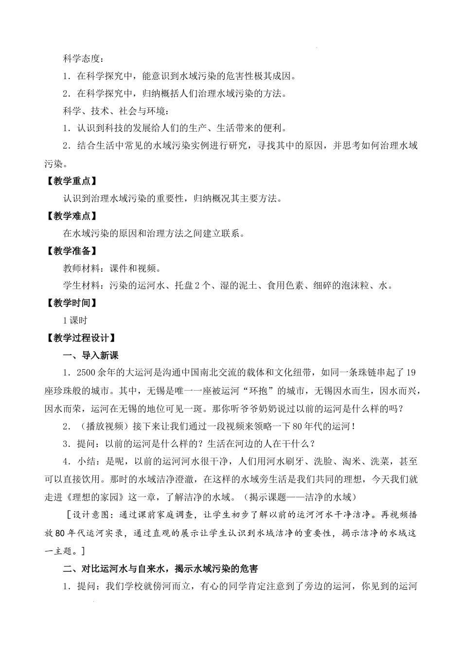 学科网(北京)股份有限公司13.洁净的水域【课标落实】1.本单元通过一系列观察、比较、实验、交流等活动,落实《课程标准》高年段的课程目标。科学知识:了解生物的生存条件和生物的多样性;认识人类与自然资源的关系,知道地球是人类应当珍惜的家园。科学探究:能基于所学的知识,通过观察、实验、查阅资料、调查、案例分析等方式获取事物的信息。能基于所学的知识,运用分析、比较、推理、概括等方法得出科学探究的结论,判断结论与假设是否一致。能基于所学的知识,采用不同的表述方式,用科学小论文、调查报告等方式,呈现探究的过程与结论;能基于证据质疑并评价别人的探究报告。科学态度:在科学探究中能以事实为依据,不从众,不轻易相信权威与书本;面对有说服力的证据,能调整自己的观点。乐于尝试运用多种材料、多种思路、多样方法完成科学探究,对事物的结构、功能、变化及相互关系有探究兴趣。。科学、技术、社会与环境:认识到人类、动植物、环境的相互影响和相互依存关系,了解地球上的资源是有限的,人类活动会对环境产生正面和负面的影响,自觉采取行动,保护环境。2.本课学习内容基于《课程标准》课程内容中“生命科学领域”的高年段要求。3.人类不合理的活动对水域、空气、生物、土地会产生不良后果,而恶劣的环境也会对人体健康造成影响。人与自然环境需要和谐相处,人类必须要保护环境、保护身边多种多样的生物,建设理想家园。【教材分析】《洁净的水域》是苏教版科学六年级下册第4单元《理想的家园》的第一课时。通过三年级上册第4单元《地球上的水资源》的学习,学生已经认识地球上水资源的分布及各种水体的特点。因此水域对学生来讲并不陌生。本课将进一步带领学生关注身边水域的污染与保学科网(北京)股份有限公司护问题,帮助学生建立起“水域”和“污染”的概念。让学生清楚了解洁净的水对生命的重要性,从而引起学生对水资源的关注,增强青少年对于守护周围水环境的责任感。本课教学内容分四个部分:第一部分,这是一个导入活动,通过正反例的对比,讨论水域的变化,将身边水域污染严重这一严峻事实性问题揭示出来,让学生思考水域污染的原因及其危害。第二部分,通过建立模型,模拟土壤污水和地面固体废弃物进入水域,引导学生观察这一过程是怎么发生的,思考去除固体废弃物的方法。第三部分,通过阅读资料,引导学生分析滇池污染原因和治理方法。引导学生联系实际,针对周围水域污染的具体原因设计有效的解决方案。第四部分,让学生调查了解所在城市水域污染情况及治理方法,了解其做法,评析其效果。【学情分析】对于六年级的孩子来说,在学习了整个小学阶段关于水资源知识的后,学生对水、水资源、水循环等都有了基本的了解,知道水是重要资源,且我国的淡水资源有人均储量低、地区分布不均的特点。但对于污染还接触不多,因此本课将对水域污染及治理进行一个融合,去讨论怎样保护周围的水域,水域污染的成因及治理方法。本课将借助正反例对比、建立模型、阅读资料和动手实验等方法,帮助学生由表及里、由分到合地去研究,最终建立一个整体性的认知。从学生的年龄结构和心理特征来看,六年级的小学生有很强的求知欲,同时也兼备独立意识,吸取信息能力更强,但选择和处理信息的能力还不强,还需要在教师的帮助下判断与辨析。通过三年级上科学第4单元《地球上的水资源》的学习,学生对水资源种类及储量有了基本认知,知道人们要节约水资源。本课将通过建立模型的方法,提升学生实验技能。【教学目标】科学知识:1.通过观察,能区别洁净的水域和受到污染的水域。2.通过讨论,知道污染的水域对人体健康有危害。3.通过实验,知道污水和固体废弃物如何从陆地进入水域的。科学探究:1.能用通过观察对比河流周围环境,总结造成水域污染的原因。2.能通过分析水质污染,举例说明污染的水会造成哪些危害。3.能通过资料阅读,分析滇池治理这一典型案例,指出人们是如何针对水域污染的原因设计解决方案解决问题的。4.注重实验习惯的培养,引导学生仔细观察、及时记录、分析数据、得出并交流结论、及时反思等。学科网(北京)股份有限公司科学态度...