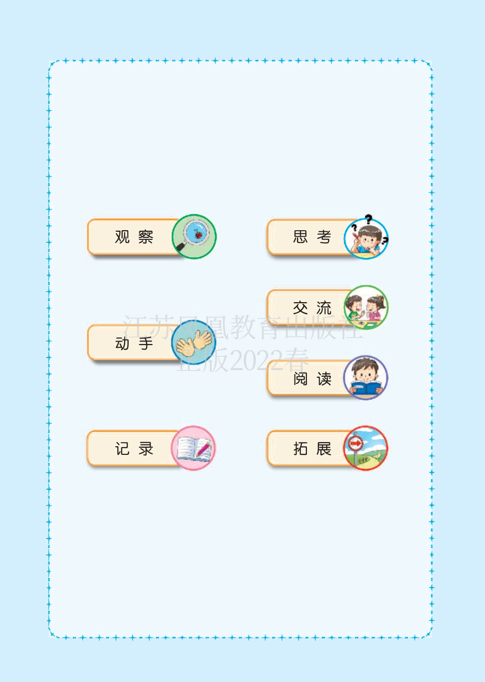 江苏凤凰教育出版社正版2022春观察思考交流阅读拓展动手记录江苏凤凰教育出版社正版2022春给小朋友的信亲爱的小朋友:这是你在小学学习科学的最后一学期了。本学期,我们的探究领域将进一步拓展,学习内容将进一步加深。什么是能量?能量有哪些形式?能量之间怎么转换?这些问题的答案就在《神奇的能量》里。你一定听说过“螳螂捕蝉,黄雀在后”的成语故事,自然界中有许多这样吃与被吃的关系,它们相互关联,相互交叉,形成了食物链和食物网。如果其中一个物种消失了,会导致什么后果呢?去《生物和栖息地》中寻找答案吧!自然界有很多资源可以被人类利用。但是,随着地球人口的不断增长,自然资源短缺和环境污染问题日益严重。开发新能源、善用自然资源已迫在眉睫。好在人类已经意识到问题的严重性。人们开始描绘心中的理想家园:洁净的水域、清新的空气、多样的生物、健康的土地……在《理想的家园》里可以看到大家正为之付出努力。《像科学家那样……》会让你进一步了解科学家是如何做研究的,也会告诉你科学知识是不断更新和发展的。再见了,小朋友!愿你永远保持好奇心,带着对科学的兴趣和热爱,勇攀高峰!编者大朋友江苏凤凰教育出版社正版2022春六年级下册目录1单元神奇的能量1.什么是能量22.各种各样的能量53.能量的转换84.电磁铁112单元生物和栖息地5.多样的栖息地146.有趣的食物链177.做个生态瓶208.适应生存的本领224单元理想的家园13.洁净的水域3814.清新的空气4115.多样的生物4316.健康的土地469.多种多样的自然资源2610.煤、石油和天然气2911.开发新能源3112.善用自然资源343单元自然资源STEM学习节能小屋49专项学习像科学家那样……57科学阅读科技发展历程662目录江苏凤凰教育出版社正版2022春单元1神奇的能量小草靠什么生长?在四季中吮吸着雨露;风筝靠什么飞上蓝天?在阳光下自由地飞翔;水车靠什么转动?在河边吱呀呀地歌唱;火车靠什么行驶?在铁轨上飞快地奔跑。……1江苏凤凰教育出版社正版2022春1什么是能量这些物体靠什么工作或运动?能量能够使物体工作或运动。虽然你看不见它,却能感觉到它。只要有移动、发热、冷却、生长、发光或发声等现象,其中就有能量在起作用。2江苏凤凰教育出版社正版2022春做撞棋游戏,体验动能。这些事物具有的动能分别表现在哪里?把A棋子弹向B棋子,看谁能使B棋子移动的距离更远。运动的物体具有能量,这种能量叫作动能。AB泥石流撞击保龄球龙卷风钱塘江大潮见学生活动手册第1页1单元神奇的能量3江苏凤凰教育出版社正版2022春见学生活动手册第1页做小球反弹实验,体验势能。这些物体的势能分别表现在哪里?让球从不同的高度落下,比较球的反弹高度。动能、势能都是机械能,它们是能量的两种基本形式。位于高处的物体具有能量,发生形变的物体也具有能量,这是一种“储存”起来的能量,只有在释放后才能显现,这种能量叫作势能。拉长的橡皮筋准备跳水的跳板运动员拉开的弓压缩的弹簧4江苏凤凰教育出版社正版2022春2各种各样的能量热能可以通过哪几种方式向周围传递?观察冰的融化,体验双手握住冰块时的感觉。能量的形式多种多样,除了机械能,还有声能、光能、热能、电能、电磁能、化学能和核能等。见学生活动手册第2页1单元神奇的能量5江苏凤凰教育出版社正版2022春电能可以干什么?化学能是在什么情况下释放的?奔跑遥控小车汽车开动篝火燃烧化学能是一种隐蔽的能量,绿色植物、食物、电池、煤、汽油中均储存着化学能。见学生活动手册第2页食物就是人体的“燃料”。6江苏凤凰教育出版社正版2022春核能是原子核在聚变或裂变的过程中产生的能量。太阳等恒星发出的光是由原子核聚变产生的,核电站发电所用到的热能是由原子核裂变产生的。核能核能是原子核在聚变或裂变的过程中产生的能量。太阳等恒星体验光具有能量。微波炉X光机1.将辐射计平放在桌面,待叶片静止。2.打开手电筒,照射叶片黑色一面。3.观察叶片的变化情况。可见光是一种看得见的电磁波,微波、X光是看不见的电磁波,它们所具有的能量都属于电磁能。太阳核电站1单元神奇的能量7江苏凤凰教育出版社正版2022春3能量的转换体验动能与势能的相互转换。体验动能与...