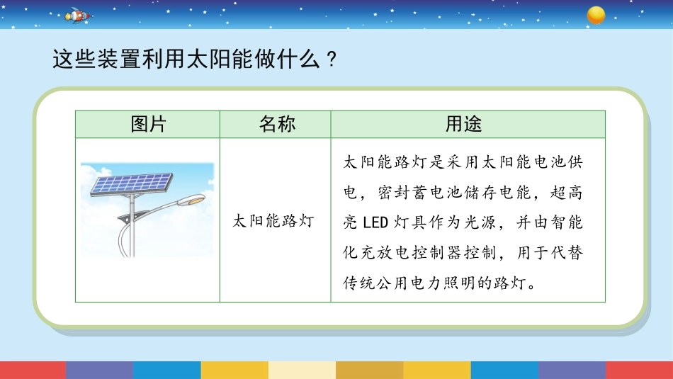 第三单元11.开发新能源新能源指在新技术的基础上,系统开发利用的能源,如太阳能、风能、地热能、生物质能、核能、潮汐能等。为解决煤、石油和天然气这些常规能源终将枯竭的问题,人们正在努力开发新能源。这些装置利用太阳能做什么?图片名称用途太阳能路灯是采用太阳能电池供电,密封蓄电池储存电能,超高亮LED灯具作为光源,并由智能化充放电控制器控制,用于代替传统公用电力照明的路灯。太阳能路灯太阳灶太阳能汽车太阳灶是利用一种太阳能辐射,通过聚光等形式获取热量,对食物进行加热,进行炊事烹饪食物的装置。它不烧任何燃料、没有任何污染;方便快捷、简单易制。太阳能汽车是一种靠太阳能来驱动的汽车。相比传统热机驱动的汽车,太阳能汽车是真正的零排放。正因为其环保的特点,太阳能汽车被诸多国家所提倡,太阳能汽车产业的发展也日益蓬勃。太阳能冰箱空间站上的太阳能帆板太阳能冰箱通过太阳光直接照在太阳能电池板上产生电能使冰箱工作。这种太阳能电池板还可以对蓄电池充电,可为野外场所,野外活动,家居应急等提供电力。太阳能帆板是收集太阳能的装置,通常用于卫星、宇宙飞船的供能。制作材料:太阳能光电板、马达、开关、车轴、齿轮、结构板、车轮、橡皮圈等。制作步骤:(1)如图1,安装马达,开关和太阳能光电板连接线。(2)如图2,安装小车主体结构。做一辆太阳能小车,比一比谁做的小车跑得快。制作步骤:(3)如图3,安装太阳能光电板和开关结构板。(4)卡紧太阳能光电板,太阳能小车制作完成。制作原理:太阳能小车是通过利用自然资源——太阳光来发电。太阳能混合动力小车的工作原理是有一块太阳能光电板,只要一有太阳光,它就会将光能转变为电能,另外可外接电池通过电缆线及时传输到小车的马达上,通过皮带的传动让小车跑起来。●问题:光电板受光面积与小车速度是否有关?●假设:受光面积大,小车速度快。●改变的条件:光电板的面积大小。●不变的条件:光电板的受光角度。●实验方法:对光电板进行部分遮挡。●实验现象:对光电板进行部分遮挡后,小车的速度变慢了。●实验结论:小车的速度与受光面积有关。在光电板角度不变的情况下,受光面积越大,小车速度越快。探究影响太阳能小车速度的因素。●问题:光电板受光角度与小车速度是否有关?●假设:受光角度为90°,小车速度快。●改变的条件:光电板的受光角度。●不变的条件:光电板的面积大小。●实验方法:改变光电板的受光角度。●实验现象:改变光电板的受光角度后,受光角度为90°,小车速度最快。●实验结论:受光角度与小车的速度有关,在光电板面积不变的前提下,受光角度为90°,小车速度最快。常见新能源◎风能全球风能资源蕴藏量巨大,比地球上可开发利用的水能总量还要多10倍。风能的利用,主要是风力发电,即利用风力带动风车叶片旋转,再通过增速机将旋转速度提升,来促使发电机发电。我国风能资源丰富的地区主要分布在北部地区、东南沿海及附近岛屿。◎地热能地热来自地球深处,这种热能储量非常大。通过钻井,可以把这些热从地下储层引入水池、房间、温室和发电站等。地热能是一种新的清洁能源,在当今人们的环保意识日渐增强和能源日趋紧张的情况下,对地热资源的合理开发利用越来越受到重视。我国地热资源丰富,大多可直接利用。◎生物质能生物质能是指自然界中的生物及它们产生的废弃物提供的能量,蕴藏在薪柴、玉米、藻类、稻壳、动物粪便和生活垃圾中。利用这些原料,不仅可以通过制取沼气用于取暖和发电,还可以生产生物燃料,如生物乙醇、生物柴油等。我国生物质能资源十分丰富,有广阔的应用前景。生物燃料生物乙醇(酒精)与生物柴油用自己的方式介绍一种新能源。无污染的新能源——可燃冰今天我读了一篇文章,才知道原来有一种洁净、无污染的新能源——可燃冰。这种可燃冰是天然气(甲烷类)被包进水分子中,在海底低温与压力下结晶形成的。这种白色的固体在常温下可释放64立方米甲烷气体和0.8立方米淡水,而且几乎不产生任何污染,现在正全力开采这种可燃冰。但在普及的过程当中,困难就会随之而来。如开采的困难,现在开采的方法有热解法、降压法和置换法等,但无一不是既费...