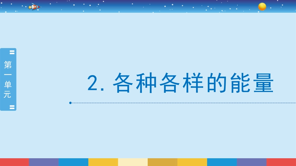 第一单元2.各种各样的能量能量的形式多种多样,除了机械能,还有声能、光能、热能、电能、电磁能、化学能和核能等。观察冰的融化,体验双手握住冰块时的感觉。冰雪融化用手融化冰块结论冰块在融化过程中吸收了热量。1.冰融化时,需要吸收热量,温度升到0℃时开始融化,冰水混合物的状态时,温度保持0℃不变。直到冰完全融化时,水温才会慢慢升高。这一过程中要不断地吸收热量。2.取一块冰放在手心,用双手握住。我们会明显感觉手心发凉,冰块表面会融化成水。热能可以通过哪几种方式向周围传递?热传递又称“传热”,是指热量从一个物体传递到另一个物体,或者从物体的一部分传递到另一部分的过程。常把它分成三种基本方式,即热传导、热辐射及热对流。1.热传导:热传导是固体热传递的重要方式。它是指在没有物质迁移的情况下,热量从物体的一部分传递到另一部分或者从一个物体传递到另一个物体的过程。2.热辐射:物体由于具有温度而辐射电磁波的现象,称为热辐射。3.热对流:是指流体中质点发生相对位移而引起的热量传递过程,一般是指依靠液体或者气体本身的流动传热的过程。电能可以干什么?台灯、电风扇、电视机、电饭煲、录音机等电器有了电就可以进行各种“工作”,做各种运动或者发光、发声、发热……我们把电具有的这种能量,叫电能。化学能是在什么情况下释放的?(1)人体内的化学能。人体的能量来源于每天所吃的食物,食物在体内通过一系列化学反应产生能量。所以,食物中储存着化学能。篝火燃烧是利用木材中的化学能通过燃烧这一化学反应过程,释放木材中的化学能,发光、发热。(2)燃料中的化学能。(3)燃料中的化学能。汽车开动时,通过发动机燃烧汽油来提供能量,汽油来自于石油,通过燃烧汽油释放化学能。汽车开动时,通过发动机燃烧汽油来提供能量,汽油来自于石油,通过燃烧汽油释放化学能。储存在燃料、食物和一些化学物质中的能量叫化学能。化学能是一种隐蔽的能量,绿色植物、食物、电池、煤、汽油中均储存着化学能。比较光能的大小。实验方法:1.在黑纸片上开一个小孔。2.分别用手电简和激光笔从小孔中照射装满水的玻璃瓶。3.观察投射出的光斑有什么不同。实验现象:激光笔透过水瓶投射在屏上的光斑很明显。手电筒透过水瓶投射在屏上形成的光斑很微弱。实验结论:不同的光能量不同,激光的能量大于手电简的能量。光是一种看得见的电磁波,微波、X光是看不见的电磁波,它们所具有的能量都属于电磁能。核能核能是原子核在聚合或分裂的过程中产生的能量。太阳等恒星发出的光是由原子核聚变产生的,核电站发电所用到的热能是由原子核裂变产生的。太阳核能站