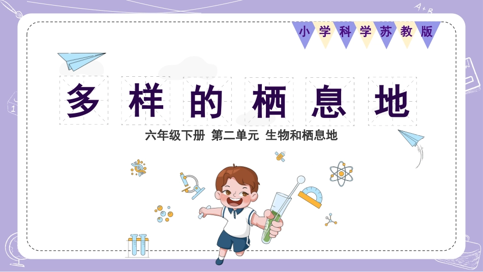多样小学科学苏教版六年级下册第二单元生物和栖息地的栖息地一种生物之所以能够长期生活在某个环境里,是因为这个环境为它提供了生存、生长和繁殖所必需的食物、水、庇护所等条件,这样的场所被称为栖息地。栖息地可以大到一个区域,也可以小到一个水坑。认识生物栖息地寻找校园里的栖息地1.用几个词语描述这处栖息地的特点。2.记录在这处栖息地观察到的生物。分小组寻找校园内的一处栖息地。生物的生长受到食物、温度、降水、日照和土壤等不同因素的影响。多样化的栖息地孕育出多样化的生物。这些栖息地满足了生物的哪些需求?大熊猫的栖息地四姑娘山由4座绵延不断的山峰组成,主峰幺妹峰海拔6250米,山体陡峭,直指蓝天,冰雪覆盖,银光照人。山间清澈的溪流潺潺不绝。山区针叶、阔叶林交互,植物茂密,竹林成片。卧龙自然保护区属于典型的内陆山地气候。冬半年天气多晴朗干燥,也会有降雪或降雨;夏半年湿润,有丰富的降水。保护区有幽深的森林,植被变化多样,竹类资源极其丰富夹金山海拔4000多米,这里峰峦叠嶂,千岩竞秀,溪流纵横,湖泊明净,自然风光旖旎,野生动植物资源丰富,特别是箭竹繁茂,有着独特的高原气候条件和相对封闭的原始自然环境。(1)从四姑娘山、卧龙自然保护区、夹金山的相关描述中画出与大熊猫栖息地有关的信息。(2)从气候、植被、水源、食物等方面分类整理资料中的相关信息。(3)归纳概括三个地区的相同之处,分析这些地区成为大熊猫保护区的原因。大熊猫的栖息地谢谢观看小学科学苏教版