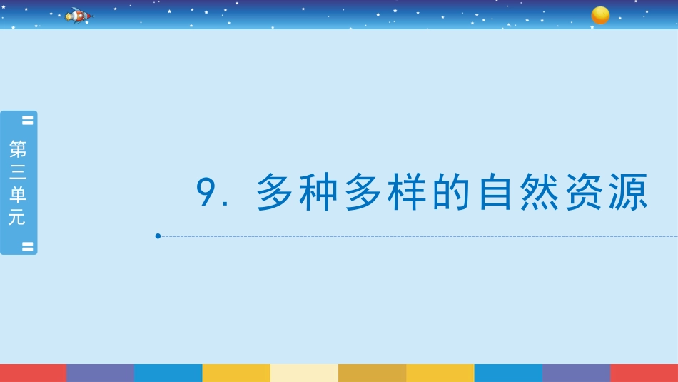 第三单元9.多种多样的自然资源看图,分析生产一条牛仔裤可能用到哪些自然资源。石油运输矿物辅料染料阳光水和土壤天然气石油棉花结论:生产一条牛仔裤可能用到矿产资源、土地资源、生物资源、气候资源和水资源等多种自然资源。选择教室或书包里的某个物品,分析它可能用到的自然资源。分析:教室中常见的物品有书桌、座椅、黑板、窗户、窗帘等;书包里的常见物品有铅笔、中性笔、彩笔、课本、笔记本、作业本、计算器、橡皮、尺子等。这些材料用到的主要材料有木材、金属、塑料、橡胶、玻璃等。木材和天然橡胶都取自于植物,这是利用了生物资源,而植物的生长又离不开气候资源、土地资源和水资源;金属、塑料、玻璃的主要原料都来自矿物,利用了矿产资源。自然界有许多可以被人类利用的物质和能量,如阳光、水、空气、土壤、动植物、矿物等,它们被称为自然资源。不同类型的自然资源有不同的用途,有的和物品制造有关,有的和能量利用有关,人类的生存离不开它们。根据资源类型,给自然资源归类。土地资源水资源矿产资源生物资源气候资源自然资源名称土地资源矿产资源水资源气候资源生物资源土壤煤、矿物、岩石、石油海洋、冰川太阳、空气、风动物、植物丰富多样的自然资源自然资源丰富多样,为人类提供了生存条件和物质基础。◎热带雨林资源热带雨林常年气候炎热,雨量充沛,年降水量大多在2000毫米以上,全年分配比较均匀。◎海洋资源地球表面的71%是海洋。海洋是一个巨大的天然物产宝库,蕴藏着丰富的食品、矿产、能源和药物等资源。分析上述资料,你认为海洋资源为何会成为21世纪资源开发与利用的重点?因随着许多陆地资源的日益减少,人类对海洋资源的依赖将日益增大。海洋中蕴藏着丰富的多种资源,如生物资源、油气资源、固体矿物资源、海水资源、海洋能源、海洋旅游资源等,这些资源将为人类解决资源短缺提供巨大的物质支撑力。通过有计划、有方向的海洋开发活动,可逐步解决沿海地区社会、经济发展中的重大制约问题,如空间紧张、水资源短缺和食物数量与质量等问题。缓解沿海地区人口、资源、环境的矛盾,促进其社会与经济的可持续发展。