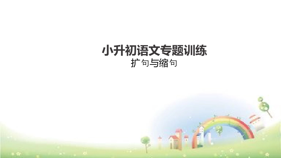 小升初语文专题训练句句扩与缩你更喜欢哪一棵?扩句就是把内容比较简单的句子,加上一定的修饰、限制和补充说明的成分,使句子的意思表达得更具体、更生动、更形象。例如:张华写作业。1.局部扩句法我们班的班长张华在明亮的教室里全神贯注地写作业。例如:太阳落山了。2.整体扩句法按“什么样的”太阳“在什么地方”“怎么样地”落山了红彤彤的太阳在远方渐渐地落山了。例如:月亮挂在夜空中。3.修辞扩句法比喻:月亮像一个美丽的大圆盘挂在夜空中。拟人:月亮姑娘升起来了,正悄悄地对身边的小星星说话。例如:春风来了。4.复句扩句法春风来了,她吹青了小草,吹皱了河水,吹鼓了花苞。例如:教室里很安静。5.综合扩句法窗明几净的教室里安静得连一根针掉在地上都能听得见,同学们都在聚精会神的看书。1.扩句时要根据表达需要合理增添有效的成份,不要生硬地堆砌意思相同的词语,不能前后重复,不能乱加修饰词造成句子啰嗦。注意:2、扩写时补充的内容要与原文内容一致,衔接要自然、流畅。注意:3.想象要大胆,要与众不同,努力营造新环境,创造新形象。注意:4.要保留句子实质,不能一味地扩充而改变句子原来所要表达的意思。注意:5.要按照规定的要求进行扩句。注意:6.还要注意在修饰限制词语后加上正确的“的”“地”“得”。注意:缩句就是把句子中非“主干”的修饰、限制成分去掉,只留下构成句子最基本的“主干成分。(1).敬爱的周总理无微不至地关怀着年轻的战士。(2).敬老院的李奶奶高兴得手舞足蹈。1、一般情况下不保留“的”“地”及前边的词语,还有“得”字后面的词语。夏天到了,几位游泳爱好者在清澈的九盘河里游泳。应当缩成“游泳爱好者游泳。不能缩成“游泳爱好者在游泳”。2、表示数量、方位、时间的词组应该完整地去掉。3.“着”、“了”、“过”要保留“着”字用在动词后面表示动作正在进行,如:“同学们上着课”,如果缩成“同学们上课”,就没说清楚是现在上课还是以前上课。“了”字用在动词后面表示动作已经完成。如:“雷老师给我们上了一堂难忘的科学课。”应当缩成“雷老师上了科学课。”若缩成“雷老师上课。”是正在上,还是上完了?不知道。3.“着”、“了”、“过”要保留“过”字用在动词后面表示动作已经过去。如:“我曾经游览过美丽的桂林。”如果缩成“我游览桂林。”是正在游览,还是曾经游览?没有说清楚。4:如果句子是问句,缩写以后同样也是一个问句。如:今天依然屹立不倒的长城不正是劳动人民的血汗和智慧的结晶吗?缩句为:长城不正是结晶吗?5、缩句时要保留必要的否定词原句:生活在海洋中的鲸不是鱼类。缩句:A:鲸是鱼类。B:鲸不是鱼类6、“把”字句、“被”子句里面“把”、“被”一般要保留。原句:他不小心把厨房里的碗打碎了。缩句为:他把碗打碎了。缩句练习:缩写:妈妈照顾我。缩写:鱼钩闪耀着光芒。缩写:同学们高兴。1.鱼钩闪耀着灿烂的光芒。2.妈妈无微不至地照顾我。3.同学们高兴得手舞足蹈。缩句练习:4.焰火在夜空里构成了一幅美妙无比的图案。缩写为:焰火构成了图案。6.小红认真地看着有趣的新书。缩写为:小红看着书。5.在农民的辛勤劳动下,今年的小麦长势十分良好。缩写为:小麦长势良好。