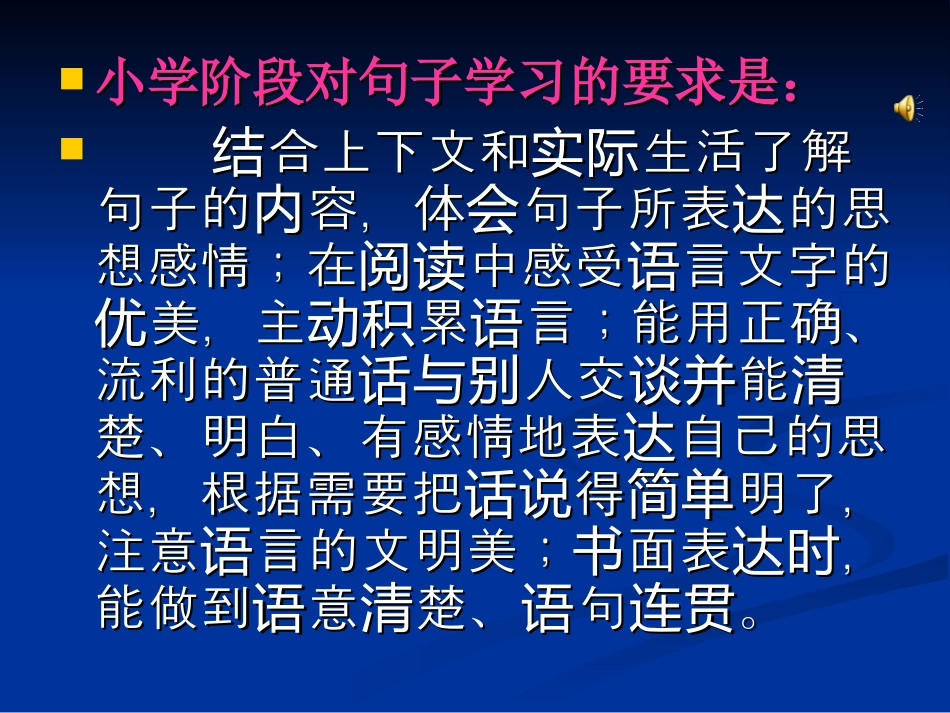 小升初句子复习小升初句子复习小学阶段对句子学习的要求是:小学阶段对句子学习的要求是:合上下文和生活了解结实际合上下文和生活了解结实际句子的容,体句子所表的思内会达句子的容,体句子所表的思内会达想感情;在中感受言文字的阅读语想感情;在中感受言文字的阅读语美,主累言;能用正确、优动积语美,主累言;能用正确、优动积语流利的普通人交能话与别谈并清流利的普通人交能话与别谈并清楚、明白、有感情地表自己的思达楚、明白、有感情地表自己的思达想,根据需要把得明了,话说简单想,根据需要把得明了,话说简单注意言的文明美;面表,语书达时注意言的文明美;面表,语书达时能做到意楚、句。语清语连贯能做到意楚、句。语清语连贯什么是句子?什么是句子?句子是由词和词组构成的,能句子是由词和词组构成的,能够表达完整的意思。够表达完整的意思。句子一般可分为两部分:前一句子一般可分为两部分:前一部分说的是谁、什么,后一部分说部分说的是谁、什么,后一部分说的是怎么样,是什么。的是怎么样,是什么。例如:例如:春天来了。春天来了。我们是少先队员。我们是少先队员。请在是句子的后面打对号。1、我吃饭了。()2、开满了各种各样的鲜花的巨大长方形的花园。()3、巨大长方形的花园开满了各种各样的鲜花。()4、快速的奔向那可爱的学校。()√√一、句式变换。二、扩句和缩句。三、关联句。四、修改病句。五、造句和仿句。六、理解句义。一、句式变换1、“把”字句与“被”字句互换;2、陈述句与反问句互换;3、双重否定句与肯定句互换;4、引述句与转述句互换;5、带有修辞手法句子:夸张句、拟人句、比喻句等。温馨提示:无论怎样变换句子,变换后的句意要和原句句意基本一致。基本方法基本方法::我叠好了被子。我叠好了被子。我叠好了衣服。把字句:我把衣服叠好了。被字句:衣服被我叠好了。基本方法基本方法::反问句是明知故问,用反问的语气表示强调。肯定形式的反问句,意思是否定的;否定形式的反问句,意思是肯定的。例如:难道我们能随意砍伐树木,破坏绿化吗?听了这个报告,难道我们不激动吗?陈述句反问句1.加上“难道”、“岂不”、“怎么样”、“怎么会”等表示疑问的词语。2.陈述句中有否定词去掉;没有否定词则加上。3.句末有时还要用上“呢”、“吗”等语气助词,同时变。?例:我们不能被困难吓倒。反问句陈述句1.去掉“难道”、“岂不”、“怎么样”、“怎么会”等表示疑问的词语。2.反问句中有否定词去掉;没有否定词则加上。3.句末还要去掉“呢”、“吗”等语气助词,同时变?。。字典不正是我无声的朋友和老师吗?双重否定就是肯定的意思。双重否定就是起强调的作用,常用的双重否定词有:“不得不”、“不能不”、“非……不可……”等。练习:1.幼儿园的小朋友都喜欢王老师。2.这个问题不能不讲清楚。3.说起地道战,谁也不能不承认是个奇迹。引述句引述句转述句转述句要注意三点:1.改标点符号:把冒号改为逗号,去掉表示引用的引号。2.改人称代词:第一人称改为第三人称,第二人称改为第一人称或所指人名代替。3.为了使句子表达的更通顺,我们还会加上、删去一两个字。比如最常见的就是加“让”。直接叙述改转述句时,我们还要把握一个原则:无论原句是什么语气,我们都要用陈述的语气把意思转述给别人听。练习:1.妈妈说:“星期六,我带你去少年宫学唱歌。”2.蔺相如说:“秦王我都不怕,会怕廉将军吗?”3.毛泽东对警卫员说:"你给大家泡些茶吧."4.妈妈说,明天星期六,她带我去少年宫学电脑。拟人句、比喻句比喻是利用两种不同性质的事物的相似点,借一事物来说明另一事物。拟人就是把物当作人来写,所写的物具有人的思想、动作、思维等。夸张就是对原有事物进行合乎情理的扩大或缩小。句式转换。1、武松打死了老虎。(改为“把”字句和“被”字句)2、妈妈对我说:“我中午不回来了,你自己在家做饭吃。”(改为转述句)3、贝多芬说,他是来弹一首曲子给这位姑娘听的。(改为直接叙述)4、音乐会的入场券太贵了,穷兄妹俩买不起。(改为反问句)5、春天来了,河边...