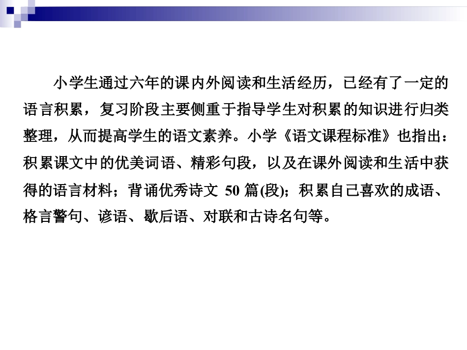 专题五背诵积累(含默写名篇、课文理解、文学常识、文化常识、名言警句、谚语、歇后语、对联、广告语、宣传标语)小学生通过六年的课内外阅读和生活经历,已经有了一定的语言积累,复习阶段主要侧重于指导学生对积累的知识进行归类整理,从而提高学生的语文素养。小学《语文课程标准》也指出:积累课文中的优美词语、精彩句段,以及在课外阅读和生活中获得的语言材料;背诵优秀诗文50篇(段);积累自己喜欢的成语、格言警句、谚语、歇后语、对联和古诗名句等。见word5【例1】《示儿》一诗中写诗人陆游临终前对儿子们的嘱托和表达自己心愿的诗句是______________,____________________。☞思路点拨:本题考查理解运用古诗词,首先要熟记,其次要理解诗句的内涵。【答案】王师北定中原日家祭无忘告乃翁【例2】根据文学常识积累填空。(1)我国第一部纪传体通史是《________》。(2)“一门父子三词客”这一诗句中的“父子三词客”指的是________、________、________。☞思路点拨:本题考查文化常识,在日常学习中,要善于积累,并要记准、记牢,不写错别字。【答案】(1)史记(2)苏洵苏轼苏辙1.按课文原文填空。燕子去了,有再来的时候;杨柳枯了,有再青的时候;桃花谢了,有再开的时候。但是,聪明的,你告诉我,我们的日子为什么一去不复返呢?2.根据积累的文化常识填空。(1)月亮的别称有玉盘、玉兔、婵娟等。(2)中国的别称:赤县、神州。3.根据提示填空。王老师让小平去他的办公室一趟,小平心里一直很不安,像十五只吊桶打水——七上八下。(填歇后语)小平是上学期转学的插班生,一开始成绩居于中游,经过一学期的努力,现在成绩名列前茅,真是砌墙的砖——后来居上。(填歇后语)4.开学了,需要重新布置教室,请你推荐几条宣传标语。示例:①书籍是人类进步的阶梯。——高尔基②宝剑锋从磨砺出,梅花香自苦寒来。③学习如逆水行舟,不进则退。④读书有三到:谓心到、眼到、口到。——朱熹5.读下面的对联,想想它们贴在什么门店最合适,将正确的答案填在括号里。书店理发店扇子店眼镜店(1)欲知千古事,须读五车书。(书店)(2)清风手中握,爽气满襟怀。(扇子店)(3)胸中存灼见,眼底辨秋毫。(眼镜店)(4)理世上万缕青丝,创人间头等事业。(理发店)6.根据下面的语言材料,对出下联。春天时,湖水荡漾,湖天一色,船行湖中,如行天上;秋日里,山色斑斓,山景如画,人游山里,似游画中。上联是:春水荡漾船如天上行;下联是:秋色斑斓人似画中游。