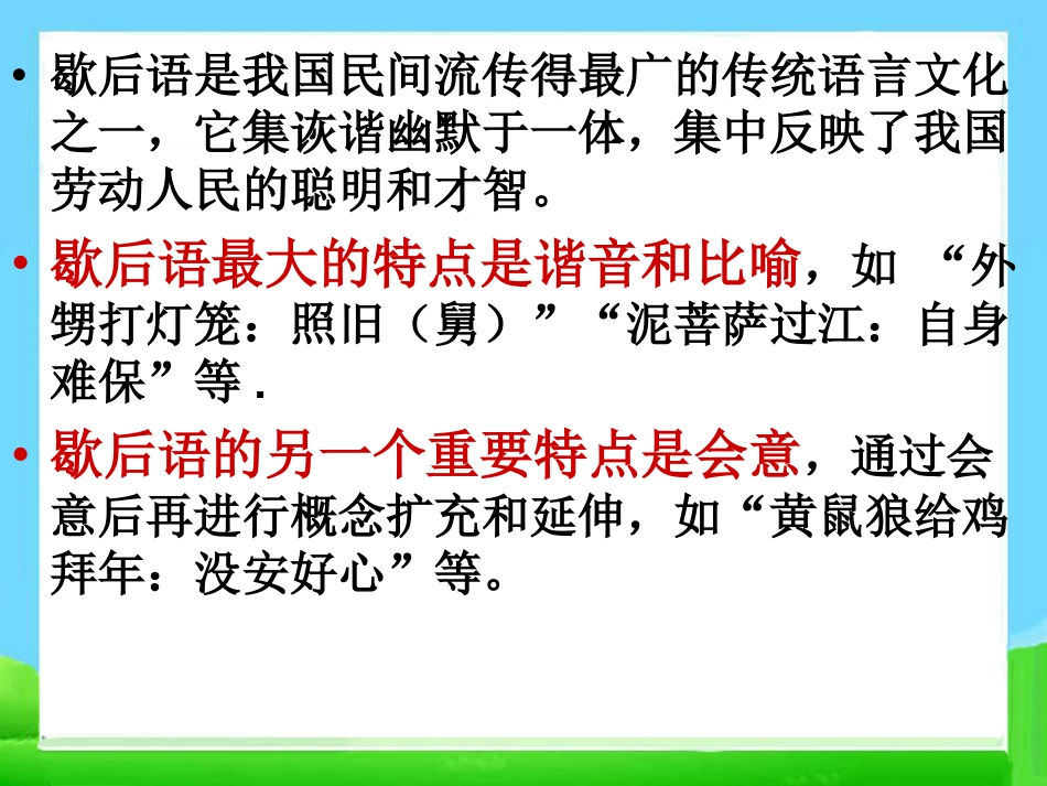 常用歇后语练习歇后语是我国人民在生活实践中创造的一种特殊语言形式。它一般由两个部分构成,前半截是形象的比喻,像谜面,后半截是解释、说明,像谜底,十分自然贴切。在一定的语言环境中,通常说出前半截,“歇”去后半截,就可以领会和猜想出它的本意,所以称它为歇后语。•歇后语是我国民间流传得最广的传统语言文化之一,它集诙谐幽默于一体,集中反映了我国劳动人民的聪明和才智。•歇后语最大的特点是谐音和比喻,如“外甥打灯笼:照旧(舅)”“泥菩萨过江:自身难保”等.•歇后语的另一个重要特点是会意,通过会意后再进行概念扩充和延伸,如“黄鼠狼给鸡拜年:没安好心”等。1、八仙过海--------各显神通2、半夜吃柿子——专拣软的捏3、蚕豆开花--------黑心4、孔夫子搬家——尽是书(输)5、打破砂锅--------问到底6、和尚打伞--------无法无天7、木匠带枷——自作自受8、画蛇添足--------多此一举9、箭在弦上--------不得不发10、井底青蛙--------不知天高地厚11、麻绳拴豆腐——提不起12、竹篮打水--------一场空13、打开天窗--------说亮话14、船到桥头--------自会直15、飞蛾扑火--------自取灭亡16、百米赛跑--------分秒必争17、二十一天不出鸡——坏蛋18、仇人相见--------分外眼红19、芝麻开花--------节节高20、聋子耳朵——摆设21、瞎子点灯--------白费蜡22、兔子尾巴--------长不了23、偷鸡不成--------蚀把米24、上嘴皮挨天,下嘴皮挨地————好大的口25、老虎屁股--------摸不得26、老虎拉车--------谁敢27、老鼠过街--------人人喊打28、麻雀虽小--------五脏俱全29、墙上茅草--------随风两边倒30、三十六计--------走为上计31、塞翁失马--------焉知祸福32、韩信点兵——多多益善33、丈二和尚--------摸不着头脑34、有借有还--------再借不难35、猫哭耗子--------假慈悲36、饺子破皮--------露了馅37、扁担挑水--------一心挂了两头38、窗户边吹喇叭——名声在外39、八仙聚会--------神聊40、霸王敬酒--------不干也得干41、板上订钉--------跑不了42、背鼓上门--------讨打43、草把做灯--------粗心(芯)44、瓦匠干活————拖泥带水45、菜刀切豆46、老鼠爬进书籍里—咬文嚼字47、高山上敲鼓------四面闻名(鸣)48、狗咬吕洞宾--------不识好人心49、关公走麦城--------骄必败50、铁打的公鸡--------一毛不拔51、鸡蛋碰石头--------不自量力52、姜太公钓鱼--------愿者上钩53、和尚头上的虱子-----明摆着54、十五个吊桶打水——七上八下55、老鼠钻风箱--------两头受气56、茶壶煮饺子——倒(道)不出57、门缝里看人--------把人看扁了58、徐庶入曹营—一语不发59、关公降曹操——身在曹营心在汉60、骑驴看唱本--------走着瞧61、客厅里挂狗皮—不像画(话)。62、高射炮打蚊子—大材小用。63、山中无老虎--------猴子称大王64、司马昭之心--------路人皆知65、做梦娶媳妇—想好事。66、王八吃秤砣--------铁了心67、歪嘴讲故事--斜(邪)说68、小葱拌豆腐--------一清二白69、小和尚念经--------有口无心70、周瑜打黄盖--------两厢情愿71、赶鸭子上架----吃力不讨好72、擀面杖吹火----一窍不通73、盐卤点豆腐—一物降一物。74、猴子捞月亮----空忙一场75、秀才遇到兵----有理讲不清76、阎王爷贴告示—鬼话连篇。77、飞机上点灯——高明78、狗撵鸭子——呱呱叫79、过年娶媳妇---双喜临门80、聋子见哑巴----不闻不问81、推小车上台阶--一步一个坎82、里弄里扛竹竿----直来直去83、苦水里泡黄连----苦上加苦84、我解缆,你推船--顺水人情85、猪鼻子里插葱----装象86、马路上的电线杆—靠边站。87、猪八戒照镜子-----里外不是人88、黄连树下吹喇叭——苦中作乐89、池塘里的风波----大不了90、谈心不点灯--说黑话91、聋子耳朵——摆设92、竹筒倒豆子—一干二净。93、程咬金的斧头——就这三下子94、到火神庙求雨----找错了门95、上鞋不用锥子——针(真)行96、拔了毛的凤凰——不如鸡97、出太阳下暴雨----假情(晴)98、刘备摔孩子----收买人心99、扯着胡子过河----谦虚过度100、唱歌不看曲本----离谱歇后语吵架•最近这些天,老公不知受...