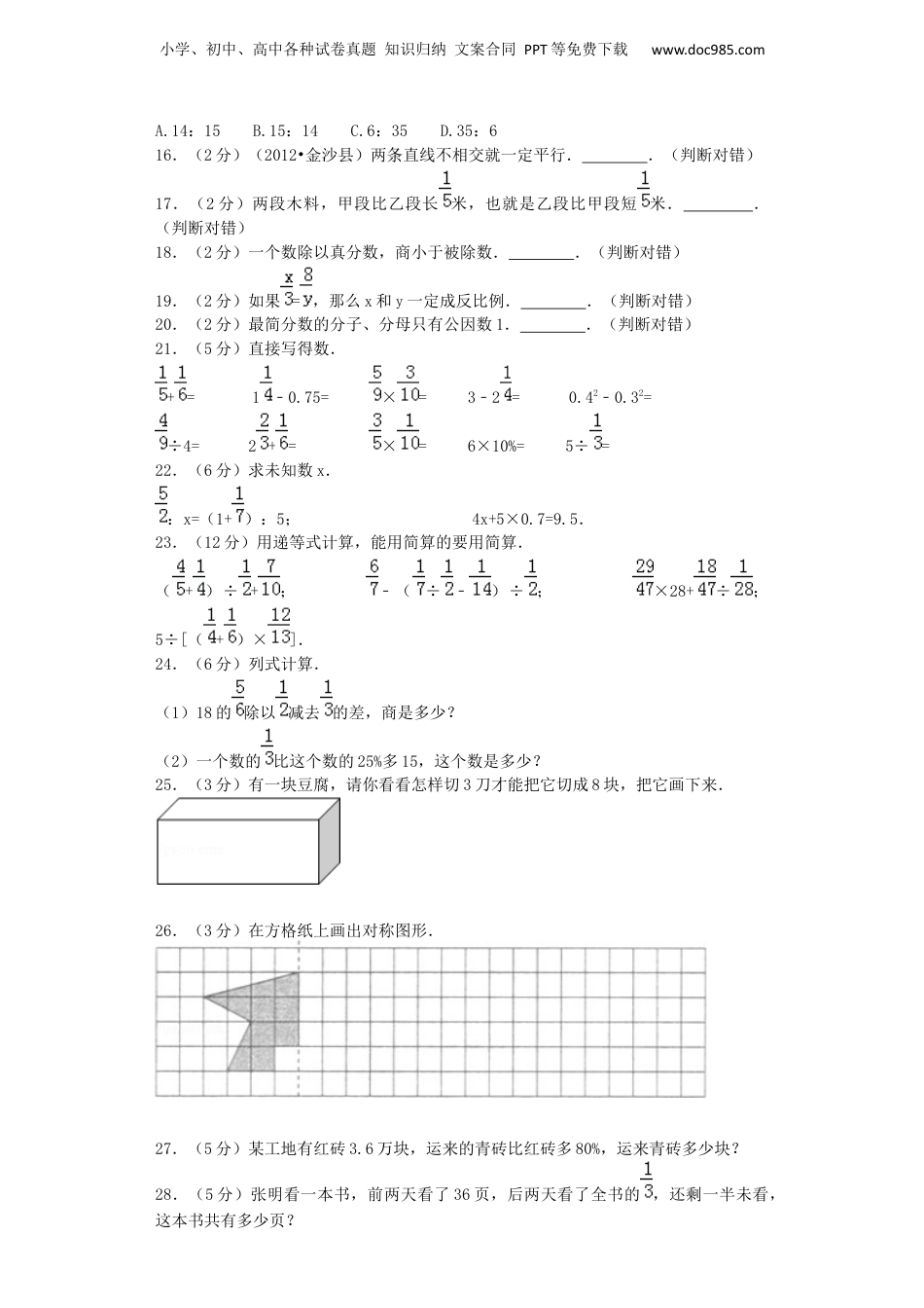 小学、初中、高中各种试卷真题知识归纳文案合同PPT等免费下载www.doc985.com人教新课标小升初数学模拟试卷(22)1.(2分)“情系玉树,大爱无疆﹣﹣抗震救灾大型募捐活动特别节目”募捐晚会共募得善款二十一亿七千五百万元人民币,这个数写作,省略亿后面的尾数是.2.(2分)的分数单位是,把它化成小数后小数的计数单位是.3.(2分)(2008•高邮市)3.5立方米=立方米立方分米;4吨50千克=吨.4.(2分)已知甲乙两个数的比是3:5,且乙数比甲数多6,那么乙数是.5.(2分)=12:==%=÷10.6.(2分)生产一批零件,生产一个零件的时间和完成任务需要的时间成比例.7.(2分)六年级一班有学生50人,今天有2人缺席,今天的出勤率是.8.(2分)一个零件长1.6毫米,画在图纸上是4厘米,这幅设计图的比例尺是.9.(2分)一个圆形花坛的周长是12.56米,它的面积是.10.(2分)如图,梯形下底的长度是上底的一半,其中三角形ABC的面积是6平方厘米.整个梯形的面积是平方厘米.11.(2分)下列说法正确的是()A.射线比直线长B.含有未知数的式子就是方程C.甲、乙两人同走同一段路,所用时间的比是4:5,他们的速度比是5:4D.一个棱长为6厘米的正方体它的表面积和体积相等12.(2分)在“苹果重量的相当于橘子的重量”中把()看做单位“1”.A.苹果重量B.橘子重量C.苹果与橘子的重量和13.(2分)一个圆柱体的底面周长是12.56厘米,高10厘米,它的体积是()A.125.6平方厘米B.12.56平方厘米C.12.56立方厘米D.125.6立方厘米14.(2分)把5米长的绳子平均分成7段,每段长度占全长的()A.米B.C.D.米15.(2分)甲数的等于乙数的(甲、乙数不等于0),甲、乙两数的比是()小学、初中、高中各种试卷真题知识归纳文案合同PPT等免费下载www.doc985.comA.14:15B.15:14C.6:35D.35:616.(2分)(2012•金沙县)两条直线不相交就一定平行..(判断对错)17.(2分)两段木料,甲段比乙段长米,也就是乙段比甲段短米..(判断对错)18.(2分)一个数除以真分数,商小于被除数..(判断对错)19.(2分)如果=,那么x和y一定成反比例..(判断对错)20.(2分)最简分数的分子、分母只有公因数1..(判断对错)21.(5分)直接写得数.+=1﹣0.75=×=3﹣2=0.42﹣0.32=÷4=2+=×=6×10%=5÷=22.(6分)求未知数x.:x=(1+):5;4x+5×0.7=9.5.23.(12分)用递等式计算,能用简算的要用简算.(+)÷+;﹣(÷﹣)÷;×28+÷;5÷[(+)×].24.(6分)列式计算.(1)18的除以减去的差,商是多少?(2)一个数的比这个数的25%多15,这个数是多少?25.(3分)有一块豆腐,请你看看怎样切3刀才能把它切成8块,把它画下来.26.(3分)在方格纸上画出对称图形.27.(5分)某工地有红砖3.6万块,运来的青砖比红砖多80%,运来青砖多少块?28.(5分)张明看一本书,前两天看了36页,后两天看了全书的,还剩一半未看,这本书共有多少页?小学、初中、高中各种试卷真题知识归纳文案合同PPT等免费下载www.doc985.com29.(5分)运一批货物原计划每天运35吨,12天运完,实际每天比计划多运5吨,几天可以运完?(用比例解答)30.(5分)制一个无盖的圆柱形铁皮水桶,底面直径是4分米,高3分米.需要铁皮多少平方分米?能装水多少升?31.(5分)兴趣小组原有男生人数是女生人数的,后来后来又来了2名男生参加,这时女生人数与男生人数的比是8:7,兴趣小组原有男生多少人?小学、初中、高中各种试卷真题知识归纳文案合同PPT等免费下载www.doc985.com参考答案1.2175000000,22亿.【解析】试题分析:(1)整数的写法:从高位到低位,一级一级地写,哪一个数位上一个单位也没有,就在那个数位上写0,据此写出;(2)省略“亿”后面的尾数就是四舍五入到亿位,就是看亿位后的千万位上的数进行四舍五入,再在数的后面写上“亿”字,据此写出.解:(1)二十一亿七千五百万写作:2175000000;(2)2175000000≈22亿;故答案为:2175000000,22亿.点评:本题主要考查整数的写法和求近似数,注意求近似数时要带计数单位.2.,0.01.【解析】试题分析:分数的分母是几该分数的分数单位就...