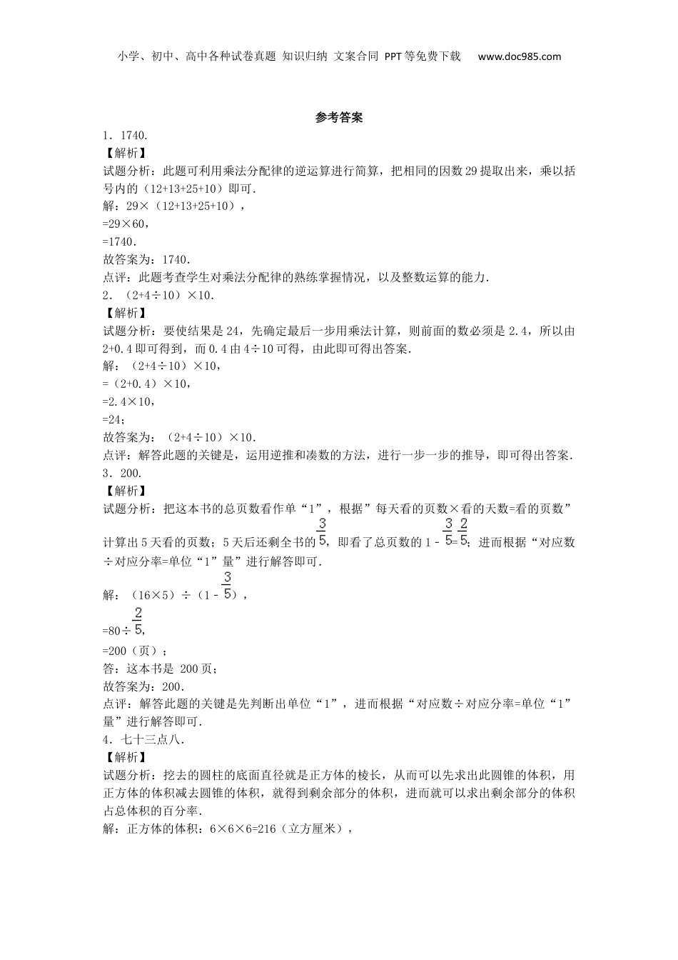 小学、初中、高中各种试卷真题知识归纳文案合同PPT等免费下载www.doc985.com人教新课标小升初数学模拟试卷(10)1.(3分)(2012•郑州模拟)29×12+29×13+29×25+29×10=.2.(3分)(2014•通川区模拟)2,4,10,10四个数,用四则运算来组成一个算式,使结果等于24..3.(3分)(2012•郑州模拟)小华看一本书,每天看16页,5天后还剩全书的没看这本书是页.4.(3分)(2012•郑州模拟)如图所示为一个棱长6厘米的正方体,从正方体的底面向内挖去一个最大的圆锥体,则剩下的体积是原正方体的百分之(保留一位小数).5.(3分)(2014•成都模拟)某校五年级(共3个班)的学生排队,每排3人、5人或7人,最后一排都只有2人.这个学校五年级有名学生.6.(3分)(2012•郑州模拟)掷两粒骰子,出现点数和为7、为8的可能性大的是.7.(3分)(2012•郑州模拟)老妇提篮卖蛋.第一次卖了全部的一半又半个,第二次卖了余下的一半又半个,第三次卖了第二次余下的一半又半个,第四次卖了第三次余下的一半又半个.这时,全部鸡蛋都卖完了.老妇篮中原有鸡蛋个.8.(3分)(2012•郑州模拟)一组自行车运动员在一条不宽的道路上作赛前训练,他们以每小时35千米的速度向前行驶.突然运动员甲离开小组,以每小时45千米的速度向前行驶10千米,然后转回来,以同样的速度行驶,重新和小组汇合,运动员甲从离开小组到重新和小组汇合这段时间是.9.(3分)(2014•成都模拟)一对成熟的兔子每月繁殖一对小兔子,而每对小兔子一个月后就变成一对成熟的兔子.那么,从一对刚出生的兔子开始,一年后可变成对兔子.10.(3分)(2012•郑州模拟)有一个10级的楼梯,某人每次能登上1级或2级,现在他要从地面登上第10级,有种不同的方式.11.(2012•郑州模拟)甲、乙二人步行的速度相等,骑自行车的速度也相等,他们都要由A处到B处.甲计划骑自行车和步行所经过的路程相等;乙计划骑自行车和步行的时间相等.谁先到达目的地?12.(2012•郑州模拟)第一个木箱里有303只螺帽,第二个木箱里的螺帽是全部螺帽的,第三口木箱里的螺帽占全部螺帽的(n是整数)问:三口木箱中的螺帽共有多少个?13.(2014•通川区模拟)某商店同时出售两件商品,售价都是600元,一件是正品,小学、初中、高中各种试卷真题知识归纳文案合同PPT等免费下载www.doc985.com可赚20%;另一件是处理品,要赔20%,以这两件商品而言,是赚,还是赔?14.(2012•郑州模拟)有一路电车起点站和终点站分别是甲站和乙站.每隔5分钟有一辆电车从甲站出发开往乙站,全程要走15分钟.有一个人从乙站出发沿电车路线骑车前往甲站.他出发时,恰有一辆电车到达乙站.在路上遇到了10辆迎面开来的电车.当到达甲站时,恰又有一辆电车从甲站开出,问他从乙站到甲站用了多少分钟?小学、初中、高中各种试卷真题知识归纳文案合同PPT等免费下载www.doc985.com参考答案1.1740.【解析】试题分析:此题可利用乘法分配律的逆运算进行简算,把相同的因数29提取出来,乘以括号内的(12+13+25+10)即可.解:29×(12+13+25+10),=29×60,=1740.故答案为:1740.点评:此题考查学生对乘法分配律的熟练掌握情况,以及整数运算的能力.2.(2+4÷10)×10.【解析】试题分析:要使结果是24,先确定最后一步用乘法计算,则前面的数必须是2.4,所以由2+0.4即可得到,而0.4由4÷10可得,由此即可得出答案.解:(2+4÷10)×10,=(2+0.4)×10,=2.4×10,=24;故答案为:(2+4÷10)×10.点评:解答此题的关键是,运用逆推和凑数的方法,进行一步一步的推导,即可得出答案.3.200.【解析】试题分析:把这本书的总页数看作单“1”,根据”每天看的页数×看的天数=看的页数”计算出5天看的页数;5天后还剩全书的,即看了总页数的1﹣=;进而根据“对应数÷对应分率=单位“1”量”进行解答即可.解:(16×5)÷(1﹣),=80÷,=200(页);答:这本书是200页;故答案为:200.点评:解答此题的关键是先判断出单位“1”,进而根据“对应数÷对应分率=单位“1”量”进行解答即可.4.七十三点八.【解析】试题分析:挖去的圆柱的底面直径就是正方...