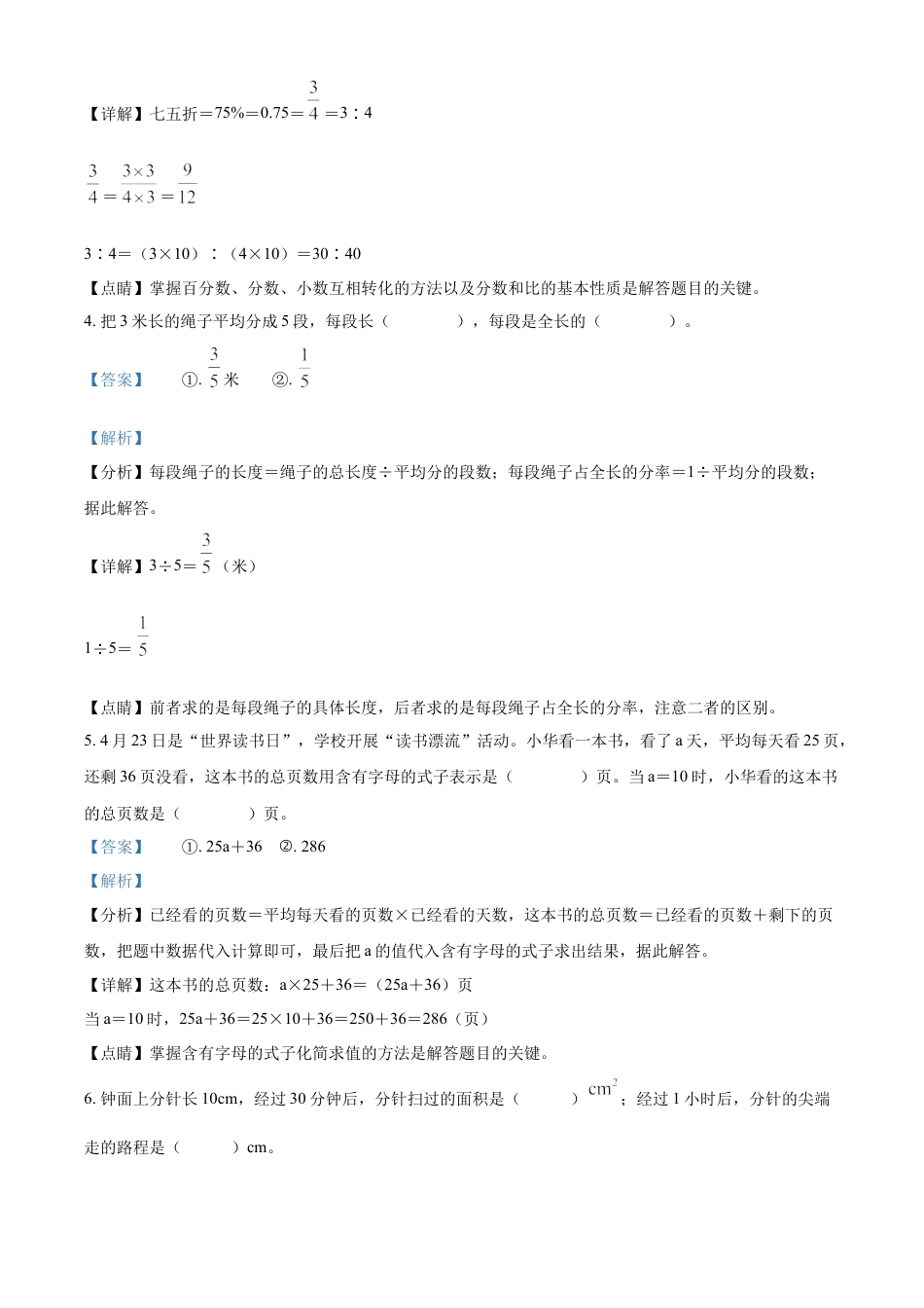 2022年上学期六年级期末质量检测试卷数学一、细心读题,谨慎填写。(每空1分,共20分)1.地球上海洋的面积大约是361000000平方千米,这个数读作()平方千米,省略亿位后面的尾数约是()平方千米。【答案】①.三亿六千一百万②.4亿【解析】【分析】根据整数的读法,从高位到低位,一级一级地读,每一级末尾的0都不读出来,其余数位连续几个0都只读一个零,即可读出此数;省略“亿”后面的尾数就是四舍五入到亿位,把亿位后的千万位上的数进行四舍五入,再在数的后面写上“亿”字。【详解】361000000平方千米读作三亿六千一百万平方千米,省略亿位后面的尾数约是4亿平方千米。【点睛】本题主要考查整数的读法和求近似数,注意求近似数时要带计数单位。2.海平面的海拔高度为0,规定高于海平面为正,低于海平面为负。世界上海拔最高的湖——纳木错,湖面高于海平面4718米,记作()米;世界上海拔最低的湖——死海,湖面低于海平面430米,记作()米。【答案】①.##4718.②【解析】【分析】纳木错湖面高于海平面4718米,记作正数,死海湖面低于海平面430米,记作负,正数可带正好,也可不带,据此解答即可。【详解】世界上海拔最高的湖——纳木错,湖面高于海平面4718米,记作+4718或4718米;世界上海拔最低的湖——死海,湖面低于海平面430米,记作−430米。【点睛】本题考查正负数,解答本题的关键是掌握正负数的概念。3.=30∶()=()%=七五折=()(填小数)。【答案】9;40;75;0.75【解析】【分析】七五折用百分数表示为75%,75%用小数表示为0.75,再把小数化为最简分数并利用分数的基本性质求出分子,最后根据分数与比的关系利用比的基本性质求出比的后项,据此解答。【详解】七五折=75%=0.75==3∶4==3∶4=(3×10)∶(4×10)=30∶40【点睛】掌握百分数、分数、小数互相转化的方法以及分数和比的基本性质是解答题目的关键。4.把3米长的绳子平均分成5段,每段长(),每段是全长的()。【答案】①.米②.【解析】【分析】每段绳子的长度=绳子的总长度÷平均分的段数;每段绳子占全长的分率=1÷平均分的段数;据此解答。【详解】3÷5=(米)1÷5=【点睛】前者求的是每段绳子的具体长度,后者求的是每段绳子占全长的分率,注意二者的区别。5.4月23日是“世界读书日”,学校开展“读书漂流”活动。小华看一本书,看了a天,平均每天看25页,还剩36页没看,这本书的总页数用含有字母的式子表示是()页。当a=10时,小华看的这本书的总页数是()页。【答案】①.25a+36.②286【解析】【分析】已经看的页数=平均每天看的页数×已经看的天数,这本书的总页数=已经看的页数+剩下的页数,把题中数据代入计算即可,最后把a的值代入含有字母的式子求出结果,据此解答。【详解】这本书的总页数:a×25+36=(25a+36)页当a=10时,25a+36=25×10+36=250+36=286(页)【点睛】掌握含有字母的式子化简求值的方法是解答题目的关键。6.钟面上分针长10cm,经过30分钟后,分针扫过的面积是();经过1小时后,分针的尖端走的路程是()cm。【答案】①.157.②62.8【解析】【分析】经过30分钟后,分针扫过的面积是半径为10cm的圆的面积的一半;经过1小时后,分针的尖端走的路程是半径为10cm的圆的周长,据此解答即可。【详解】(cm2)2×3.14×10=6.28×10=62.8(cm)【点睛】本题考查圆的周长和面积,解答本题的关键是掌握圆的周长和面积计算公式。7.2021年5月,王阿姨把5000元钱存入银行,存期为2年,年利率为2.75%,到期时王阿姨一共能取回()元。【答案】5275【解析】【分析】利息=本金×利率×存期,利息加上本金就是取回的钱。【详解】(元)【点睛】本题考查利率问题,解答本题的关键是掌握利息的计算公式。8.把一根长为72cm的铁丝做成一个长方体框架,长、宽、高的比是3∶2∶1,这个长方体的表面积是()。【答案】198【解析】【分析】长方体的棱长和=(长+宽+高)×4,据此求出长宽高的和,再根据长、宽、高的比是3∶2∶1,求出长、宽、高的长度,再求出长方体的表面积即可。【详解】72÷4÷(3+2+1)=18÷6=3(cm)长:3×3=9(cm)宽:3×2=6...