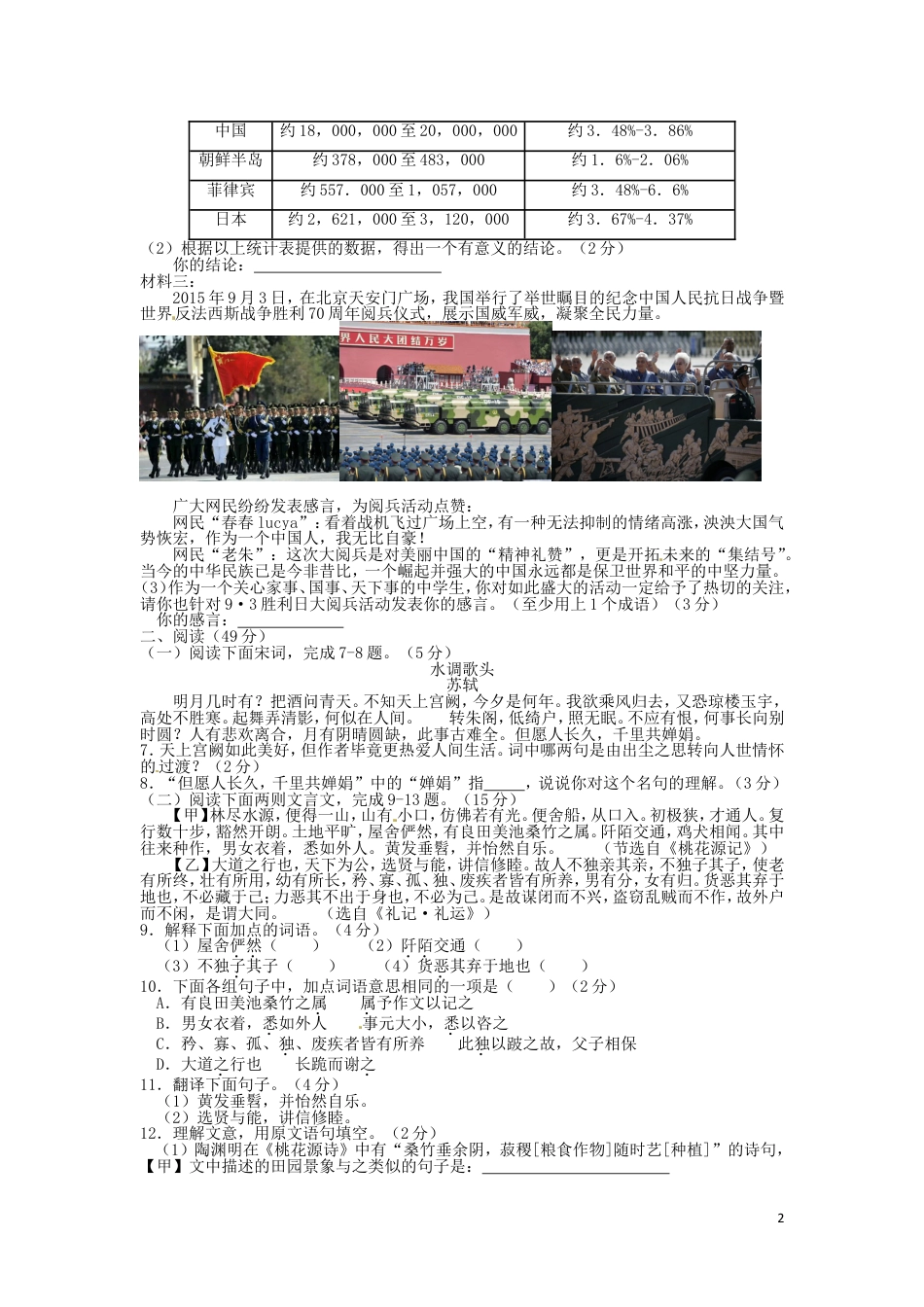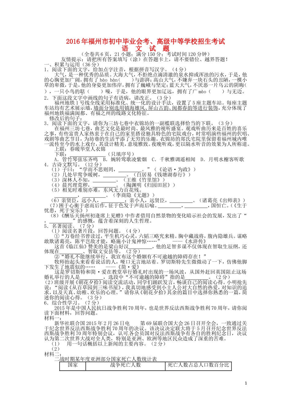 2016年福州市初中毕业会考、高级中等学校招生考试语文试题(全卷共6页,21小题;满分150分;考试时间120分钟)友情提示:请把所有答案填写(涂)在答题卡上,请不要错位、越界答题!一、积累与运用(36分)1.阅读下面的文字,给加点字注音,根据拼音写汉字。(4分)大气,是一种优秀的品质。大海大气,不拒绝点滴清澈的泉水抑或浑浊的污水,于是,他的心胸更加广阔,拥有了hàohàn()与澎湃;高山大气,不嫌弃一块石头的丑陋,一棵小草的卑微,于是,他的身姿更加伟岸,拥有了巍峨与坚定;蓝天大气,不厌恶一片乌云的阴晦(),一只小鸟的聒()噪,于是,他的眼界更加辽远,拥有了广mào()与无边。2.下面这段文字中画线的句子有语病,请改正。(3分)福州地铁1号线全线采用标准化、统一化的设计手法,设置了5座主题车站。每座主题车站均有艺术展示墙,墙面分别选用镇海雄风、屏山古韵、闽都春韵等进行装饰,充分体现了福州地铁福满闽都、有福之州的线路文化特征。修改后的句子:3.阅读下面的文字,请你为三坊七巷中衣锦坊的一副槛联选择恰当的下联。(3分)在福州三坊七巷,曲艺文化是最时尚、最风雅的视听盛宴。观戏听曲历来是百姓的喜乐之事,有些富贵人家热衷于在自己的家里搭设独具特色的宅院戏台,时常唱演些福州的伬唱、戏剧等曲艺节目,为坊巷的生活平添了无穷的乐趣。衣锦坊的郑氏宅院里保留着福州城内唯一流传至今的水上戏台,其设计精美,意境雅致。夜晚听戏,更以隔水听音的效果为人所称道。上联:春暖华堂人衣锦下联:(只填序号)A.管竹琴弦乐齐鸣B.婉转莺歌凌紫烟C.千秋雅调遥相闻D.月明水榭客听歌4.古诗文默写。(12分)(1)子曰:“学而不思则罔,。”(《论语·为政》)(2)几处早莺争暖树,。(白居易《钱塘湖春行》)(3)深林人不知,。(王维《竹里馆》)(4)晨兴理荒秽,。(陶渊明《归园田居》)(5)相见时难别亦难,东风无力百花残。,。(李商隐《无题》)(6)亲贤臣,远小人,;亲小人,远贤臣,。(诸葛亮《出师表》)(7)困于心衡于虑而后作,征于色发于声而后喻。,,国恒亡。(《生于忧患,死于安乐》)(8)《酬乐天扬州初逢席上见赠》中作者借用自然景物的变化暗示社会的发展,发出了“,”的感慨,蕴含着深刻的人生哲理。5.名著阅读。(7分)(1)阅读名著片段,回答问题。(4分)①“万卷经书曾读过,平生机巧心灵,六韬三略究来精。胸中藏战将,腹内隐雄兵。谋略敢欺诸葛亮,陈平岂敌才能,略施小计鬼神惊……”——《水浒传》这首《临江仙》赞美的是梁山好汉,他的足智多谋不仅体现在智取生辰纲,还体现在、智取文安县等。(2分)②“婚礼不能继续举行,我宣布这个婚姻有不可逾越的障碍存在!”牧师抬起头来看看说话的人,哑口无言地站着。罗切斯特先生微微动了一下,仿佛他脚下发生了地震似的……——《简·爱》这是罗切斯特和简·爱在教堂举行婚礼时出现的一场风波,从国外赶回英国阻止这场婚礼举行的人是,选段中“不可逾越的障碍”指的是。(2分)(2)班级开展《朝花夕拾》阅读交流活动,同学们踊跃发言,畅谈自己的阅读心得。小明抢先说:“阅读《从百草园到三味书屋》,我真切地感受到小主人公对大自然的热爱,对知识的追求,以及天真、幼稚、欢乐的心理。”请你从《朝花夕拾》其余的篇目中选择你熟悉的一篇,简述你的阅读心得。(3分)6.综合性学习。(7分)2015年是中国人民抗日战争胜利70周年,也是世界反法西斯战争胜利70周年,请你阅读下面材料,回答问题。材料一:新华社联合国2015年2月26日电第69届联合国大会26日召开全会,一致通过关于纪念世界反法西斯战争胜利70周年的决议。该决议决定联大将于5月召开纪念世界反法西斯战争胜利70周年特别会议,认可各会员国对反法西斯战争有各自的胜利纪念日,决议认为第二次世界大战对全人类,特别是亚洲、欧洲等地区民众造成了深重的苦难。(1)用一句话概括以上新闻的主要内容。(2分)(2)材料二:二战时期某年度亚洲部分国家死亡人数统计表国家战争死亡人数死亡人数占总人口数百分比1中国约18,000,000至20,000,000约3.48%-3.86%朝鲜半岛约378,000至483,...