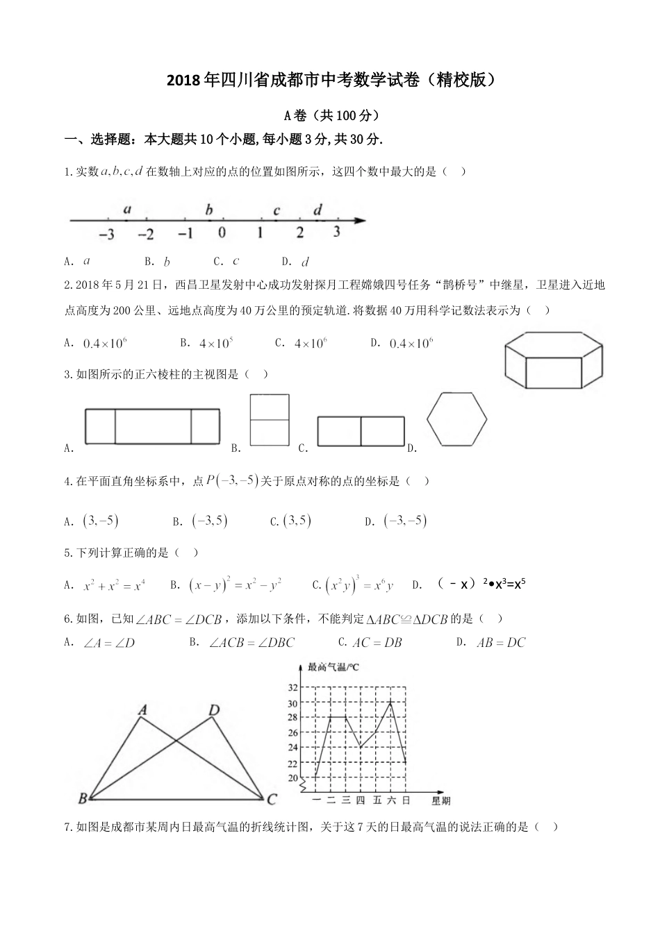 2018年四川省成都市中考数学试卷(精校版)A卷(共100分)一、选择题:本大题共10个小题,每小题3分,共30分.1.实数在数轴上对应的点的位置如图所示,这四个数中最大的是()A.B.C.D.2.2018年5月21日,西昌卫星发射中心成功发射探月工程嫦娥四号任务“鹊桥号”中继星,卫星进入近地点高度为200公里、远地点高度为40万公里的预定轨道.将数据40万用科学记数法表示为()A.B.C.D.3.如图所示的正六棱柱的主视图是()A.B.C.D.4.在平面直角坐标系中,点关于原点对称的点的坐标是()A.B.C.D.5.下列计算正确的是()A.B.C.D.(﹣x)2•x3=x56.如图,已知,添加以下条件,不能判定的是()A.B.C.D.7.如图是成都市某周内日最高气温的折线统计图,关于这7天的日最高气温的说法正确的是()A.极差是8℃B.众数是28℃C.中位数是24℃D.平均数是26℃8.分式方程的解是()A.B.C.D.9.如图,在中,,的半径为3,则图中阴影部分的面积是()A.B.C.D.10.关于二次函数,下列说法正确的是()A.图像与轴的交点坐标为B.图像的对称轴在轴的右侧C.当时,的值随值的增大而减小D.的最小值为-3二、填空题(每题4分,满分16分,将答案填在答题纸上)11.等腰三角形的一个底角为,则它的顶角的度数为.12.在一个不透明的盒子中,装有除颜色外完全相同的乒乓球共16个,从中随机摸出一个乒乓球,若摸到黄色乒乓球的概率为,则该盒子中装有黄色兵乓球的个数是.13.已知,且,则的值为.14.如图,在矩形中,按以下步骤作图:①分别以点和为圆心,以大于的长为半径作弧,两弧相交于点和;②作直线交于点.若,,则矩形的对角线的长为.三、解答题(本大题共6小题,共54分.)15.(1).(2)化简.16.若关于的一元二次方程有两个不相等的实数根,求的取值范围.17.为了给游客提供更好的服务,某景区随机对部分游客进行了关于“景区服务工作满意度”的调查,并根据调查结果绘制成如下不完整的统计图表.根据图标信息,解答下列问题:(1)本次调查的总人数为,表中的值;(2)请补全条形统计图;(3)据统计,该景区平均每天接待游客约3600人,若将“非常满意”和“满意”作为游客对景区服务工作的肯定,请你估计该景区服务工作平均每天得到多少名游客的肯定.18.由我国完全自主设计、自主建造的首舰国产航母于2018年5月成功完成第一次海上试验任务.如图,航母由西向东航行,到达处时,测得小岛位于它的北偏东方向,且于航母相距80海里,再航行一段时间后到达处,测得小岛位于它的北偏东方向.如果航母继续航行至小岛的正南方向的处,求还需航行的距离的长.(参考数据:,,,,,)19.如图,在平面直角坐标系中,一次函数的图象经过点,与反比例函数的图象交于.(1)求一次函数和反比例函数的表达式;(2)设是直线上一点,过作轴,交反比例函数的图象于点,若为顶点的四边形为平行四边形,求点的坐标.20.如图,在中,,平分交于点,为上一点,经过点,的分别交,于点,,连接交AD于点.(1)求证:是的切线;(2)设,,试用含的代数式表示线段的长;(3)若,,求的长.B卷(共50分)一、填空题(每题4分,满分20分,将答案填在答题纸上)21.已知,,则代数式的值为.22.汉代数学家赵爽在注解《周髀算经》时给出的“赵爽弦图”是我国古代数学的瑰宝.如图所示的弦图中,四个直角三角形都是全等的,它们的两直角边之比均为,现随机向该图形内掷一枚小针,则针尖落在阴影区域的概率为.23.已知,,,,,,…(即当为大于1的奇数时,;当为大于1的偶数时,),按此规律,.24.如图,在菱形中,,分别在边上,将四边形沿翻折,使的对应线段经过顶点,当时,的值为.25.设双曲线与直线交于,两点(点在第三象限),将双曲线在第一象限的一支沿射线的方向平移,使其经过点,将双曲线在第三象限的一支沿射线的方向平移,使其经过点,平移后的两条曲线相交于点,两点,此时我称平移后的两条曲线所围部分(如图中阴影部分)为双曲线的“眸”,为双曲线的“眸径”当双曲线的眸径为6时,的值为.二、解答题(本大题共3小题,共30分.解答应写出文字说明、证明过程或演算步骤.)26.为了美化环境,建设宜居成都,我...