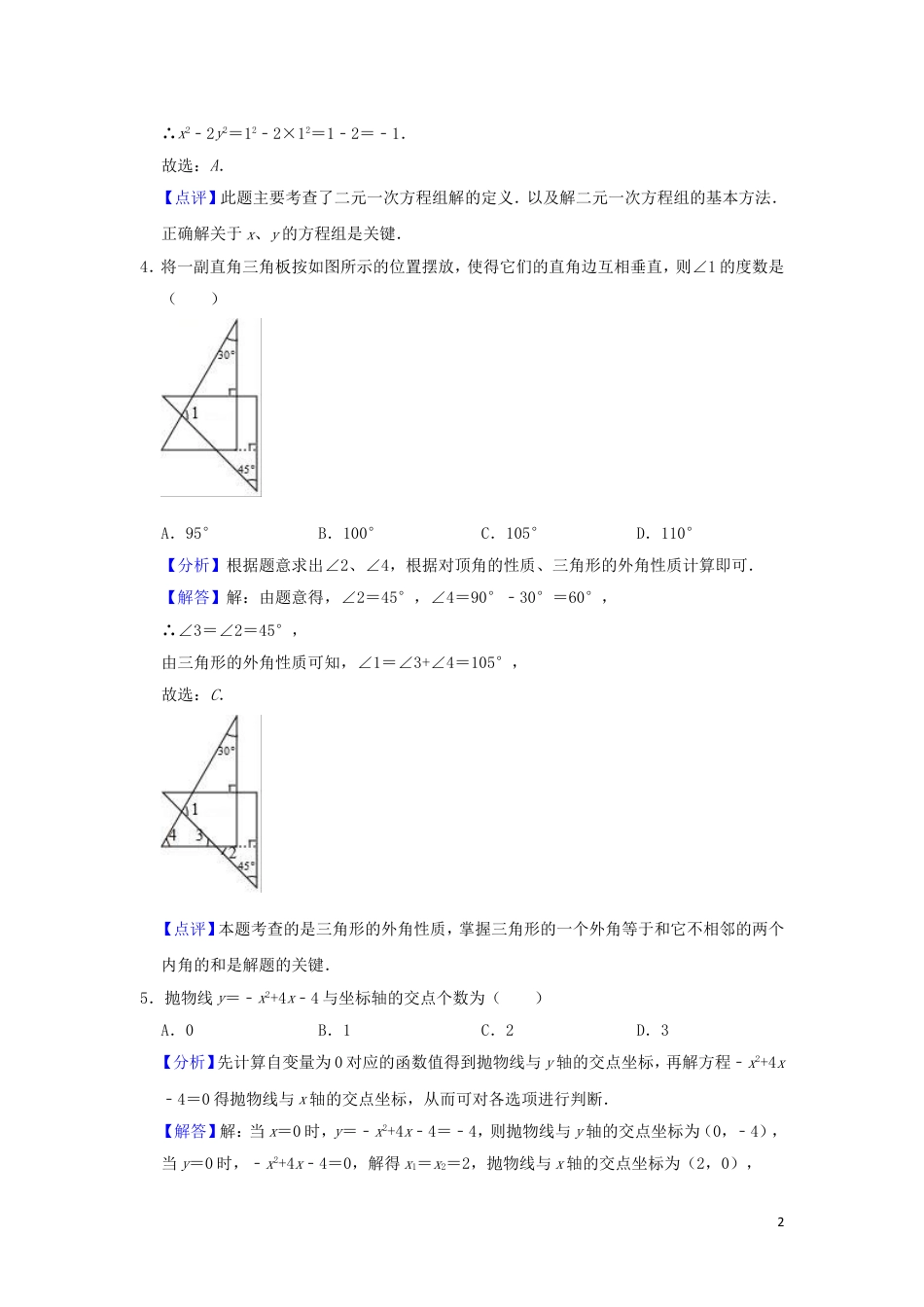 2019年湖北省荆门市中考数学试卷一、选择题:本题共12小题,每小题3分,共36分.在每小题给出的四个选项中,只有项是符合题目要求的1.﹣的倒数的平方是()A.2B.C.﹣2D.﹣【分析】根据倒数,平方的定义以及二次根式的性质化简即可.【解答】解:﹣的倒数的平方为:.故选:B.【点评】本题考查了倒数的定义、平方的定义以及二次根式的性质,是基础题,熟记概念是解题的关键2.已知一天有86400秒,一年按365天计算共有31536000秒,用科学记数法表示31536000正确的是()A.3.1536×106B.3.1536×107C.31.536×106D.0.31536×108【分析】科学记数法的表示形式为a×10n的形式,其中1≤|a|<10,n为整数.确定n的值时,要看把原数变成a时,小数点移动了多少位,n的绝对值与小数点移动的位数相同.当原数绝对值>1时,n是正数;当原数的绝对值<1时,n是负数.【解答】解:将31536000用科学记数法表示为3.1536×107.故选:B.【点评】此题考查科学记数法的表示方法.科学记数法的表示形式为a×10n的形式,其中1≤|a|<10,n为整数,表示时关键要正确确定a的值以及n的值.3.已知实数x,y满足方程组则x2﹣2y2的值为()A.﹣1B.1C.3D.﹣3【分析】首先解方程组,求出x、y的值,然后代入所求代数式即可.【解答】解:,①+②×2,得5x=5,解得x=1,把x=1代入②得,1+y=2,解得y=1,1∴x2﹣2y2=12﹣2×12=1﹣2=﹣1.故选:A.【点评】此题主要考查了二元一次方程组解的定义.以及解二元一次方程组的基本方法.正确解关于x、y的方程组是关键.4.将一副直角三角板按如图所示的位置摆放,使得它们的直角边互相垂直,则∠1的度数是()A.95°B.100°C.105°D.110°【分析】根据题意求出∠2、∠4,根据对顶角的性质、三角形的外角性质计算即可.【解答】解:由题意得,∠2=45°,∠4=90°﹣30°=60°,∴∠3=∠2=45°,由三角形的外角性质可知,∠1=∠3+∠4=105°,故选:C.【点评】本题考查的是三角形的外角性质,掌握三角形的一个外角等于和它不相邻的两个内角的和是解题的关键.5.抛物线y=﹣x2+4x﹣4与坐标轴的交点个数为()A.0B.1C.2D.3【分析】先计算自变量为0对应的函数值得到抛物线与y轴的交点坐标,再解方程﹣x2+4x﹣4=0得抛物线与x轴的交点坐标,从而可对各选项进行判断.【解答】解:当x=0时,y=﹣x2+4x﹣4=﹣4,则抛物线与y轴的交点坐标为(0,﹣4),当y=0时,﹣x2+4x﹣4=0,解得x1=x2=2,抛物线与x轴的交点坐标为(2,0),2所以抛物线与坐标轴有2个交点.故选:C.【点评】本题考查了抛物线与x轴的交点:把求二次函数y=ax2+bx+c(a,b,c是常数,a≠0)与x轴的交点坐标问题转化为解关于x的一元二次方程.6.不等式组的解集为()A.﹣<x<0B.﹣<x≤0C.﹣≤x<0D.﹣≤x≤0【分析】首先解每个不等式,两个不等式的解集的公共部分就是不等式组的解集.【解答】解:,解①得:x≥﹣,解②得x<0,则不等式组的解集为﹣≤x<0.故选:C.【点评】本题考查了解一元一次不等式组,根据大大取大,小小取小,比大的小比小的大取中间,比大的大比小的小无解的原则,7.投掷一枚质地均匀的骰子两次,向上一面的点数依次记为a,b.那么方程x2+ax+b=0有解的概率是()A.B.C.D.【分析】画树状图展示所有36种等可能的结果数,再找出使a2﹣4b≥0,即a2≥4b的结果数,然后根据概率公式求解.【解答】解:画树状图为:共有36种等可能的结果数,其中使a2﹣4b≥0,即a2≥4b的有19种,3∴方程x2+ax+b=0有解的概率是,故选:D.【点评】本题考查了列表法与树状图法:通过列表法或树状图法展示所有等可能的结果求出n,再从中选出符合事件A或B的结果数目m,然后根据概率公式求出事件A或B的概率.8.欣欣服装店某天用相同的价格a(a>0)卖出了两件服装,其中一件盈利20%,另一件亏损20%,那么该服装店卖出这两件服装的盈利情况是()A.盈利B.亏损C.不盈不亏D.与售价a有关【分析】设第一件衣服的进价为x元,依题意得:x(1+20%)=a,设第二件衣服的进价为y元,依题意得:y(1﹣20%)=a,得出x(1+20%)=y(1﹣20%),整理得:3x=2y,则...