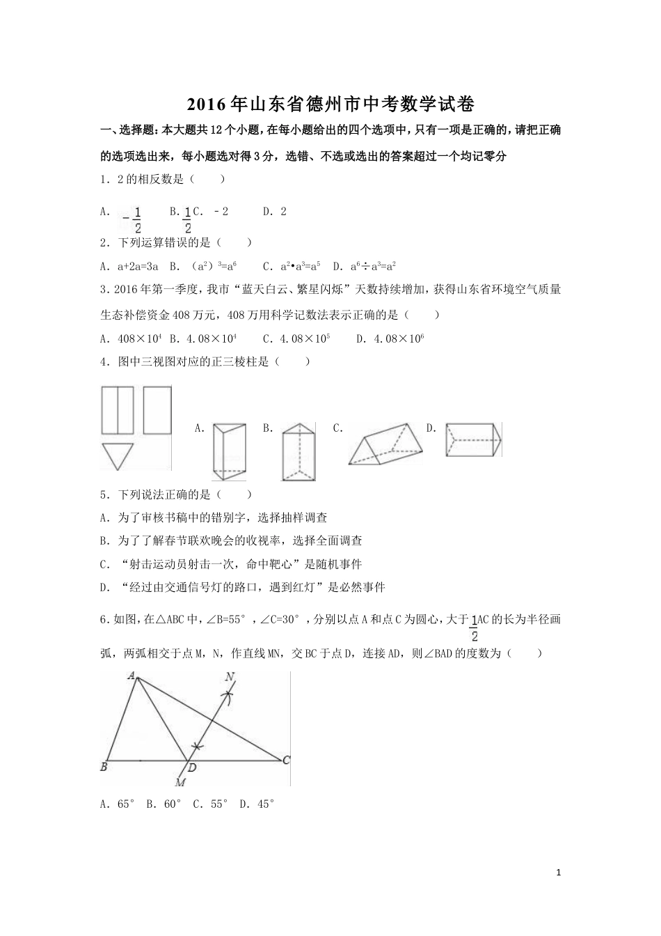 2016年山东省德州市中考数学试卷一、选择题:本大题共12个小题,在每小题给出的四个选项中,只有一项是正确的,请把正确的选项选出来,每小题选对得3分,选错、不选或选出的答案超过一个均记零分1.2的相反数是()A.B.C.﹣2D.22.下列运算错误的是()A.a+2a=3aB.(a2)3=a6C.a2•a3=a5D.a6÷a3=a23.2016年第一季度,我市“蓝天白云、繁星闪烁”天数持续增加,获得山东省环境空气质量生态补偿资金408万元,408万用科学记数法表示正确的是()A.408×104B.4.08×104C.4.08×105D.4.08×1064.图中三视图对应的正三棱柱是()A.B.C.D.5.下列说法正确的是()A.为了审核书稿中的错别字,选择抽样调查B.为了了解春节联欢晚会的收视率,选择全面调查C.“射击运动员射击一次,命中靶心”是随机事件D.“经过由交通信号灯的路口,遇到红灯”是必然事件6.如图,在△ABC中,∠B=55°,∠C=30°,分别以点A和点C为圆心,大于AC的长为半径画弧,两弧相交于点M,N,作直线MN,交BC于点D,连接AD,则∠BAD的度数为()A.65°B.60°C.55°D.45°17.化简﹣等于()A.B.C.﹣D.﹣8.某校为了解全校同学五一假期参加社团活动的情况,抽查了100名同学,统计它们假期参加社团活动的时间,绘成频数分布直方图(如图),则参加社团活动时间的中位数所在的范围是()A.4﹣6小时B.6﹣8小时C.8﹣10小时D.不能确定9.对于平面图形上的任意两点P,Q,如果经过某种变换得到新图形上的对应点P′,Q′,保持PQ=P′Q′,我们把这种变换称为“等距变换”,下列变换中不一定是等距变换的是()A.平移B.旋转C.轴对称D.位似10.下列函数中,满足y的值随x的值增大而增大的是()A.y=﹣2xB.y=3x﹣1C.y=D.y=x211.《九章算术》是我国古代内容极为丰富的数学名著,书中有下列问题“今有勾八步,股十五步,问勾中容圆径几何?”其意思是:“今有直角三角形,勾(短直角边)长为8步,股(长直角边)长为15步,问该直角三角形能容纳的圆形(内切圆)直径是多少?”()A.3步B.5步C.6步D.8步12.在矩形ABCD中,AD=2AB=4,E是AD的中点,一块足够大的三角板的直角顶点与点E重合,将三角板绕点E旋转,三角板的两直角边分别交AB,BC(或它们的延长线)于点M,N,设∠AEM=α(0°<α<90°),给出下列四个结论:①AM=CN;2②∠AME=∠BNE;③BN﹣AM=2;④S△EMN=.上述结论中正确的个数是()A.1B.2C.3D.4二、填空题:本大题共5小题,共20分,只要求填写最后结果,每小题填对得4分13.化简的结果是.14.正六边形的每个外角是度.15.方程2x2﹣3x﹣1=0的两根为x1,x2,则x12+x22=.16.如图,半径为1的半圆形纸片,按如图方式折叠,使对折后半圆弧的中点M与圆心O重合,则图中阴影部分的面积是.17.如图,在平面直角坐标系中,函数y=2x和y=﹣x的图象分别为直线l1,l2,过点(1,0)作x轴的垂线交l2于点A1,过点A1作y轴的垂线交l2于点A2,过点A2作x轴的垂线交l2于点A3,过点A3作y轴的垂线交l2于点A4,…依次进行下去,则点A2017的坐标为.3三、解答题:本大题共7小题,共64分,解答要写出必要的文字说明、证明过程或演算步骤18.解不等式组:.19.在甲、乙两名同学中选拔一人参加“中华好诗词”大赛,在相同的测试条件下,两人5次测试成绩(单位:分)如下:甲:79,86,82,85,83乙:88,79,90,81,72.回答下列问题:(1)甲成绩的平均数是,乙成绩的平均数是;(2)经计算知S甲2=6,S乙2=42.你认为选拔谁参加比赛更合适,说明理由;(3)如果从甲、乙两人5次的成绩中各随机抽取一次成绩进行分析,求抽到的两个人的成绩都大于80分的概率.20.2016年2月1日,我国在西昌卫星发射中心,用长征三号丙运载火箭成功将第5颗新一代北斗星送入预定轨道,如图,火箭从地面L处发射,当火箭达到A点时,从位于地面R处雷达站测得AR的距离是6km,仰角为42.4°;1秒后火箭到达B点,此时测得仰角为45.5°(1)求发射台与雷达站之间的距离LR;(2)求这枚火箭从A到B的平均速度是多少(结果精确到0.01)?(参考数据:son42.4°≈0.67,cos42.4°≈0.74,tan42.4°≈0.905,sin45.5°≈0.7...
