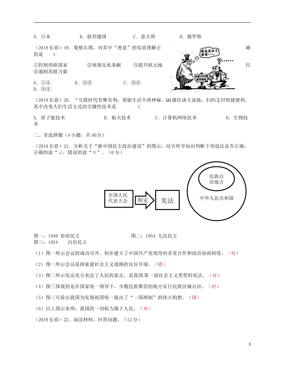 吉林省长春市2018年中考历史真题试题一、选择题(每小题1分,共20分,每小题只有一个正确选项)(2018长春)1.“清政府赔偿白银4.5亿两,以海关等税收作担保”,这项内容出自DA.《南京条约》B.《瑷珲条约C.《马关条约》D.《辛丑条约》(2018长春)2.设置纪念日是为了铭记历史,传递力量。我国的青年节是为了纪念AA.五四运动B.中共一大召开C.南昌起义D.抗日战争胜利(2018长春)3.长征中打乱了敌人追剿计划的军事行动是BA.血战湘江B.四渡赤水C.急渡金沙江D.强渡大渡河4.右图反映的是解放战争时期哪一战役CA.武昌战役B.台儿庄战役C.淮海战役D.渡江战役(2018长春)5.第一次世界大战期间,帝国主义国家忙于战争,暂时放松了对中国经济的掠夺,客观上使中国民族工业进入哪一发展阶段BA.初步萌芽B.“黄金时代”C.再度受挫D.陷入绝境(2018长春)6.使祖国大陆获得统一,各族人民实现大团结的事件是AA.西藏和平解放B.抗美援朝C.土地改革D.港澳回归(2018长春)7.社会主义的基本制度在我国初步建立的标志是BA.开国大典B.三大改造基本完成C.一五计划完成D.大庆油田建成(2018长春)8.他临终前对组织上唯一的要求是“把我运回兰考,埋在沙堆上,活着我没有治好好沙丘,死了也要看着你们把沙丘治好”,这位被称颂为“党的好干部”的人是CA.邱少云B.邓稼先C.焦裕禄D.袁隆平(2018长春)9.以下成就属于我国社会主义现代化建设新时期的有B①“神舟五号”成功发射②尼克松总统访华③中国加入世界贸易组织④第一颗原子弹爆炸成功A.①②B.①③C.②④D.③④1(2018长春)10.1953年底,我国政府同印度就两国在西藏地区的关系问题进行谈判。周恩来在接见印度代表团时,首次提出BA.独立自主的和平外交政策B.和平共处五项原则C.“求同存异”的方针D.参与、合作,促进共同繁荣(2018长春)11.右图中的古老文字形成于公元前300年左右的尼罗河流域,它曾记载了哪一文明古国的历史AA.古代埃及B.古巴比伦王国C.古代印度D.中国(2018长春)12.19世纪80年代,德国人发明了一种使用液体燃料的动力机器。它是DA.蒸汽机B.发电机C.电动机D.内燃机(2018长春)13.有首老歌中唱道:“从小就知道有个大胡子,这个外国爷爷叫马克思。很多很多的大书里,第一页的第一句都是他说的。“以下哪句话是”他说的CA.无论是巨大的星体还是微小的尘粒都逃不脱我发现的“万有引力”B.国家应由开明君主执政,资产阶級必实现自由平等C.全世界无产者联合起来,为获得自己的解放而斗争D.人类是进化而来的,我的《物种起源》必将轰动整个世界(2018长春)14.第一次世界大战爆发的标志是AA.萨拉热窝事件B.奥匈帝国向塞尔维亚宣战C.凡尔登战役D.美对德宣战(2018长春)15.凡尔赛体系确立的帝国主义統治的新秩序不包括CA.欧洲B.西亚C.太平洋地区D.非洲(2018长春)16.为防上出现盲目竞争引起的生产过剩,加强政府对资本主义工业生产的控制与调节,美国政府颁布了DA.《权利法案》B.美国1787年宪法C.《人权宣言》D.《国家工业复兴法》(2018长春)17.明确要求日本所窃据的中国领土.,如中国东北、台湾和澎湖列岛等必须归还中国的会议是A.华盛顿会议B.慕尼黑会议C.开罗会议D.雅尔塔会议D(2018长春)18.20世纪50年代中期以后的近二十年间,经济持续高速发展,成为世界第二号资本主义经济大国的是A2A.日本B.联邦德国C.意大利D.俄罗斯(2018长春)19.观察右图,对其中“善意”的实质理解正确的是A①控制西欧国家②体现无私奉献③提升欧元地位④遏制苏联力量A.①④B.②③C.②④D.③④(2018长春)20.“互联时代有弊有利,智能生活不再神秘。QQ微信谈天说地,扫码支付快捷便利。其中改变人们生活方式的关键性技术是CA.原子能技术B.航天技术C.计算机网络技术D.生物技术二、非选择题(4小题,共40分)(2018长春)21.分析关于“新中国民主政治建设”的图示,结合所学知识判断下列说法是否正确,正确的涂“√,错误的涂“×”。(6分)图一:1949协商民主图二:1954人民民主图三:1954自治民主(1)图一所示会议的成功召开,初步建立了中国共...