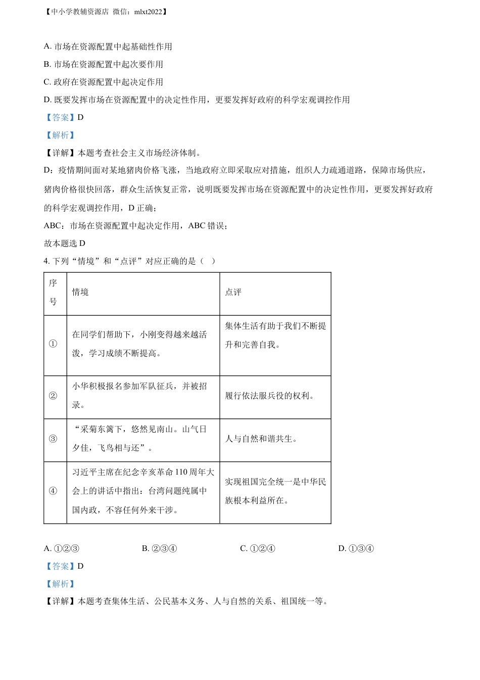 【中小学教辅资源店微信:mlxt2022】二〇二二年东营市初中学业水平考试(总分100分考试时间60分钟)注意事项:1.本试题为开卷考试试题。答卷时允许翻看课本和有关资料,但必须独立做答,不得交头接耳、相互讨论,不得相互传阅、交换资料。2.本试题分第Ⅰ卷和第Ⅱ卷两部分。第Ⅰ卷为选择题,32分;第Ⅱ卷为非选择题,68分,共6页。3.答卷前务必将自己的姓名、准考证号、座号按要求填写在试题和答题卡上的相应位置。4.第Ⅰ卷每题选出答案后,都必须用2B铅笔把答题卡上对应题目的答案标号(ABCD)涂黑,如需改动,必须先用橡皮擦干净,再改涂其它答案。5.第Ⅱ卷每题答案必须用0.5毫米黑色签字笔写到答题卡题号所指示的答题区域,不得超出预留范围,切记不要直接在试卷上答题。第Ⅰ卷(选择题共32分)一、选择题(下列各题4个选项中,只有1项符合题意。每小题4分,共32分)1.2021年10月20日至21日,习近平总书记深入东营市的______、农业高新技术产业示范区、黄河原蓄滞洪区居民迁建社区等,实地了解黄河流域生态保护和高质量发展情况,并于10月22日在山东省济南市主持召开深入推动黄河流域生态保护和高质量发展座谈会。()A.黄河入海口B.渤海垦区革命纪念馆C.东营历史博物馆D.中共刘集支部旧址纪念馆【答案】A【解析】【详解】时事题,解析略。2.2021年11月8日至11日,中国共产党第十九届中央委员会第六次全体会议在北京举行。全会审议通过了《中共中央关于______重大成就和历史经验的决议》。()A.创新与机遇B.党的若干历史C.党的百年奋斗D.全面推进乡村振兴【答案】C【解析】【详解】时事题,解析略。3.疫情期间面对某地猪肉价格飞涨,当地政府立即采取应对措施,组织人力疏通道路,保障市场供应,猪肉价格很快回落,群众生活恢复正常。这说明()【中小学教辅资源店微信:mlxt2022】A.市场在资源配置中起基础性作用B.市场在资源配置中起次要作用C.政府在资源配置中起决定作用D.既要发挥市场在资源配置中的决定性作用,更要发挥好政府的科学宏观调控作用【答案】D【解析】【详解】本题考查社会主义市场经济体制。D:疫情期间面对某地猪肉价格飞涨,当地政府立即采取应对措施,组织人力疏通道路,保障市场供应,猪肉价格很快回落,群众生活恢复正常,说明既要发挥市场在资源配置中的决定性作用,更要发挥好政府的科学宏观调控作用,D正确;ABC:市场在资源配置中起决定作用,ABC错误;故本题选D。4.下列“情境”和“点评”对应正确的是()序号情境点评①在同学们帮助下,小刚变得越来越活泼,学习成绩不断提高。集体生活有助于我们不断提升和完善自我。②小华积极报名参加军队征兵,并被招录。履行依法服兵役的权利。③“采菊东篱下,悠然见南山。山气日夕佳,飞鸟相与还”。人与自然和谐共生。④习近平主席在纪念辛亥革命110周年大会上的讲话中指出:台湾问题纯属中国内政,不容任何外来干涉。实现祖国完全统一是中华民族根本利益所在。A.①②③B.②③④C.①②④D.①③④【答案】D【解析】【详解】本题考查集体生活、公民基本义务、人与自然的关系、祖国统一等。【中小学教辅资源店微信:mlxt2022】①:小刚在同学们的帮助下发生的变化,表明集体生活有助于我们不断提升和完善自己,故①说法正确;②:小华积极报名参军,履行了依法服兵役的义务,故②说法错误;③:诗句体现了人与自然和谐的景象,故③说法正确;④:习主席的讲话,体现了实现祖国完全统一是中华民族的根本利益所在,故④说法正确;故本题选D。5.2021年10月23日,十三届全国人大常委会第三十一次会议表决通过了《中华人民共和国家庭教育促进法》。该法于2022年1月1日起正式实施。这表明()①我国实施依法治国的基本方略②法律是由国家制定或认可的③国家工作人员要依法行使权力④法律对未成年人的特殊保护,违背了“法律面前人人平等”的原则A.①③B.①②C.③④D.②③【答案】B【解析】【详解】本题考查法律的特征和依法治国。①②:依据教材知识,在全国人大上通过家庭教育促进法,表明我国实施依法治国基本方略,法律由国家制定或认可,故①②说法正确;③:国家机关工作人员依法行使权力在题文中没有体现,故排除...