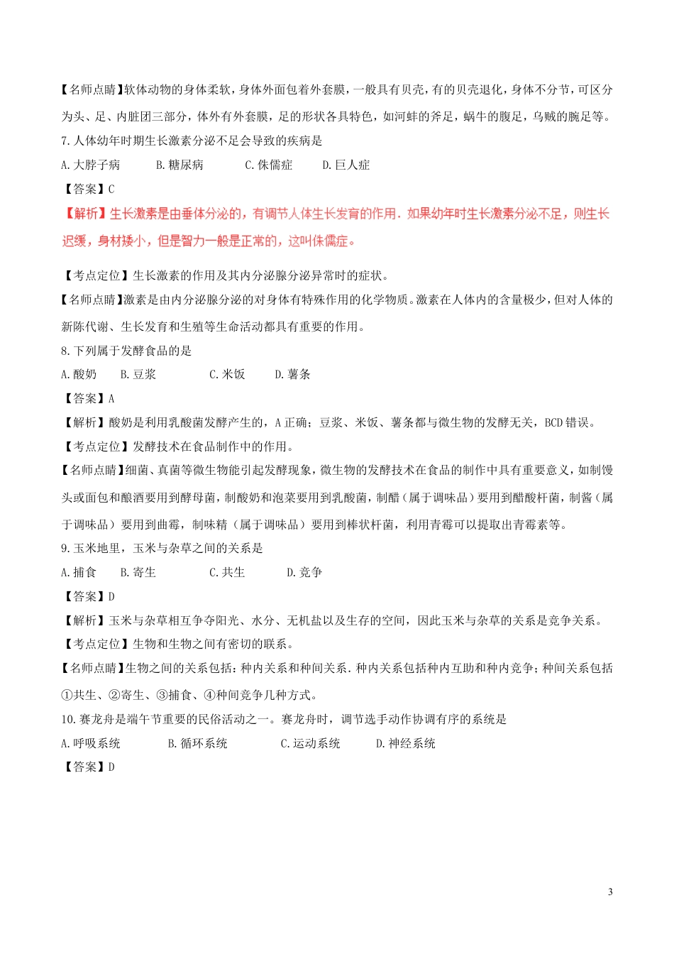 福建省2017年中考生物真题试题第I卷本卷共25小题,每小题2分,共50分。在每小题给出的四个选项中,只有一项是符合题目要求的。1.人体结构和功能的基本单位是A.细胞B.组织C.器官D.系统【答案】A【解析】动物体的细胞有细胞膜,可以保护细胞,同时控制物质的进出,使之从结构上成为一个独立的单位;细胞核内含有遗传物质;细胞质里有能量转换器--线粒体,把有机物分解并释放出能量供细胞生命活动利用,使之从功能上成为一个独立的单位.因此从细胞的结构及功能的角度来看,细胞是人体进行生命活动的基本单位。【考点定位】动物体人体的结构层次。【名师点睛】除病毒外细胞是生物体结构和功能的基本单位。2.下列不属于生态系统的是A.—片森林B.—块农田C.一群蚂蚁D.一个池塘【答案】C【考点定位】生态系统的概念。【名师点睛】一个完整的生态系统包括生物部分和非生物部分,生物部分包括生产者、消费者和分解者,非生物部分包括阳光、空气、温度和水分等。生产者主要指绿色植物,消费者包括各种动物,分解者是指营腐生生活的细菌和真菌。3.下列能正确表示食物链的是A.草→鼠→蛇→鹰B.阳光→草→鼠→鹰C.蝗虫→青蛙→蛇→鹰D.草→蝗虫→青蛙→细菌【答案】A【解析】该食物链正确表示了生产者与消费者的关系,A正确;阳光是非生物部分,而食物链不包括非生物部分,B错误;蝗虫是动物属于消费者,而食物链必须从生产者,C错误;细菌是分解者,而食物链不包括分解者,D错误。所以,能正确表示食物链的是草→鼠→蛇→鹰。【考点定位】生态系统中的食物链和食物网。1【名师点睛】食物链反映的是生产者与消费者之间吃与被吃这种关系的,所以食物链中不应该出现分解者和非生物部分。食物链的正确写法是:生产者→初级消费者→次级消费者…注意起始点是生产者。4.女性生殖系统中,精子与卵细胞结合的位置是A.卵巢B.子宫C.阴道D.输卵管【答案】D【解析】精子与卵细胞在输卵管里结合,形成一个受精卵,生命就开始了。受精卵随后,分裂为两个细胞,大约每隔12小时分裂一次。这些细胞从输卵管进入子宫后,细胞会继续分裂、分化变成胎儿.胚胎钻进子宫内膜,发育长大。【考点定位】人体女性生殖系统的结构和功能。【名师点睛】女性生殖系统主要包括卵巢、输卵管、子宫、阴道等。5.从食品安全角度考虑,正确的做法是A.随便采食野生蘑菇B.不购买过期的食品C.常吃含防腐剂的食品C.少吃发芽的马铃薯【答案】B【考点定位】关注食品安全。【名师点睛】食品安全指食品无毒、无害,符合应当有的营养要求,对人体健康不造成任何急性、亚急性或者慢性危害。6.软体动物具有A.外骨骼B.外套膜C.鳞片D.体节【答案】B【解析】软体动物一般具有贝壳,有的贝壳退化,没有外骨骼,A错误;软体动物的身体柔软,身体外面都包着外套膜,B正确;软体动物的身体外面包着外套膜,一般具有贝壳,没有鳞片,C错误;软体动物的身体柔软,身体不分节,D错误。【考点定位】软体动物的主要特征及其与人类的关系。2【名师点睛】软体动物的身体柔软,身体外面包着外套膜,一般具有贝壳,有的贝壳退化,身体不分节,可区分为头、足、内脏团三部分,体外有外套膜,足的形状各具特色,如河蚌的斧足,蜗牛的腹足,乌贼的腕足等。7.人体幼年时期生长激素分泌不足会导致的疾病是A.大脖子病B.糖尿病C.侏儒症D.巨人症【答案】C【考点定位】生长激素的作用及其内分泌腺分泌异常时的症状。【名师点睛】激素是由内分泌腺分泌的对身体有特殊作用的化学物质。激素在人体内的含量极少,但对人体的新陈代谢、生长发育和生殖等生命活动都具有重要的作用。8.下列属于发酵食品的是A.酸奶B.豆浆C.米饭D.薯条【答案】A【解析】酸奶是利用乳酸菌发酵产生的,A正确;豆浆、米饭、薯条都与微生物的发酵无关,BCD错误。【考点定位】发酵技术在食品制作中的作用。【名师点睛】细菌、真菌等微生物能引起发酵现象,微生物的发酵技术在食品的制作中具有重要意义,如制馒头或面包和酿酒要用到酵母菌,制酸奶和泡菜要用到乳酸菌,制醋(属于调味品)要用到醋酸杆菌,制酱(属于调味品)要用到曲霉,制味精(属于调味品)要用到棒状杆菌,利用青霉可以提取出青霉素等...