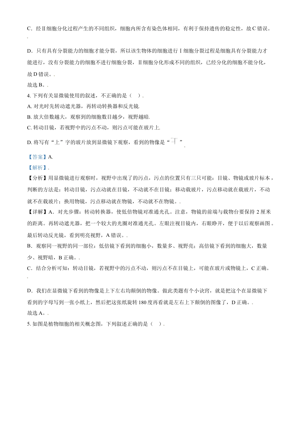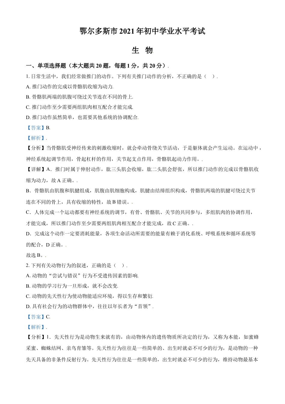 鄂尔多斯市2021年初中学业水平考试生物一、单项选择题(本大题共20题,每题1分,共20分)1.日常生活中,我们经常做推门的动作。下列有关推门动作的分析,不正确的是()A.推门动作的完成以骨骼肌收缩为动力B.骨骼肌两端的肌腹可绕过关节连在不同的骨上C.推门动作至少需要两组肌肉相互配合才能完成D.推门动作虽然简单,也需要其他系统的协调配合【答案】B【解析】【分析】当骨骼肌受神经传来的刺激收缩时,就会牵动骨绕关节活动,于是躯体就会产生运动。在运动中,神经系统起调节作用,骨起杠杆的作用,关节起支点作用,骨骼肌起动力作用。【详解】A.推门时属于伸肘动作,肱三头肌会收缩,肱二头肌会舒张,所以推门动作的完成以骨骼肌收缩为动力,故A正确。B.骨骼肌由肌腹和肌腱组成,肌腹由肌细胞构成,肌腱由结缔组织构成,骨骼肌两端的肌腱可绕过关节连在不同的骨上,具有收缩的特性,故B错误。C.人体完成一个运动都要有神经系统的调节,有骨、骨骼肌、关节的共同参与,多组肌肉的协调作用,才能完成,所以推门动作至少需要两组肌肉相互配合才能完成,故C正确。D.完成这个动作一定要消耗能量,各项生命活动所需要的能量有赖于消化系统、呼吸系统和循环系统等的配合,D正确。故选B。2.下列有关动物行为的叙述,正确的是()A.动物的“尝试与错误”行为不受遗传因素的影响B.动物的学习行为一旦形成,就不会改变C.动物的先天性行为使动物能适应环境,得以生存和繁衍D.具有社会行为的动物群体中,往往以年长者为“首领”【答案】C【解析】【分析】1.先天性行为是动物生来就有的,由动物体内的遗传物质所决定的行为,又称为本能,如蜜蜂采蜜、蜘蛛结网、亲鸟育雏等。先天性行为往往是一些简单的、出生时就必不可少的行为,是动物的一种先天具备的非条件反射行为。先天性行为往往是一些简单的,出生时就必不可少的行为,维持动物最基本生存的需要。2.学习行为是在遗传因素的基础上,通过环境因素的作用,由生活经验和学习而获得的行为,如鹦鹉学舌、海豹表演、小狗钻火圈等。【详解】A.动物的“尝试与错误”行为属于学习行为,学习行为是在遗传因素的基础上,通过环境因素的作用,由生活经验和学习而获得的行为,A错误。B.动物的学习行为可以形成,也可以发生改变,B错误。C.先天性行为是动物生来就有的,由动物体内的遗传物质所决定的行为,又称为本能。先天性行为使动物能适应环境,得以生存和繁衍,C正确。D.具有社会行为的动物群体中,往往身体最强壮的是首领而不是年长者是“首领”,D错误。故选C。3.多细胞生物体由小长大,是细胞生长、分裂和分化的结果。下图是某生物体细胞分裂和分化概念图。下列有关说法正确的是()A.细胞能够从周围环境中吸收营养物质而持续生长B.在Ⅰ过程中,细胞需要的能量主要由线粒体提供C.经Ⅱ过程产生的不同细胞,所含染色体数目不同D.该生物体的细胞都能进行Ⅰ过程和Ⅱ过程【答案】B【解析】【分析】细胞分裂使细胞数目增加,细胞分化形成不同的组织,细胞生长使细胞体积增大。【详解】A.新分裂产生的细胞体积很小,需要不断从周围环境中吸收营养物质,并且转变成组成自身的物质,体积逐渐增大,这就是细胞的生长。细胞不能无限制的生长,细胞长到一定的大小就会进行分裂,故A错误。B.在Ⅰ细胞分裂过程中,细胞需要的能量主要由线粒体提供,线粒体是呼吸作用的场所,有机物在线粒体内氧气的作用下分解为二氧化碳和水,并释放出能量,故B正确。C.经Ⅱ细胞分化过程产生的不同组织,细胞内所含有染色体相同,有利于保持遗传的稳定性,故C错误。D.只有具有分裂能力的细胞才能分裂,所以该生物体的细胞进行Ⅰ细胞分裂过程是细胞具有分裂能力才能进行,没有分裂能力的细胞不进行细胞分裂,Ⅱ细胞分化形成不同的组织,已经分化的细胞不能分化,故D错误。故选B。4.下列有关显微镜使用的叙述,不正确的是()A.对光时先转动遮光器,再转动转换器和反光镜B.放大倍数越大,观察到的细胞数目越少,视野越暗C.转动目镜,若视野中的污点不动,则污点可能在玻片上D.将写有“上”字的玻片放到显微镜下观察,看到的物像是“”【答案】A【解析】【分析】...