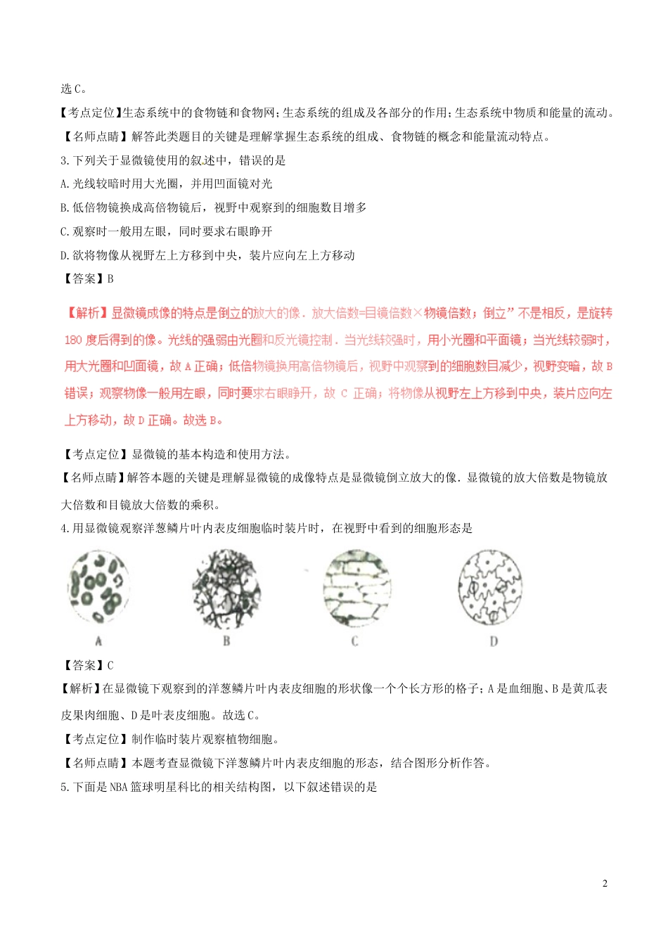 湖南省衡阳市2017年中考生物真题试题一、单项选择题(共23小题,每小题2分,共50分)1.下列生命活动中,属于生物对外界刺激作作出反应的是A.同一株碧桃上开出不同颜色的花B.斑马发现敌害迅速逃跑C.蘑菇从小长大D.雏鸡破壳而出【答案】B【考点定位】生物的特征。【名师点睛】解此题的关键是理解生物的特征。2.下图是某草原生态系统的食物网简图,据图分析,下列说法正确的是A.水稻、昆虫都属于生产者B.该图可以代表一个生态系统C.生态系统中,能量是沿着食物链和食物网流动的D.青蛙和鸟是捕食关系【答案】C【解析】一个完整的生态系统包括生物部分和非生物部分,非生物部分包括阳光、空气、水、温度等,生物部分由生产者(植物)、消费者(动物)和分解者(细菌、真菌)组成。食物链反映的是生产者与消费者之间吃与被吃的关系,所以食物链中不应该出现分解者和非生物部分.食物链的正确写法是:生产者→初级消费者→次级消费者…注意起始点是生产者。物质、能量在沿着食物链流动的过程中是逐级递减的,一般只有10%-20%的能量能够流入下一个营养级。水稻属于生产者,昆虫属于消费者,而不是都属于生产者,故A错误;图中只有生物成分,还缺少非生物成分,因此该图不可以代表一个生态系统,故B错误;生态系统中,能量是沿着食物链和食物网流动的,故C正确;青蛙和鸟都吃昆虫,因此青蛙和鸟是竞争关系而不是捕食关系,故D错误。故1选C。【考点定位】生态系统中的食物链和食物网;生态系统的组成及各部分的作用;生态系统中物质和能量的流动。【名师点睛】解答此类题目的关键是理解掌握生态系统的组成、食物链的概念和能量流动特点。3.下列关于显微镜使用的叙述中,错误的是A.光线较暗时用大光圈,并用凹面镜对光B.低倍物镜换成高倍物镜后,视野中观察到的细胞数目增多C.观察时一般用左眼,同时要求右眼睁开D.欲将物像从视野左上方移到中央,装片应向左上方移动【答案】B【考点定位】显微镜的基本构造和使用方法。【名师点睛】解答本题的关键是理解显微镜的成像特点是显微镜倒立放大的像.显微镜的放大倍数是物镜放大倍数和目镜放大倍数的乘积。4.用显微镜观察洋葱鳞片叶内表皮细胞临时装片时,在视野中看到的细胞形态是【答案】C【解析】在显微镜下观察到的洋葱鳞片叶内表皮细胞的形状像一个个长方形的格子;A是血细胞、B是黄瓜表皮果肉细胞、D是叶表皮细胞。故选C。【考点定位】制作临时装片观察植物细胞。【名师点睛】本题考查显微镜下洋葱鳞片叶内表皮细胞的形态,结合图形分析作答。5.下面是NBA篮球明星科比的相关结构图,以下叙述错误的是2A.科比的身体结构层次依次是:细胞→组织→器官→个体B.科比的肤色为黑色,控制其肤色的遗传物质主要储存在图一的结构③内C.图二的a、b、c表示细胞分裂过程,d表示细胞分化过程D.科比具有“绝杀”之技,离不开神经系统和激素的共同调节【答案】A图一中,①细胞膜、②细胞质、③细胞核,图二中,abc表示细胞分裂,d表示细胞分化。科比的身体结构层次依次是:细胞→组织→器官→系统→个体,而不是细胞→组织→器官→个体,故A错误;③细胞核是遗传信息库,因此科比的肤色为黑色,控制其肤色的遗传物质主要储存在图一的结构③内,故B正确;图中abc过程中只有细胞数目的增加,细胞的形态结构没有发生变化,因此图二的a、b、c表示细胞分裂过程;d过程中细胞的形态、结构和功能发生了变化,因此d表示细胞分化过程,故C正确;科比具有“绝杀”之技,离不开神经系统和激素的共同调节,故D正确。故选A。【考点定位】细胞分化形成组织;动物细胞的结构;细胞分裂的基本过程;动物体人体的结构层次;激素调节与神经调节的关系。【名师点睛】解答此类题目的关键是理解掌握动物体的结构层次、细胞的结构、细胞分裂、细胞分化的特点。6.下列有关绿色植物主要类群的叙述错误的是A.种子植物包括裸子植物和被子植物B.与桃树相比,松树种子外面有果皮包被C.蕨类植物有根、茎、叶的分化3D.藻类植物结构简单,没有根、茎、叶的分化【答案】B【考点定位】植物的分类。【名师点睛】回答此题的关键是明确各植物类群的特点,即可解答。7.“十月怀胎,一朝分娩”。母亲...