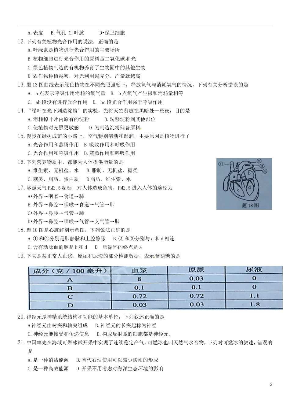 机密★启用前2017年广东省初中生学业考试生物说明:1.全卷共6页,全部为单项选择题,每小题2分,满分为100分,考试用时为50分钟。2.答题前,考生务必用黑色字迹的签字笔或钢笔在答题卡上填写自己的准考证号、姓名、考场号、座位号用2B铅笔将考场号和座位号相应号码的标号涂黑。3.每小题选出答案后,用2B铅笔把答题卡上的相应题目选项的答案信息点涂黑,如需改动,用橡皮檫干净后,再选涂其他答案,答案不能答在试题上。4.考生务必保持答题卡的清洁。考试结束后,将试卷和答题卡一并交回。1.与动物细胞相比,植物细胞特有的结构是A.细胞膜B.细胞质C.细胞核D.细胞壁2.心脏是人体血液循环的动力泵,从生物体的结构层次分析,心脏属于A.细胞B•组织C.器官D.系统3.细胞是生物体结构和功能的基本单位,对题3图的描述,正确的是A①能将光能转化为化学能B②存在于所有细胞中C③是细胞的控制中心D④为各种生命活动提供能量4.习惯用右手写字的人在使用显微镜时,限睛和目镜的相对位罝应该是5.下列不属于生命现象的是A.阿尔法狗机器人下棋B.母鸡带领小鸡吃米C葵花朵朵向太阳D婴儿听优美的音乐6.广东温暖潮湿,生物种类和数量比新疆要多,影响这一现象的非生物因素主要是A阳光B温度和水C植物D土壤和空气7.题7图是生态系统几种生物的关系图,下列说法正确的是A②③④是消费者B①②③④共同构成了生态系统C该生态系统具有自我调节能力D该图同时存在食物链和食物网8.探究“光对鼠妇生活的影响”实验,下列说法正确的是A.光照条件是实验的变量B.可以用1只鼠妇完成C.只有光影响鼠妇的生活D在一个盒子进行,不用设置对照9.下列有关玉米种子的说法,正确的是A.胚由胚芽、胚根、子叶组成B胚是玉米新植株的幼体C.就叫能使玉米种子的纵切面变蓝D.种子中的子叶发育为叶10.题10图为某花的结构示意图,对该图描述正确的是A.①②是花的主要结构B.所有的花都具有①②③④C.完成受精后③能继续发育D完成受精后④发育成果实11.叶片与外界环境之间气体交换的“门户”是1A.表皮B.气孔C.叶脉D•保卫细胞12.下列有关植物光合作用的说法,正确的是A.叶绿素是植物进行光合作用的主要场所B植物细胞进行光合作用的原料是二氧化碳和光C.绿色植物制造的有机物养育了生物圈中的其他生物D农作物种植越密,对光利用越充分,产量就越高13.题13图曲线表示绿色植物在不同光照强度下,释放氧气与消耗氧气的情况,下列有关分析错误的是A.a点表示呼吸作用消耗的氧气量B.b点氧气产生摄和消耗量相等C.ab段没有进行光合作用D.bc段光合作用强于呼吸作用14.“绿叶在光下刺造淀粉”的实验,先将天竺葵放在黑暗处—昼夜,目的是A.消耗掉叶片内原有的淀粉B.转移淀粉到其他部位C.使植物对光照更敏感D.为制造淀粉储备原料15.漫步在绿树成荫的小路上,空气特别清新和湿润,主要原因是植物进行了A.光合作用和蒸腾作用B吸收作用和呼吸作用C.光合作用和呼吸作用D.蒸腾作用和呼吸作用16.下列营养物质中,都能为人体提供能量的是A.维生素、无机盐、水B.脂肪、无机盐、糖类C.糖类、脂肪、蛋白质D脂肪、维生索、水17.雾霾天气PM2.5超标,对人体造成危害,PM2.5进入人体的途径为A•外界→咽喉→食道→肺B.外界→鼻腔→咽喉→食道→气管→肺C•外界→鼻腔→气管→肺D•外界→鼻腔→咽喉→气管→支气管→肺18.题18图是心脏解剖示意图,下列说法正确的是A.①和④分别是肺静脉和上腔静脉B.②和③分别与c和d相连C.含有动脉血的腔是b和dD肺循环的终点是a19.下表是某正常人血浆、原尿和尿液的部分检测数据,表示葡萄糖的是20.神经元是神精系统结构和功能的基本单位,下列叙述正确的是A神经元由树突和轴突组成B.神经元的长突起称为神经C.神经元能接受和传递信息D.构成反射弧的细胞都是神经元,21.中国率先在海域可燃冰试开采中实现了连续稳定产气,可燃冰也叫天然气水合物,下列对可燃冰的叙述,错误的是A.是一种消洁能源B.替代石油使用可以减少酸雨的形成C.是一种高效能源D开采不用考虑对海洋生态环境的影响222.2017年农业部联合中国奶业协会在北京启动了“中国小康牛奶行动”,牛奶为青少年提供的主要营养成分是A.维生素A和钙B.蛋白质和钙C.维生素A和糖类D.蛋白...