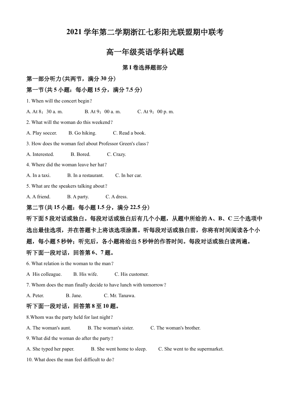 2021学年第二学期浙江七彩阳光联盟期中联考高一年级英语学科试题第I卷选择题部分第一部分听力(共两节,满分30分)第一节(共5小题:每小题15分,满分7.5分)1.Whenwilltheconcertbegin?A.At8:30a.m.B.At9:00a.m.C.At9:00p.m.2.Whatwillthewomandothisweekend?A.Playsoccer.B.Gohiking.C.Readabook.3.HowdoesthewomanfeelaboutProfessorGreen'sclass?A.Interested.B.Bored.C.Crazy.4.Wheredidthewomanleaveherhat?A.Inataxi.B.Inarestaurant.C.Inhercar.5.Whatarethespeakerstalkingabout?A.Afriend.B.Aparty.C.Adress.第二节(共15小题:每小题1.5分,满分22.5分)听下面5段对话或独白。每段对话或独白后有几个小题,从题中所给的A、B、C三个选项中选出最佳选项,并在答题卡上将该选项涂黑。听每段对话或独白前,你将有时间阅读各个小题,每小题5秒钟;听完后,各小题将给出5秒钟的作答时间。每段对话或独白读两遍。听下面一段对话,回答第6、7题。6.Whatrelationisthewomantotheman?A.Hiscolleague.B.Hiswife.C.Hiscustomer.7.Whomdoesthemanfinallydecidetohavelunchwithtomorrow?A.Peter.B.Jane.C.Mr.Tanawa.听下面一段对话,回答第8至10题。8.Whomwasthepartyheldforlastnight?A.Thewoman'saunt.B.Thewoman'ssister.C.Thewoman'sbrother.9.Whatdidthewomandoaftertheparty?A.Shetypedherpaper.B.Shewenthometosleep.C.Shewenttothesupermarket.10.Whatdoesthemanfeeldifficulttodo?A.Sleepduringtheday.B.Workwellunderstress.C.Organizeabirthdayparty.听下面一段对话,回答第11至13题。11.Whydoesthemanlooktired?A.Heoftenstaysuplate.B.Heispreparingforapromotion.C.He'sbeenunderlotsofpressureatwork.12.Howmuchdidthewomanweigh?A.150pounds.B.145pounds.C.140pounds.13.Whatdoesthewomanthinkofjogging?A.Time-consuming.B.Relaxing.C.Harmful.听下面一段对话,回答第14至16题。14Whatdoesthewomansayaboutthefirstjob?A.Thepayislow.B.Thecompanyisgrowing.C.Theworkingplaceischangeable.15Whatdothetwocompanieshaveincommon?A.Theyareverybig.B.Thesalariesarehigh.C.Theyarecomputercompanies.16Whatdoesthewomanthinkofthesecondjob?A.Itisfullofchallenge.B.Sheislikelytobepromoted.C.Itoffersherahighpositionnow.听下面一段对话,回答第17至20题。17.WhatissaidabouttheWinterFestival?A.Itisaneventforpeoplearoundthetown.B.Itisorganizedbyateamofvolunteers.C.Itwillbethethirdtimethefestivalisheld.18.Whatisspecialabouttheartexhibition?A.Itwillbeheldinaschool.B.Therearethreeopeningnights.C.Theworksarecreatedbylocalstudents.19.WhatwillbeheldintheMainExhibitionHall?A.Amusictalentshow.B.Anartexhibition.C.Afancy-dressparty.20.Whatisthepurposeofthetalk?A.Toraisemoneyforthefestival.B.Toinformpeopleofthefestival.C.Tocomparetheeventsofthefestival.第二部分阅读理解(共两节,满分35分)第一节(共10小题;每小题2.5分,满分25分)阅读下列短文,从每题所给的A、B、C和D四个选项中,选出最佳选项,并在答题纸上将该项涂黑。AFormanypeople,findinganunattendedwalletfilledwith£400incashwouldbeasourceoftemptation(诱惑).Buttheurgewouldnodoubtbegreaterifyouwerelivingonthestreetswithlittlefoodandmoney.AllofthismakestheactionsofthehomelessTomSmithevenmoreremarkable.Afterspottingawalletonthefrontseatinsideaparkedcarwithitswindowdown,hestoodguardintherainforabouttwohourswaitingfortheownertoreturn.Afterhoursinthecoldandwet,hereachedinsideandpulledthewalletouthopingtofindsomeIDsohecouldcontactthedriver,onlytofinditcontained£400innotes,withanother£50insparechangebesideit.Hethentookthewallettoanearbypolicestationafterleavinganotebehindtolettheownerknowitwassafe.Whenthecar’sownerJohnAndersonandhiscolleagueCarolLawrencereturnedtothecar,whichwasitselfworth...