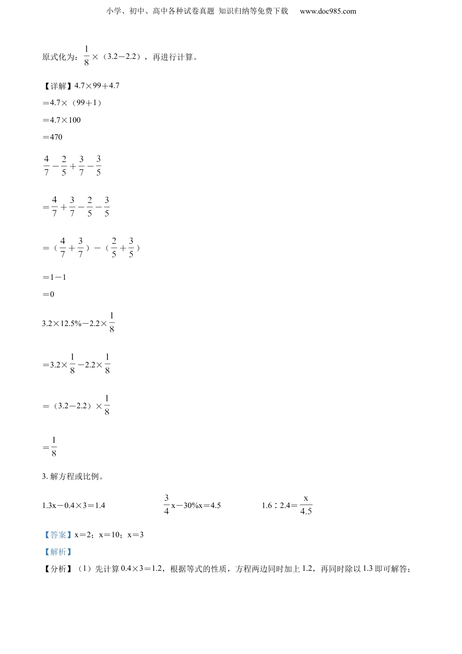 小学、初中、高中各种试卷真题知识归纳等免费下载www.doc985.com小学数学六年级下册期末检测卷一、认真审题,细心计算。(共28分)1.直接写得数。0.8+0.22=18×=9-=1.6÷1%=0.33=49×301≈+×3=(-)×24=18÷2.5÷4=1÷××=【答案】1.02;15;8;160;0.027;15000;;10;1.8;【解析】【详解】略2.计算下面各题,能简便计算的要简便计算。4.7×99+4.7-+-3.2×12.5%-2.2×【答案】470;0;【解析】【分析】4.7×99+4.7,根据乘法分配律,原式化为:4.7×(99+1),再进行计算;-+-,根据加法交换律,原始化为:+--,再根据加法结合律和减法性质,原式化为:(+)-(+),再进行计算;3.2×12.5%-2.2×,把百分数化成分数,12.5%=原式化为:3.2×-2.2×,再根据乘法分配律,小学、初中、高中各种试卷真题知识归纳等免费下载www.doc985.com原式化为:×(3.2-2.2),再进行计算。【详解】4.7×99+4.7=4.7×(99+1)=4.7×100=470-+-=+--=(+)-(+)=1-1=03.2×12.5%-2.2×=3.2×-2.2×=(3.2-2.2)×=3.解方程或比例。1.3x-0.4×3=1.4x-30%x=4.51.6∶2.4=【答案】x=2;x=10;x=3【解析】【分析】(1)先计算0.4×3=1.2,根据等式的性质,方程两边同时加上1.2,再同时除以1.3即可解答;小学、初中、高中各种试卷真题知识归纳等免费下载www.doc985.com(2)=0.75,30%=0.3,据此化简方程左边得0.45x,方程两边同时除以0.45即可解答;(3)根据比例的基本性质可得2.4x=1.6×4.5,方程两边同时除以2.4即可解出比例。【详解】1.3x-0.4×3=1.4解:1.3x-1.2=1.41.3x=1.4+1.21.3x=2.6x=2.6÷1.3x=2x-30%x=4.5解:0.75x-0.3x=4.50.45x=4.5x=4.5÷0.45x=101.6∶2.4=解:1.6∶2.4=x∶4.52.4x=1.6×4.52.4x=7.2x=7.2÷2.4x=3二、认真思考,正确填空。(每空1分,共21分)4.在“学习强国”的活动中,截止到6月1日0时,张老师的学习成长总积分在全国排名是第70895600名,这个数读作第()名,省略“万”后面的尾数大约是第()万名。【答案】①.七千零八十九万五千六百②.7090【解析】【分析】根据整数的读法,从高位到低位,一级一级地读,每一级末尾的0都不读出来,其余数位一个0或连续几个0都只读一个零,即可读出此数;省略“万”后面的尾数,看千位上的数,如果千位上的数大于等于5,则进一,小于5,则舍去,后面加个万字即可。小学、初中、高中各种试卷真题知识归纳等免费下载www.doc985.com【详解】70895600读作:七千零八十九万五千六百省略“万”后面的尾数大约是第7090万名。【点睛】本题主要考查亿以内的数的读法以及整数的近似数,熟练掌握它的读法以及近似数的求法是解题的关键。5.3∶()=75%=12∶()=()÷12=()折【答案】①.4.②16.③9.④七五【解析】6.公顷=()平方米2时15分=()时4060毫升=()升【答案】①.1500.②2.25.③4.06【解析】【分析】1公顷=10000平方米;1时=60分;1升=1000毫升;高级单位换算成低级单位,乘进率,低级单位换算成高级单位,除以进率,据此解答。【详解】公顷=1500平方米2时15分=2.25时4060毫升=4.06升【点睛】熟记进率是解答本题的关键。7.28的因数有(),从中选择4个数组成比例是()。【答案】①.1、2、4、7、14、28.②28∶14=4∶2【解析】【分析】列乘法算式找因数,按照从小到大的顺序,一组一组地写出所有积,也就是这个数的乘法算式,乘法算式中的两个因数就是这个数的因数。表示两个比值相等的式子叫比例,据此找到两个比值相等的比,用等号连接即可组成比例。(答案不唯一)【详解】28=1×28=2×14=4×7所以28的因数有:1、2、4、7、14、28由于28∶14=2,4∶2=2,所以比例是:28∶14=4∶2(答案不唯一)【点睛】关键是掌握求一个数的因数的方法,理解比例的意义。8.两根小棒分别长8厘米和6厘米,与它们能围成三角形的小棒最短是()厘米(填整厘米)。【答案】3小学、初中、高中各种试卷真题知识归纳等免费下载www.doc985.com【解析】【分析】根据三角形的三边关系:两边之和大于第三边,两边之差小于第三边,...