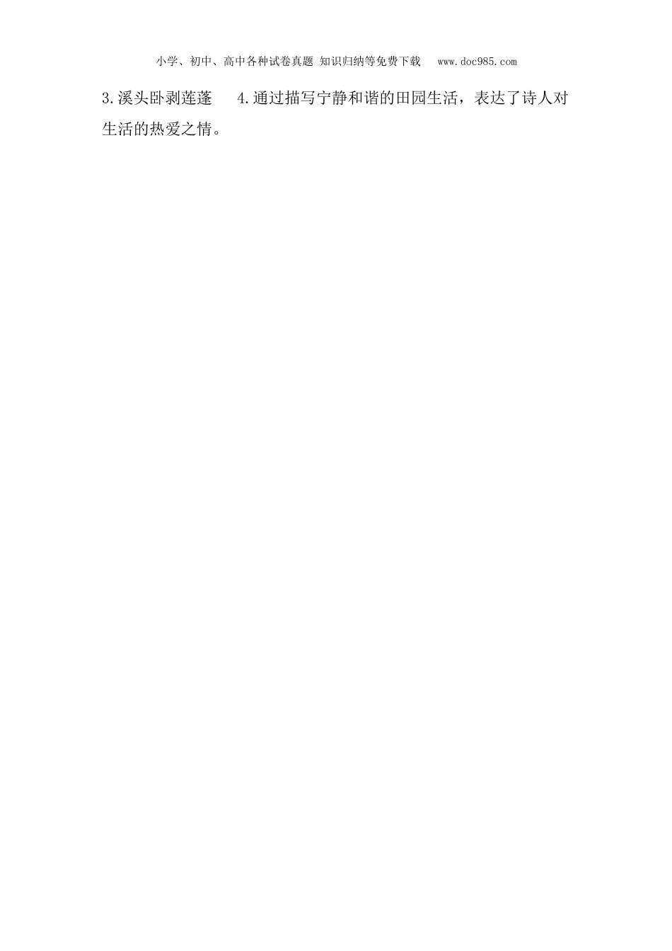 小学、初中、高中各种试卷真题知识归纳等免费下载www.doc985.com类文阅读-古诗三首溪居即事【唐】崔道融篱外谁家不系船,春风吹入钓鱼湾。小童疑是有村客,急向柴门去却关。1.这首诗勾画了一幅水乡春景图:临水的村庄,疏疏落落的篱笆,,,,奔跑的儿童和谐而富有诗意。2.第三、四句中“疑”“急”二字,描绘出一个()的农村儿童形象。A.淘气顽皮、聪明伶俐B.热情淳朴、天真可爱C.遇事慌张、手足无措3.用自己的话写一写第三、四句的意思。4.从这首诗中,你感受到了怎样的乡村生活?答案1.悠悠飘荡的小船波光粼粼的溪水掩着的柴门2.B3.小孩子望到了喜出望外,以为是邻村的客人忽然到来。他急急忙忙奔向柴门,赶紧把闭着的柴门打开。小学、初中、高中各种试卷真题知识归纳等免费下载www.doc985.com4.例:宁静优美,闲适舒坦。(意思对即可)清平乐(yuè)·村居【宋】辛弃疾茅檐低小,溪上青青草。醉里吴音相媚好,白发谁家翁媪?大儿锄豆溪东,中儿正织鸡笼。最喜小儿亡(同“无”)赖,溪头卧剥莲蓬。1.这是一首词,其中()是这首诗的词牌名,()是题目。2.对“亡赖”的理解正确的是()。A.贬义词,说明小儿不好好干活,耍无赖B.褒义词,顽皮淘气的意思3.表现小儿无赖的一句是:。4.这首词表现了诗人怎样的感情?答案1.清平乐村居2.B小学、初中、高中各种试卷真题知识归纳等免费下载www.doc985.com3.溪头卧剥莲蓬4.通过描写宁静和谐的田园生活,表达了诗人对生活的热爱之情。