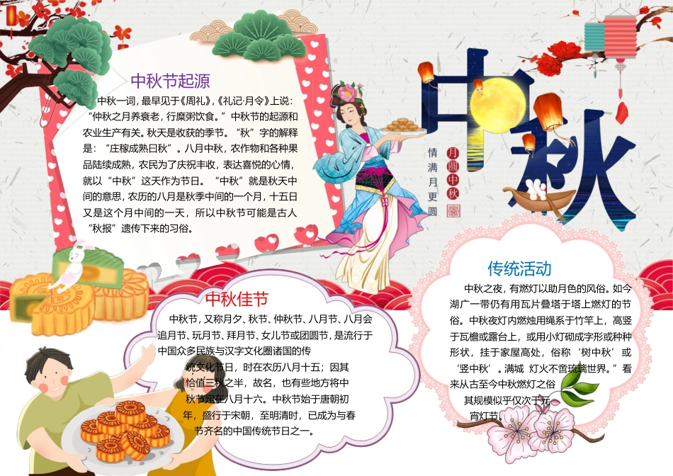 传统活动中秋之夜,有燃灯以助月色的风俗。如今湖广一带仍有用瓦片叠塔于塔上燃灯的节俗。中秋夜灯内燃烛用绳系于竹竿上,高竖于瓦檐或露台上,或用小灯砌成字形或种种形状,挂于家屋高处,俗称‘树中秋’或‘竖中秋’。满城灯火不啻琉璃世界。”看来从古至今中秋燃灯之俗其规模似乎仅次于元宵灯节。中秋节起源中秋一词,最早见于《周礼》,《礼记·月令》上说:“仲秋之月养衰老,行糜粥饮食。”中秋节的起源和农业生产有关。秋天是收获的季节。“秋”字的解释是:“庄稼成熟曰秋”。八月中秋,农作物和各种果品陆续成熟,农民为了庆祝丰收,表达喜悦的心情,就以“中秋”这天作为节日。“中秋”就是秋天中间的意思,农历的八月是秋季中间的一个月,十五日又是这个月中间的一天,所以中秋节可能是古人“秋报”遗传下来的习俗。中秋佳节中秋节,又称月夕、秋节、仲秋节、八月节、八月会追月节、玩月节、拜月节、女儿节或团圆节,是流行于中国众多民族与汉字文化圈诸国的传统文化节日,时在农历八月十五;因其恰值三秋之半,故名,也有些地方将中秋节定在八月十六。中秋节始于唐朝初年,盛行于宋朝,至明清时,已成为与春节齐名的中国传统节日之一。