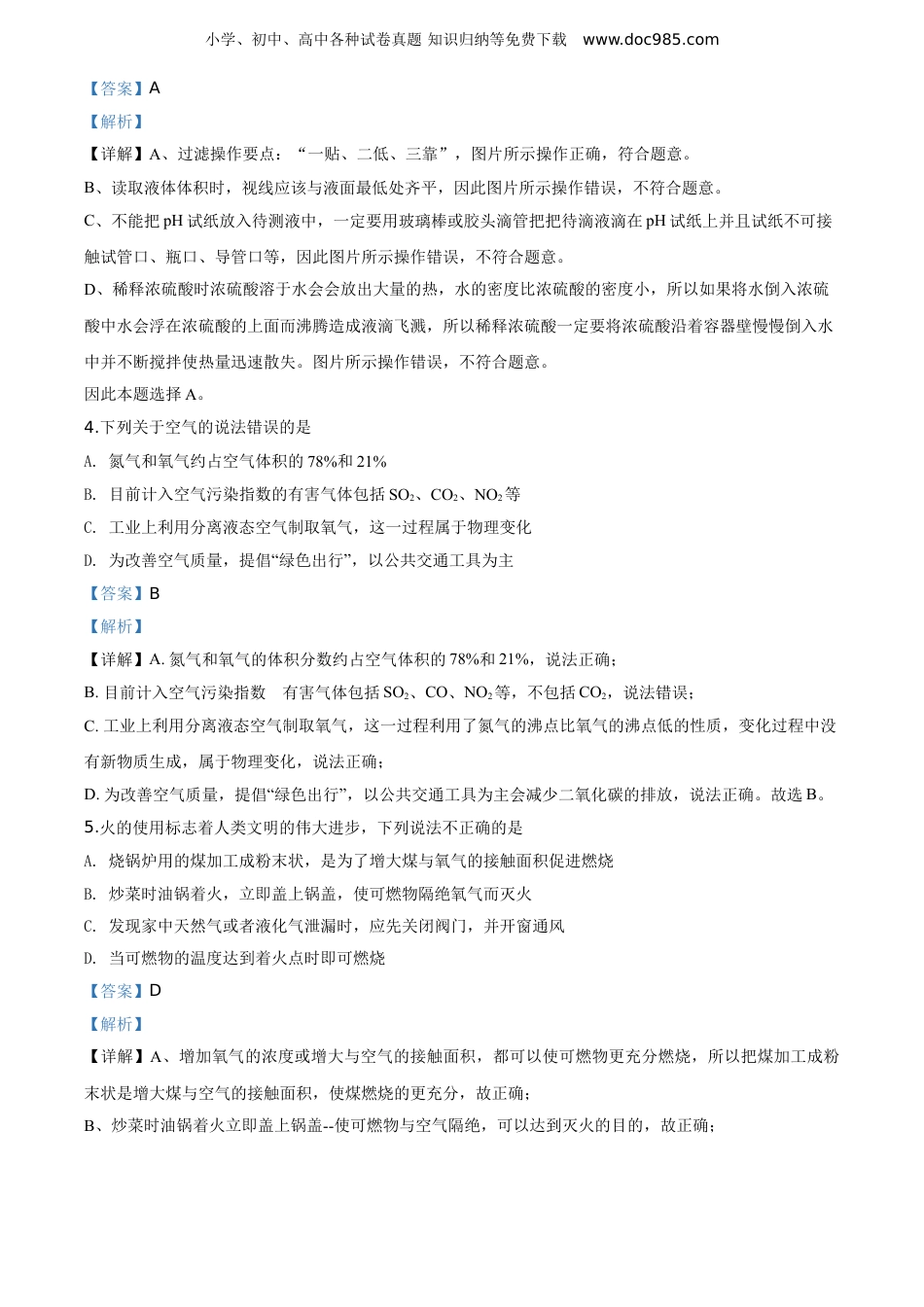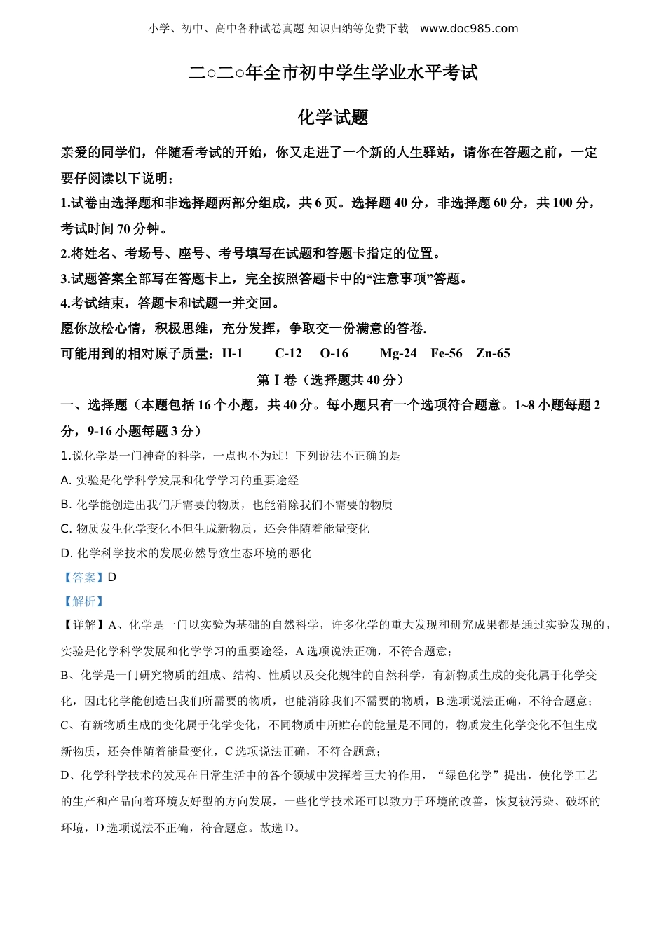 小学、初中、高中各种试卷真题知识归纳等免费下载www.doc985.com二○二○年全市初中学生学业水平考试化学试题亲爱的同学们,伴随看考试的开始,你又走进了一个新的人生驿站,请你在答题之前,一定要仔阅读以下说明:1.试卷由选择题和非选择题两部分组成,共6页。选择题40分,非选择题60分,共100分,考试时间70分钟。2.将姓名、考场号、座号、考号填写在试题和答题卡指定的位置。3.试题答案全部写在答题卡上,完全按照答题卡中的“注意事项”答题。4.考试结束,答题卡和试题一并交回。愿你放松心情,积极思维,充分发挥,争取交一份满意的答卷.可能用到的相对原子质量:H-1C-12O-16Mg-24Fe-56Zn-65第Ⅰ卷(选择题共40分)一、选择题(本题包括16个小题,共40分。每小题只有一个选项符合题意。1~8小题每题2分,9-16小题每题3分)1.说化学是一门神奇的科学,一点也不为过!下列说法不正确的是A.实验是化学科学发展和化学学习的重要途经B.化学能创造出我们所需要的物质,也能消除我们不需要的物质C.物质发生化学变化不但生成新物质,还会伴随着能量变化D.化学科学技术的发展必然导致生态环境的恶化【答案】D【解析】【详解】A、化学是一门以实验为基础的自然科学,许多化学的重大发现和研究成果都是通过实验发现的,实验是化学科学发展和化学学习的重要途经,A选项说法正确,不符合题意;B、化学是一门研究物质的组成、结构、性质以及变化规律的自然科学,有新物质生成的变化属于化学变化,因此化学能创造出我们所需要的物质,也能消除我们不需要的物质,B选项说法正确,不符合题意;C、有新物质生成的变化属于化学变化,不同物质中所贮存的能量是不同的,物质发生化学变化不但生成新物质,还会伴随着能量变化,C选项说法正确,不符合题意;D、化学科学技术的发展在日常生活中的各个领域中发挥着巨大的作用,“绿色化学”提出,使化学工艺的生产和产品向着环境友好型的方向发展,一些化学技术还可以致力于环境的改善,恢复被污染、破坏的环境,D选项说法不正确,符合题意。故选D。小学、初中、高中各种试卷真题知识归纳等免费下载www.doc985.com2.分子、原子和离子都是构成物质的基本粒子,下列说法正确的是A.分子由原子构成,分子比原子大B.水遇冷凝结成冰,水分子停止了运动C.原子是最小的粒子,不可再分D.氯化钠是由钠离子和氯离子构成的【答案】D【解析】【详解】A、分子是由原子构成的,但是分子不一定比原子大,例如:一个水分子大于一个氢原子,但一个铁原子大于一个氢分子,故A选项错误;B、分子在做永不停歇的无规则运动,水虽然凝结成冰,但冰中的水分子仍然在做无规则运动,没有停止,故B选项错误;C、原子是化学变化中最小粒子,不可再分,但在结构上还可以再分为原子核与核外电子,故C选项错误;D、氯化钠属于由离子直接构成的物质,所以说氯化钠是由钠离子和氯离子构成的,故D选项正确。故本题选D。3.下列实验操作正确的是A.过滤B.读取液体体积C.测溶液的pHD.稀释浓硫酸小学、初中、高中各种试卷真题知识归纳等免费下载www.doc985.com【答案】A【解析】【详解】A、过滤操作要点:“一贴、二低、三靠”,图片所示操作正确,符合题意。B、读取液体体积时,视线应该与液面最低处齐平,因此图片所示操作错误,不符合题意。C、不能把pH试纸放入待测液中,一定要用玻璃棒或胶头滴管把把待滴液滴在pH试纸上并且试纸不可接触试管口、瓶口、导管口等,因此图片所示操作错误,不符合题意。D、稀释浓硫酸时浓硫酸溶于水会会放出大量的热,水的密度比浓硫酸的密度小,所以如果将水倒入浓硫酸中水会浮在浓硫酸的上面而沸腾造成液滴飞溅,所以稀释浓硫酸一定要将浓硫酸沿着容器壁慢慢倒入水中并不断搅拌使热量迅速散失。图片所示操作错误,不符合题意。因此本题选择A。4.下列关于空气的说法错误的是A.氮气和氧气约占空气体积的78%和21%B.目前计入空气污染指数的有害气体包括SO2、CO2、NO2等C.工业上利用分离液态空气制取氧气,这一过程属于物理变化D.为改善空气质量,提倡“绿色出行”,以公共交通工具为主【答案】B【解析】【详解】A.氮气和氧气的体积分数约占空气体积的78%和21%,说...