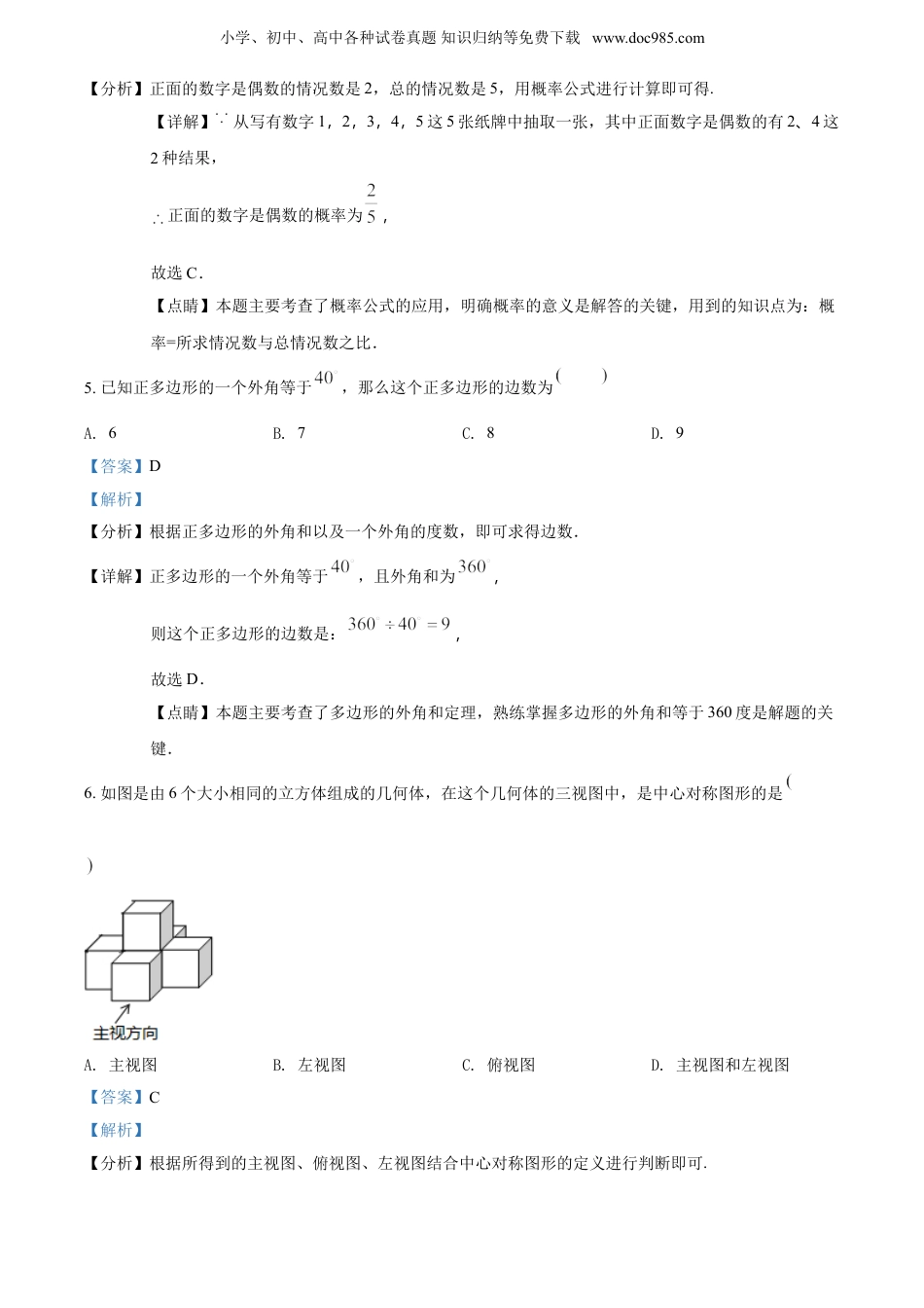 小学、初中、高中各种试卷真题知识归纳等免费下载www.doc985.com浙江省宁波市2018年中考数学试卷一、选择题(本大题共12小题,共48分)1.在,,0,1这四个数中,最小的数是A.B.C.0D.1【答案】A【解析】【分析】根据正数大于零,零大于负数,正数大于一切负数,即可得答案.【详解】由正数大于零,零大于负数,得,最小的数是,故选A.【点睛】本题考查了有理数比较大小,利用好“正数大于零,零大于负数,两个负数绝对值大的反而小”是解题关键.2.2018中国宁波特色文化产业博览会于4月16日在宁波国际会展中心闭幕本次博览会为期四天,参观总人数超55万人次,其中55万用科学记数法表示为A.B.C.D.【答案】B【解析】【分析】科学记数法的表示形式为的形式,其中,n为整数确定n的值时,要看把原数变成a时,小数点移动了多少位,n的绝对值与小数点移动的位数相同当原数绝对值时,n是正数;当原数的绝对值时,n是负数.【详解】55万=550000,550000的小数点向左移动5位得到5.5,所以55万用科学记数法表示为,故选B.小学、初中、高中各种试卷真题知识归纳等免费下载www.doc985.com【点睛】本题考查科学记数法的表示方法,科学记数法的表示形式为的形式,其中,n为整数,表示时关键要正确确定a的值以及n的值.3.下列计算正确的是A.B.C.D.【答案】A【解析】【分析】根据同底数幂的除法法则,同底数幂的乘法的运算方法,合并同类项的方法,以及幂的乘方的运算方法,逐项判定即可.【详解】,选项A符合题意;,选项B不符合题意;,选项C不符合题意;,选项D不符合题意,故选A.【点睛】本题主要考查了同底数幂的除法法则,同底数幂的乘法的运算方法,合并同类项的方法,以及幂的乘方与积的乘方的运算方法,解答此题的关键是要明确:底数,因为0不能做除数;单独的一个字母,其指数是1,而不是0;应用同底数幂除法的法则时,底数a可是单项式,也可以是多项式,但必须明确底数是什么,指数是什么.4.有五张背面完全相同的卡片,正面分别写有数字1,2,3,4,5,把这些卡片背面朝上洗匀后,从中随机抽取一张,其正面的数字是偶数的概率为A.B.C.D.【答案】C【解析】小学、初中、高中各种试卷真题知识归纳等免费下载www.doc985.com【分析】正面的数字是偶数的情况数是2,总的情况数是5,用概率公式进行计算即可得.【详解】从写有数字1,2,3,4,5这5张纸牌中抽取一张,其中正面数字是偶数的有2、4这2种结果,正面的数字是偶数的概率为,故选C.【点睛】本题主要考查了概率公式的应用,明确概率的意义是解答的关键,用到的知识点为:概率=所求情况数与总情况数之比.5.已知正多边形的一个外角等于,那么这个正多边形的边数为A.6B.7C.8D.9【答案】D【解析】【分析】根据正多边形的外角和以及一个外角的度数,即可求得边数.【详解】正多边形的一个外角等于,且外角和为,则这个正多边形的边数是:,故选D.【点睛】本题主要考查了多边形的外角和定理,熟练掌握多边形的外角和等于360度是解题的关键.6.如图是由6个大小相同的立方体组成的几何体,在这个几何体的三视图中,是中心对称图形的是A.主视图B.左视图C.俯视图D.主视图和左视图【答案】C【解析】【分析】根据所得到的主视图、俯视图、左视图结合中心对称图形的定义进行判断即可.小学、初中、高中各种试卷真题知识归纳等免费下载www.doc985.com【详解】观察几何体,可得三视图如图所示:可知俯视图是中心对称图形,故选C.【点睛】本题考查了三视图、中心对称图形,正确得到三视图是解决问题的关键.7.如图,在▱ABCD中,对角线AC与BD相交于点O,E是边CD的中点,连结若,,则的度数为A.B.C.D.【答案】B【解析】【分析】直接利用三角形内角和定理得出的度数,再利用三角形中位线定理结合平行线的性质得出答案.【详解】,,,▱ABCD的对角线AC与BD相交于点O,E是边CD的中点,是的中位线,,,小学、初中、高中各种试卷真题知识归纳等免费下载www.doc985.com故选B.【点睛】本题主要考查了三角形内角和定理、三角形中位线定理等知识,得出EO是的中位线是解题关键.8.若一组数据4,1,7,x,5的平均数为4,则这组数据的中位数为A.7B.5C.4D.3【答案...