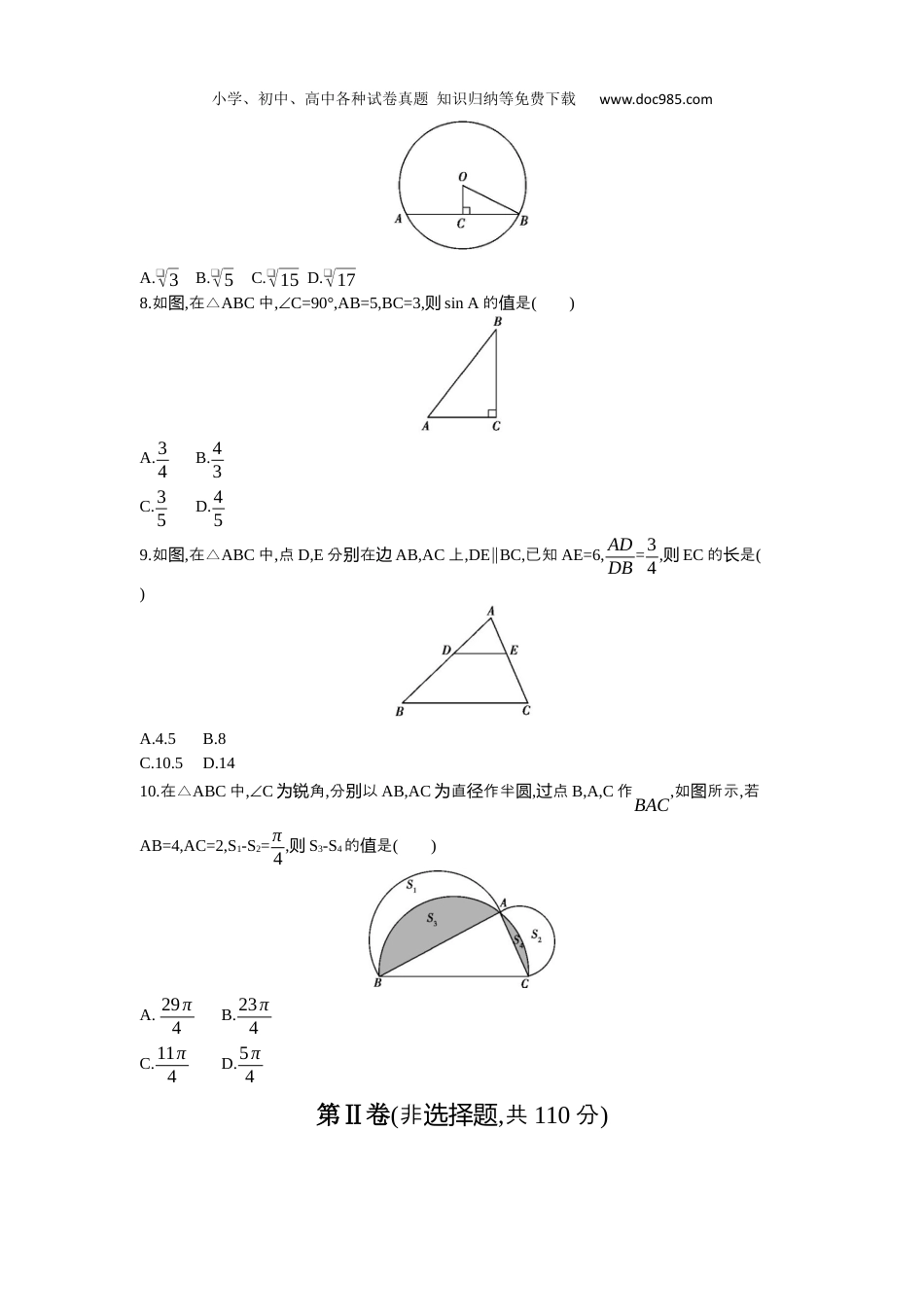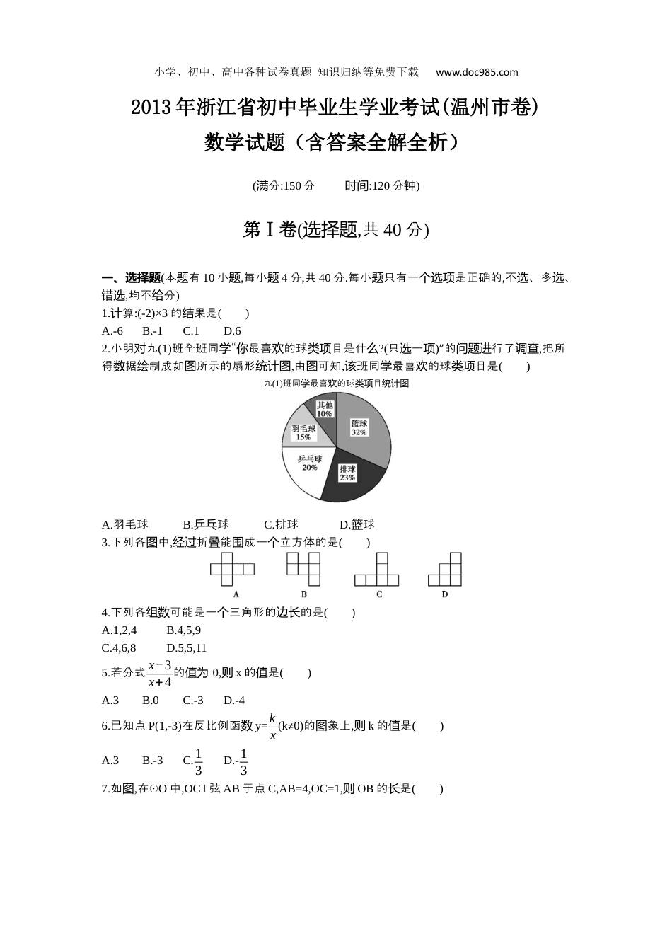 小学、初中、高中各种试卷真题知识归纳等免费下载www.doc985.com2013年浙江省初中毕业生学业考试(温州市卷)数学试题(含答案全解全析)(分满:150分时间:120分钟)第Ⅰ卷(选择题,共40分)一、选择题(本有题10小题,每小题4分,共40分.每小只有一是正确的题个选项,不、多选选、错选,均不分给)1.算计:(-2)×3的果是结()A.-6B.-1C.1D.62.小明九对(1)班全班同“最喜的球目是什学你欢类项么?(只一选项)”的行了问题进调查,把所得据制成如所示的扇形数绘图统计图,由可知图,班同最喜的球目是该学欢类项()九(1)班同最喜的球目学欢类项统计图A.羽毛球B.球乒乓C.排球D.球篮3.下列各中图,折能成一立方体的是经过叠围个()4.下列各可能是一三角形的的是组数个边长()A.1,2,4B.4,5,9C.4,6,8D.5,5,115.若分式x-3x+4的值为0,则x的是值()A.3B.0C.-3D.-46.已知点P(1,-3)在反比例函数y=kx(k≠0)的象上图,则k的是值()A.3B.-3C.13D.-137.如图,在☉O中,OC⊥弦AB于点C,AB=4,OC=1,则OB的是长()小学、初中、高中各种试卷真题知识归纳等免费下载www.doc985.comA.❑√3B.❑√5C.❑√15D.❑√178.如图,在△ABC中,∠C=90°,AB=5,BC=3,则sinA的是值()A.34B.43C.35D.459.如图,在△ABC中,点D,E分在别边AB,AC上,DE∥BC,已知AE=6,ADDB=34,则EC的是长()A.4.5B.8C.10.5D.1410.在△ABC中,∠C角为锐,分以别AB,AC直作半为径圆,点过B,A,C作BAC⏜,如所示图,若AB=4,AC=2,S1-S2=π4,则S3-S4的是值()A.29π4B.23π4C.11π4D.5π4第Ⅱ卷(非选择题,共110分)小学、初中、高中各种试卷真题知识归纳等免费下载www.doc985.com二、填空题(本有题6小题,每小题5分,共30分)11.因式分解:m2-5m=.12.在演唱比中赛,5位委一位歌手的打分如下评给:8.2分,8.3分,7.8分,7.7分,8.0分,位歌则这手的平均得分是分.13.如图,直线a,b被直线c所截,若a∥b,∠1=40°,∠2=70°,则∠3=度.14.方程x2-2x-1=0的解是.15.如图,在平面直角坐系中标,△ABC的点两个顶A,B的坐分标别为(-2,0),(-1,0),BC⊥x轴,将△ABC以y作轴为对称轴轴对称变换,得到△A'B'C'(A和A',B和B',C和C'分是点别对应顶).直线y=x+b点经过A,C',点则C'的坐是标.16.一矩形木板块,的右上角有一洞它个圆,想改造成火餐面现设将它锅桌桌,要求木板大小不变,且使洞的心在矩形面的角交点上圆圆桌对线,木工傅想到了一巧妙的法师个办,他量了测PQ洞的切点与圆K到点B的距离及相据关数(位单:cm)后,点从N沿折线NF—FM(NF∥BC,FM∥AB)切割,如图1所示,图2中的矩形EFGH是切割后的木板接成符合要求的矩形两块拼面示意桌图(不重叠,无隙缝,不耗计损),则CN,AM的分是长别.图1图2三、解答题(本有题8小题,共80分,解答需出必要的文字明、演算步或明程写说骤证过)17.(本题10分)(1)算计:❑√8+(❑√2-1)+(12)0;(2)化简:(1+a)(1-a)+a(a-3).小学、初中、高中各种试卷真题知识归纳等免费下载www.doc985.com18.(本题8分)如图,在△ABC中,∠C=90°,AD平分∠CAB,交CB于点D,点过D作DE⊥AB于点E.(1)求证:△ACD△≌AED;(2)若∠B=30°,CD=1,求BD的长.19.(本题8分)如图,在方格中纸,△ABC的三点和点个顶P都在小方格的点上顶,按要求一三角形画个,使它的点在方格的点上顶顶.(1)将△ABC平移,使点P落在平移后的三角形部内,在甲中出示意图画图;(2)以点C旋中心为转,将△ABC旋转,使点P落在旋后的三角形转部内,在乙中出示意图画图.甲图乙图20.(本题10分)如图,抛物线y=a(x-1)2+4与x交于点轴A,B,与y交于点轴C.点过C作CD∥x交抛物的轴线对于点称轴D,连结BD.已知点A的坐标为(-1,0).(1)求抛物的解析式该线;小学、初中、高中各种试卷真题知识归纳等免费下载www.doc985.com(2)求梯形COBD的面积.21.(本题10分)一不透明的袋中装有个5球个黄,13黑球和个22球个红,除色外都相同它们颜.(1)求袋中摸出一球是球的率从个黄概;(2)袋中取出若干黑球现从个,放入相同量的球并数黄,拌均后搅匀,使袋中摸出一球是从个黄球的率不小于概13,至少取出了多少黑球问个?22.(本题10分)如图,AB为☉O的直径,点C在☉O上,延长BC至点D,使DC=CB,延长DA与☉O的另一交个点为E,连结AC,CE.(1)求证:∠B=∠D;(2)若AB=4,BC-AC=2,求CE的长.小学、初中、高中各种试卷真题知识归纳等免费下载www.doc985.com23.(...