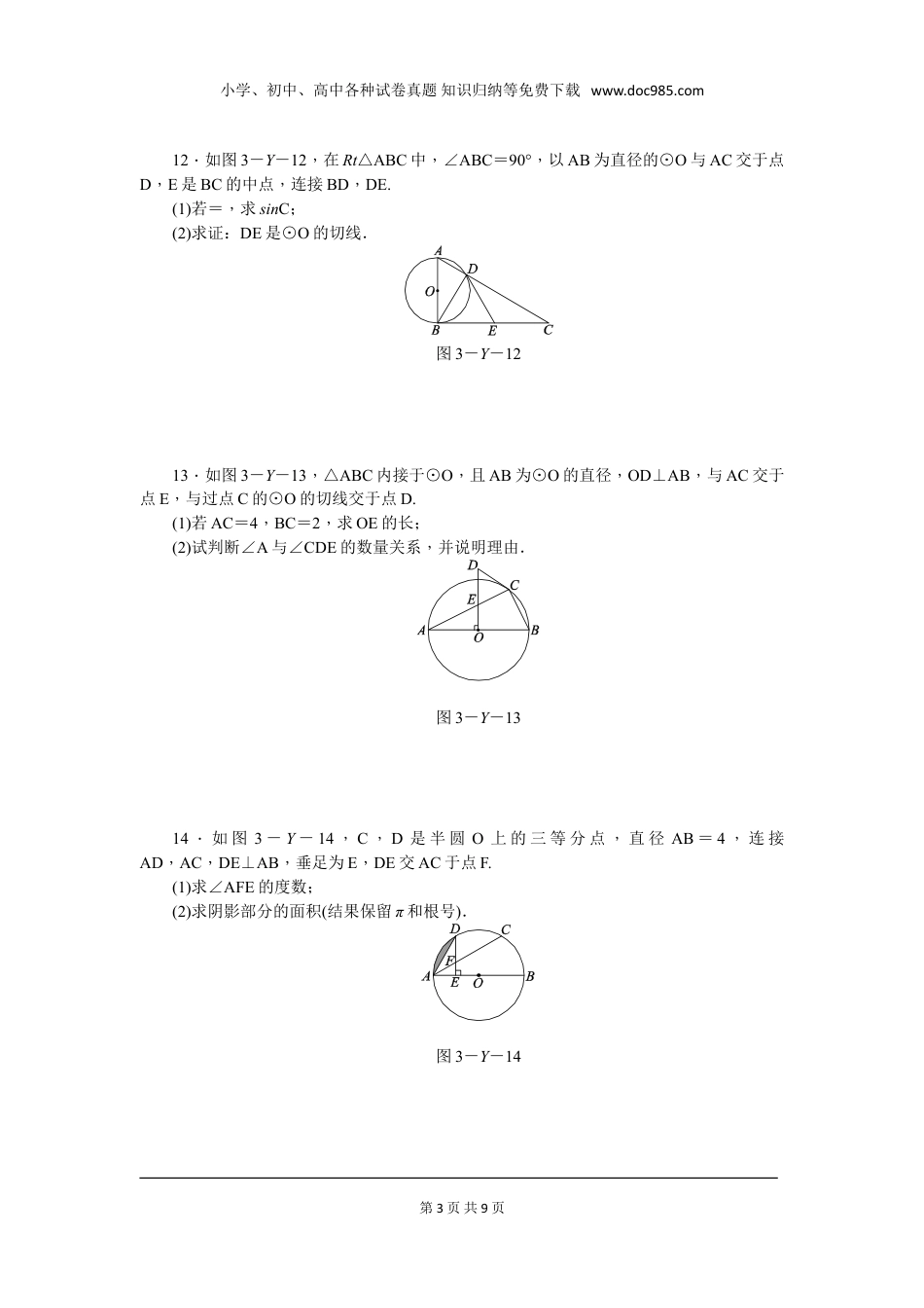 小学、初中、高中各种试卷真题知识归纳等免费下载www.doc985.com第三章圆1.如图3-Y-1,AB是⊙O的直径,CD是⊙O的弦,∠ACD=30°,则∠BAD的度数为()A.30°B.50°C.60°D.70°图3-Y-1图3-Y-22.如图3-Y-2,在⊙O中,半径OC与弦AB垂直于点D,且AB=8,OC=5,则CD的长是()A.3B.2.5C.2D.13.如图3-Y-3,已知直线AD是⊙O的切线,A为切点,OD交⊙O于点B,点C在⊙O上,且∠ODA=36°,则∠ACB的度数为()A.54°B.36°C.30°D.27°图3-Y-3图3-Y-44.如图3-Y-4,在半径为13cm的圆形铁片上切下一块高为8cm的弓形铁片,则弓形弦AB的长为()A.10cmB.16cmC.24cmD.26cm5如图3-Y-5,⊙O的直径AB=4,BC切⊙O于点B,OC平行于弦AD,OC=5,则AD的长为()A.B.C.D.图3-Y-5第1页共9页小学、初中、高中各种试卷真题知识归纳等免费下载www.doc985.com图3-Y-66.如图3-Y-6,AT切⊙O于点A,AB是⊙O的直径,若∠ABT=40°,则∠ATB=________°.7.如图3-Y-7,正六边形ABCDEF内接于⊙O,⊙O的半径为6,则这个正六边形的边心距OM的长为________.8.如图3-Y-8,在扇形AOB中,AC为弦,∠AOB=130°,∠CAO=60°,OA=6,则BC的长为________.图3-Y-7图3-Y-89.如图3-Y-9,AB是⊙O的直径,AB=4,M是OA的中点,过点M的直线与⊙O交于C,D两点.若∠CMA=45°,则弦CD的长为________.图3-Y-9图3-Y-1010.如图3-Y-10,直线AB与CD分别与⊙O相切于B,D两点,且AB⊥CD,垂足为P,连接BD.若BD=4,则阴影部分的面积为________.11.如图3-Y-11,已知⊙O的内接正方形ABCD,E为边CD上一点,且DE=CE,延长BE交⊙O于点F,连接FC,若正方形的边长为1,求弦FC的长.图3-Y-11第2页共9页小学、初中、高中各种试卷真题知识归纳等免费下载www.doc985.com12.如图3-Y-12,在Rt△ABC中,∠ABC=90°,以AB为直径的⊙O与AC交于点D,E是BC的中点,连接BD,DE.(1)若=,求sinC;(2)求证:DE是⊙O的切线.图3-Y-1213.如图3-Y-13,△ABC内接于⊙O,且AB为⊙O的直径,OD⊥AB,与AC交于点E,与过点C的⊙O的切线交于点D.(1)若AC=4,BC=2,求OE的长;(2)试判断∠A与∠CDE的数量关系,并说明理由.图3-Y-1314.如图3-Y-14,C,D是半圆O上的三等分点,直径AB=4,连接AD,AC,DE⊥AB,垂足为E,DE交AC于点F.(1)求∠AFE的度数;(2)求阴影部分的面积(结果保留π和根号).图3-Y-14第3页共9页小学、初中、高中各种试卷真题知识归纳等免费下载www.doc985.com15.如图3-Y-15,PA,PB是⊙O的切线,A,B为切点,∠APB=60°,连接PO并延长与⊙O交于点C,连接AC,BC.(1)求证:四边形ACBP是菱形;(2)若⊙O的半径为1,求菱形ACBP的面积.图3-Y-15第4页共9页小学、初中、高中各种试卷真题知识归纳等免费下载www.doc985.com1.C[解析]如图,连接BD, ∠ACD=30°,∴∠ABD=30°. AB为⊙O的直径,∴∠ADB=90°,∴∠BAD=90°-∠ABD=60°.故选C.2.C[解析]如图,连接OA,设CD=x, OA=OC=5,∴OD=5-x. OC⊥AB,∴由垂径定理,得AD=4,由勾股定理,得52=42+(5-x)2,∴x=2,∴CD=2.故选C.3.D[解析] AD为⊙O的切线,∴AD⊥OA,即∠OAD=90°. ∠ODA=36°,∴∠AOD=54°,∴∠ACB=∠AOD=27°.故选D.4.C[解析]过点O作OC⊥AB于点D,交⊙O于点C. OB=13cm,CD=8cm,∴OD=5cm.在Rt△BOD中,BD==12cm,∴AB=2BD=24cm.5.B[解析]如图,连接BD. AB是⊙O的直径,∴∠ADB=90°. OC∥AD,∴∠A=∠BOC,∴cosA=cos∠BOC. BC切⊙O于点B,∴OB⊥BC,∴cos∠BOC==,∴cosA=.第5页共9页小学、初中、高中各种试卷真题知识归纳等免费下载www.doc985.com又 cosA=,AB=4,∴AD=.故选B.6.507.3[解析]如图,连接OB, 六边形ABCDEF是⊙O的内接正六边形,∴∠BOM==30°,∴OM=OB·cos∠BOM=6×=3.故答案为:3.8.π[解析]连接OC,如图, OA=OC,∴∠OCA=∠CAO=60°,∴∠AOC=60°,∴∠BOC=130°-60°=70°,∴BC的长为=π.故答案为:π.9.[解析]连接OD,过点O作OE⊥CD于点E,如图所示.则CE=DE. AB是⊙O的直径,AB=4,M是OA的中...