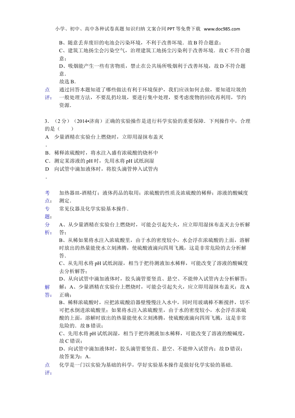 小学、初中、高中各种试卷真题知识归纳文案合同PPT等免费下载www.doc985.com山东省济南市2014年中考化学试卷参考答案与试题解析一、单项选择题(本大题共11小题,毎小题2分,共22分.每小题给出的四个选项中,只有一个选项最符合题目的要求)1.(2分)(2014•济南)物质世界充满了变化.下列变化中,属于物理变化的是()A.光合作用B.钢铁生锈C.酸雨侵蚀D.冰山融化考点:化学变化和物理变化的判别.专题:物质的变化与性质.分析:化学变化是指有新物质生成的变化,物理变化是指没有新物质生成的变化,化学变化和物理变化的本质区别是否有新物质生成;据此分析判断.解答:解:A、光合作用过程中有新物质二氧化碳生成,属于化学变化.B、钢铁生锈过程中有新物质铁锈生成,属于化学变化.C、酸雨侵蚀过程中有新物质生成,属于化学变化.D、冰雪融化过程中只是状态发生改变,没有新物质生成,属于物理变化.故选:D.点评:本题难度不大,解答时要分析变化过程中是否有新物质生成,若没有新物质生成属于物理变化,若有新物质生成属于化学变化.2.(2分)(2014•济南)建设美丽泉城,创建国家卫生城市,人人有责.下列做法中,不利于改善坏境的是()A.禁止工业污水超标排放B.随意丢弃废旧的电池C.治理建筑工地扬尘污染D.禁止在公共场所吸烟考点:水资源的污染与防治;防治空气污染的措施.专题:化学与环境保护.分析:A、根据工业污水会污染环境分析;B、根据电池会污染环境分析;C、根据建筑工地扬尘会污染空气分析;D、根据吸烟能产生一些有害物质分析.解答:解:A、工业污水超标排放会污染环境,禁止工业污水超标排放利于改善坏境,故A不符合题意;小学、初中、高中各种试卷真题知识归纳文案合同PPT等免费下载www.doc985.comB、随意丢弃废旧的电池会污染环境,不利于改善坏境.故B符合题意;C、建筑工地扬尘会污染空气,治理建筑工地扬尘污染利于改善坏境.故C不符合题意;D、吸烟能产生一些有害物质,禁止在公共场所吸烟利于改善坏境,故D不符合题意.故选B.点评:通过回答本题知道了哪些做法有利于环境保护,我们应该如何去做,要知道垃圾的一般处理方法,不要乱扔垃圾,要进行集中处理,要考虑废物的回收再利用,节约资源.3.(2分)(2014•济南)正确的实验操作是进行科学实验的重要保障.下列操作中,合理的是()A.少量酒精在实验台上燃烧时,立即用湿抹布盖灭B.稀释浓硫酸时,将水注入盛有浓硫酸的烧杯中C.测定某溶液的pH时,先用水将pH试纸润湿D.向试管中滴加液体时,将胶头滴管伸入试管内考点:加热器皿-酒精灯;液体药品的取用;浓硫酸的性质及浓硫酸的稀释;溶液的酸碱度测定.专题:常见仪器及化学实验基本操作.分析:A、从少量酒精在实验台上燃烧时,可能会引起失火,应立即用湿抹布盖灭去分析解答;B、从稀如果将水注入浓硫酸里,由于水的密度较小,水会浮在浓硫酸的上面,溶解时放出的热量能使水立刻沸腾,使硫酸液滴向四周飞溅,这是非常危险的去分析解答.C、从先用水将pH试纸润湿,相当于把待测液加水稀释,可能改变了溶液的酸碱度去分析解答;D、从向试管中滴加液体时,胶头滴管要竖直、悬空、不能伸入试管内去分析解答;解答:解:A、少量酒精在实验台上燃烧时,可能会引起失火,应立即用湿抹布盖灭;故A正确;B、稀释浓硫酸时,应把浓硫酸沿器壁慢慢注入水中,同时用玻璃棒不断搅拌,切不可把水倒进浓硫酸里;如果将水注入浓硫酸里,由于水的密度较小,水会浮在浓硫酸的上面,溶解时放出的热量能使水立刻沸腾,使硫酸液滴向四周飞溅,这是非常危险的.故B错误;C、先用水将pH试纸润湿,相当于把待测液加水稀释,可能改变了溶液的酸碱度,故C错误;D、向试管中滴加液体时,胶头滴管要竖直、悬空、不能伸入试管内;故D错误;故答案为:A.点评:化学是一门以实验为基础的科学,学好实验基本操作是做好化学实验的基础.小学、初中、高中各种试卷真题知识归纳文案合同PPT等免费下载www.doc985.com4.(2分)(2014•济南)化学与生活息息相关.下列说法中,不合理的是()A.干冰可用作环保制冷剂B.医用酒精可用于杀菌消毒C.小苏打可用...