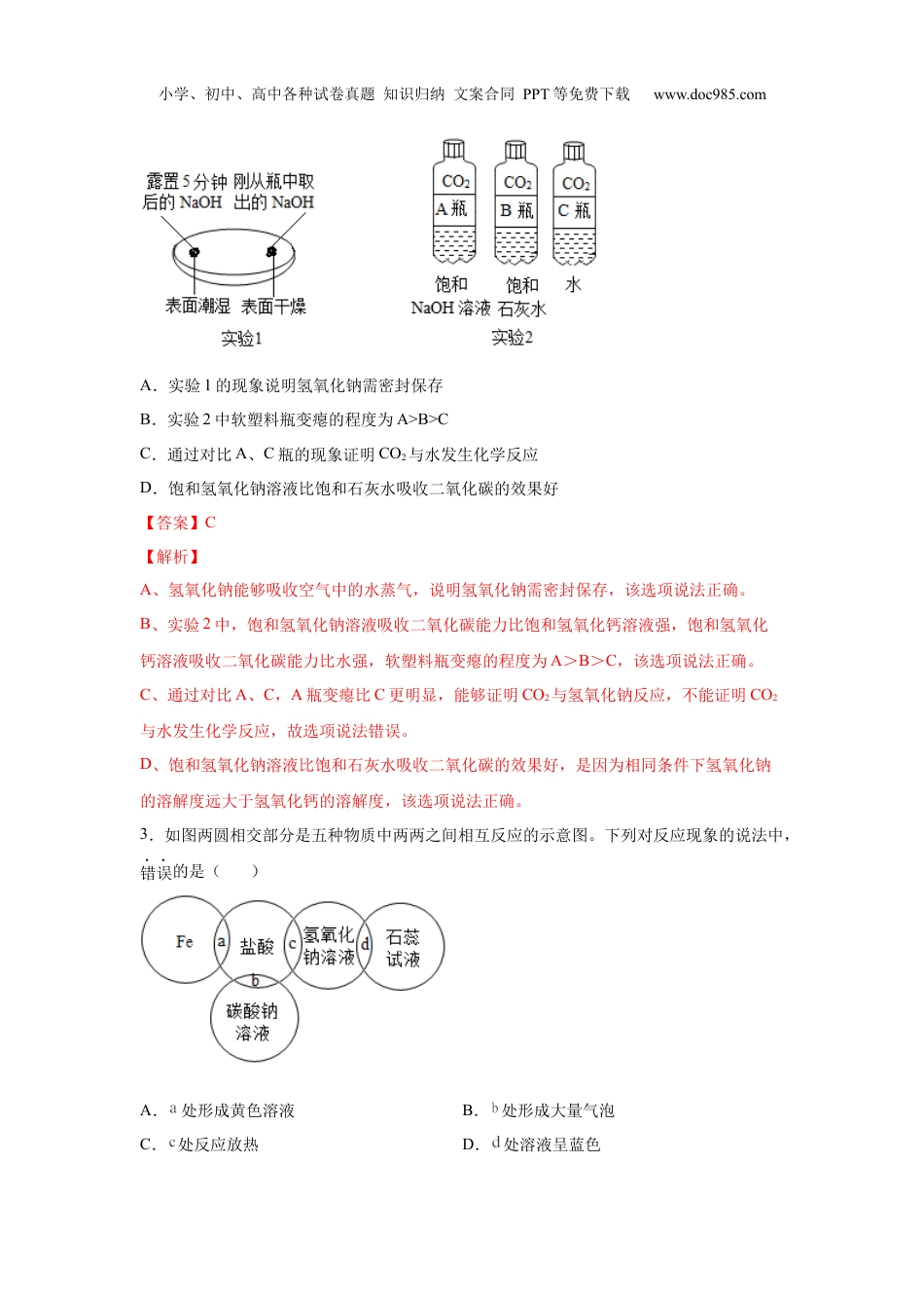 小学、初中、高中各种试卷真题知识归纳文案合同PPT等免费下载www.doc985.com浙教版九年级上册第四节常见的碱【同步练习-解析】一、选择题1.下列是探究碱性质的实验,都能发生反应且反应中体现了“碱的通性”的组合是()A.①②③④B.①②③C.①②④D.②③④【答案】C【解析】①氢氧化钡溶液、氢氧化钙溶液都能和氯化铜溶液反应生成氢氧化铜沉淀,能体现碱的通性;②氢氧化钡溶液、氢氧化钙溶液都能使酚酞溶液变红,能体现碱的通性;③氢氧化钡溶液、氢氧化钙溶液都能和碳酸钾溶液反应生成白色沉淀,但氢氧根离子在反应前后没有改变,不能体现碱的通性;④氢氧化钡溶液、氢氧化钙溶液都能和二氧化硫反应生成盐和水,能体现碱的通性。2.用下列对比实验探究碱的性质,下列说法不正确的是()小学、初中、高中各种试卷真题知识归纳文案合同PPT等免费下载www.doc985.comA.实验1的现象说明氢氧化钠需密封保存B.实验2中软塑料瓶变瘪的程度为A>B>CC.通过对比A、C瓶的现象证明CO2与水发生化学反应D.饱和氢氧化钠溶液比饱和石灰水吸收二氧化碳的效果好【答案】C【解析】A、氢氧化钠能够吸收空气中的水蒸气,说明氢氧化钠需密封保存,该选项说法正确。B、实验2中,饱和氢氧化钠溶液吸收二氧化碳能力比饱和氢氧化钙溶液强,饱和氢氧化钙溶液吸收二氧化碳能力比水强,软塑料瓶变瘪的程度为A>B>C,该选项说法正确。C、通过对比A、C,A瓶变瘪比C更明显,能够证明CO2与氢氧化钠反应,不能证明CO2与水发生化学反应,故选项说法错误。D、饱和氢氧化钠溶液比饱和石灰水吸收二氧化碳的效果好,是因为相同条件下氢氧化钠的溶解度远大于氢氧化钙的溶解度,该选项说法正确。3.如图两圆相交部分是五种物质中两两之间相互反应的示意图。下列对反应现象的说法中,错误的是()A.处形成黄色溶液B.处形成大量气泡C.处反应放热D.处溶液呈蓝色小学、初中、高中各种试卷真题知识归纳文案合同PPT等免费下载www.doc985.com【答案】A【解析】A、铁和盐酸反应生成氯化亚铁和氢气,氯化亚铁的溶液为浅绿色的,故A错误。B、盐酸和碳酸钠溶液反应生成氯化钠、水和二氧化碳,所以有气泡,故B正确。C、盐酸和氢氧化钠反应是中和反应,中和反应放热,故C正确。D、石蕊遇酸变红遇碱变蓝,所以氢氧化钠溶液滴入石蕊试液,溶液呈蓝色,故D正确。4.利用图甲装置进行实验,先后将注射器中的两种溶液快速全部推入,测得一段时间内瓶内气体压强变化如图乙所示。下列说法不正确的是()A.先推入的是NaOH溶液B.BC段,CO2与NaOH反应基本停止C.D点压强比瓶内初始压强大,此时瓶内二氧化碳气体的量比初始多D.最终压强比瓶内初始压强小,可能是因为有部分二氧化碳溶于水【答案】C【解析】A、先推入的是NaOH溶液,是因为氢氧化钠和二氧化碳反应生成碳酸钠和水,导致容器中气压减小,该选项说法正确。B、BC段气压不变,是因为CO2与NaOH溶液反应基本停止,该选项说法正确。C、碳酸钠和盐酸反应生成的二氧化碳少于或等于初始的二氧化碳的量,D点压强比初始瓶内压强大,是因为加入的氢氧化钠溶液、稀盐酸占据了一定体积,该选项说法不正确。D、最终压强比初始压强小,可能是因为有部分二氧化碳溶于水,该选项说法正确。5.小科在研究碱的化学性质时,设计了如图所示的五组实验,下列叙述正确的是()小学、初中、高中各种试卷真题知识归纳文案合同PPT等免费下载www.doc985.comA.甲组实验能观察到无色变成红色,可推出氢氧化铜也能使指示剂变色B.乙组实验无明显现象,说明两者不能发生反应C.丙组和戊组实验能观察到相同现象D.丁组实验产生蓝色絮状沉淀,说明凡是碱都能和含铜离子的溶液发生反应【答案】C【解析】A、氢氧化钙溶液显碱性,能使无色变成红色,但是氢氧化铜不溶于水,不显碱性,不能使指示剂变色,该选项说法不正确;B、稀盐酸与氢氧化钠反应能生氯化钠和水,无明显现象,该选项说法不正确;C、丙组二氧化碳和氢氧化钙反应能生成碳酸钙沉淀和水,能够观察到产生白色沉淀,戊组碳酸钠和氢氧化钙反应能生成碳酸钙沉淀和氢氧化钠,能够观察到产生白色沉淀,该选项说法正确;D、丁组实验产生蓝色絮状沉淀,但...