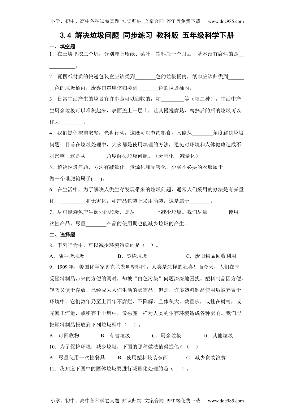 小学、初中、高中各种试卷真题知识归纳文案合同PPT等免费下载www.doc985.com3.4解决垃圾问题同步练习教科版五年级科学下册一、填空题1.在土壤里挖三个坑,分别埋上废纸、菜叶、饮料瓶一个月后,基本没有腐烂的是____________。2.瓦楞纸材质的快递包装盒应该类到________色的垃圾桶内,纸巾应该归类到________色的垃圾桶内,废弃口罩应该归类到________色的垃圾桶内。3.日常生活产生的垃圾有许多是可以回收的,如_________等(填二种)。生活中产生厨余垃圾可以堆积起来,表面盖上一层土,让其慢慢腐熟,腐熟后的后的垃圾可以作为_________。4.我们提倡按需取餐,光盘行动,这既可以节约粮食,又能从________角度解决垃圾问题;目前在垃圾处理中,大多都是使用填理的方法,避免对环境和人体健康造成不利影响,这是从________角度解决垃圾问题。(无害化减量化)5.解决垃圾问题,方法有减量化、资源化和无害化。少买不必要的衣服属于________,做一个堆肥箱属于()。6.在生活中,为了解决人类生存发展带来的垃圾问题,通常人们采用的办法是有减量化、__________和无害化,如产品包装上采用简装,这是属于________。7.尽可能避免产生额外的垃圾,是从________上减少垃圾。我们尽量________使用一次性产品,尽量________产品的使用期也能减少垃圾的产生。二、选择题8.下列行为中,可以减少环境污染的是()。A.随手扔垃圾B.焚烧垃圾C.废旧物品回收利用9.1909年,美国化学家贝克兰发明塑料时,人类是怎样的狂喜!而今天,人们在享受塑料制品带来的方便的同时,却被“白色污染”问题深深地困扰。塑料制品因方便、轻巧又便于存放,已经成为人们生活的必需品。但是,许多塑料制品使用后被弃置于环境中,它们数年乃至上百年不腐烂、不降解,且体积大、数量多,或挂在树梢,或充塞于河道,或积存于土壤中,像恶魔一样对人类的生存环境造成各种影响。我们应把塑料制品投放到下列垃圾桶中()。A.可回收物B.有害垃圾C.厨余垃圾D.其他垃圾10.为了保护环境,减少垃圾,下面的那种做法值得提倡?()A.尽量使用一次性餐具B.使用塑料袋装东西C.减少食物浪费11.我知道下图中的固体垃圾要进行减量化处理的是()。小学、初中、高中各种试卷真题知识归纳文案合同PPT等免费下载www.doc985.com小学、初中、高中各种试卷真题知识归纳文案合同PPT等免费下载www.doc985.comA.B.C.12.有些垃圾可以按一定比例拌入土壤,经过一段腐熟时间后成为种植花草的底肥,以下垃圾中不适合这样处理的是()。A.西瓜皮B.塑料袋C.菜叶D.过期的面包13.用简单填埋的方式处理垃圾存在的问题是()。A.污染地下水B.污染空气C.污染土壤D.以上都是14.以下不是垃圾焚烧处理优点的是()。A.不污染地下水B.大大减少垃圾数量C.不产生废气D.处理速度快15.2019年8月,浙江省发布了《城镇生活垃圾分类标准》,把生活垃圾分成可回收垃圾、有害垃圾、易腐垃圾和其他垃圾四大类。其中易腐垃圾包括餐厨垃圾类、厨余垃圾类和生鲜垃圾类。下列都属于易腐垃圾的选项是()。A.剩菜、蛋壳、枯枝B.剩饭、餐巾纸、蔬菜C.破陶瓷碗、肉骨头、瓜果D.电池、矿泉水瓶、鱼骨头16.6月5日是世界环境日,下列做法中,不符合“绿色环保,低碳节能“的是()。A.骑自行车上学B.出门随手关灯C.用纸巾代替手帕D.可回收垃圾再利用17.以下哪项不是垃圾填埋的优点()。A.操作简单B.占地面积小C.可以处理多种类的垃圾18.如果生活中产生的垃圾不进行处理,随意放置,这会对环境带来()影响。A.破坏臭氧层B.污染水源、污染土地、污染空气且占据一定的空间等C.地球本身非常大,不会有什么影响19.下列做法中,利用资源化回收垃圾的办法是()。A.将废弃的塑料制品埋进土中B.将废旧的纸制品用火烧掉小学、初中、高中各种试卷真题知识归纳文案合同PPT等免费下载www.doc985.com小学、初中、高中各种试卷真题知识归纳文案合同PPT等免费下载www.doc985.comC.将废弃的金属制品熔铸成新的自行车零件20.解决垃圾问题方法中的资源化,意义在于()。A.尽可能避免产生额外的垃圾,从源头上减少垃圾B.将回收的垃...