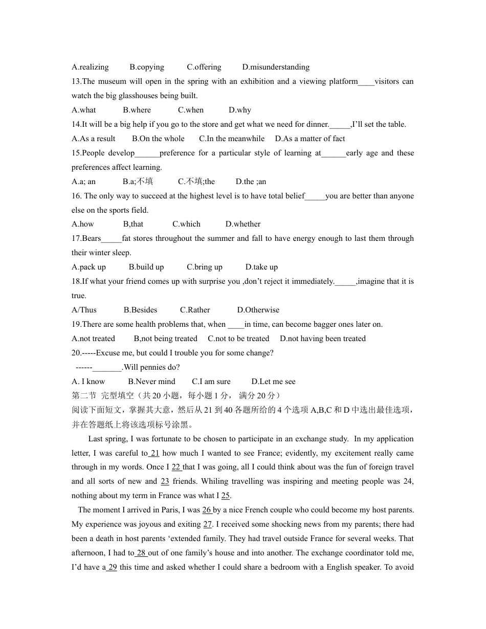 英语试题(选择题部分)第一部分:英语知识运用(共两节,满分30分)第一节:单项填空(共20题,每小题0.5分,满分10分)从A、B、C和D四个选项中,选出可以填入空白处的最佳选项,并在答题纸将该选项标号涂黑。1.——Hey,canIaskyouafavor?====_______A.HereyouareB.justasIthoughtC.howisitgoing?D.whatcanIdoforyou?2.Maryworkedhereasa____-secretaryandendedupgettingafull-timejobwiththecompany.A.pessimisticB.temporaryC.previousD.cautious3.I______myselfmore-----itwasaperfectday.A.shouldn’thaveenjoyedB.needn’thaveenjoyedC.wouldn’thaveenjoyedD.couldn’thaveenjoyed4.Astheworld’spopulationcontinuestogrow,the___offoodbecomesmoreandmoreofaconcern.A.worthB.supplyC.packageD.list5.Thechildren,____hadplayedthewholedaylong,werewornout.A.allofwhatB.allofwhichC.allofthemD.allofwhom6.Ifweleaverightaway,____we’llarriveontime.A.hopefullyB.curiouslyC.occasionallyD.gradually7.______howothersreacttothebookyouhavejustreadcreatesanaddedpleasure.A.HearingB.HearC.HavingheardD.Tobehearing8.Eyedoctorsrecommendthatachild’sfirsteyeexam____attheageofsixmonthsold.A.wasB.beC.wereD.is9.Whenthegroupdiscussionisnearingitsend,makesureto____itwithimportantpoints.A.concludeB.leadC.avoidD.hold10.Duringthelastthreedecades,thenumberofpeopleparticipatinginphysicalfitnessprograms___sharply.A.wasincreasingB.hasincreasedC.hadincreasedD.willbeincreasing11.Halfof_____surveyedin16countriessaytheygofirsttotheirclosestfriendtosharetheirdeepestwishesanddarkestfears.A.theseB,.someC.onesD.those12.Agoodlistenertakespartintheconversation,____ideasandraisingquestionstokeepthetalkflowing.A.realizingB.copyingC.offeringD.misunderstanding13.Themuseumwillopeninthespringwithanexhibitionandaviewingplatform____visitorscanwatchthebigglasshousesbeingbuilt.A.whatB.whereC.whenD.why14.Itwillbeabighelpifyougotothestoreandgetwhatweneedfordinner._____,I’llsetthetable.A.AsaresultB.OnthewholeC.InthemeanwhileD.Asamatteroffact15.Peopledevelop______preferenceforaparticularstyleoflearningat______earlyageandthesepreferencesaffectlearning.A.a;anB.a;不填C.不填;theD.the;an16.Theonlywaytosucceedatthehighestlevelistohavetotalbelief_____youarebetterthananyoneelseonthesportsfield.A.howB,thatC.whichD.whether17.Bears_____fatstoresthroughoutthesummerandfalltohaveenergyenoughtolastthemthroughtheirwintersleep.A.packupB.buildupC.bringupD.takeup18.Ifwhatyourfriendcomesupwithsurpriseyou,don’trejectitimmediately._____,imaginethatitistrue.A/ThusB.BesidesC.RatherD.Otherwise19.Therearesomehealthproblemsthat,when____intime,canbecomebaggeroneslateron.A.nottreatedB,notbeingtreatedC.nottobetreatedD.nothavingbeentreated20.-----Excuseme,butcouldItroubleyouforsomechange?------_______.Willpenniesdo?A.IknowB.NevermindC.IamsureD.Letmesee第二节完型填空(共20小题,每小题1分,满分20分)阅读下面短文,掌握其大意,然后从21到40各题所给的4个选项A,B,C和D中选出最佳选项,并在答题纸上将该选项标号涂黑。Lastspring,Iwasfortunatetobechosentoparticipateinanexchangestudy.Inmyapplicationletter,Iwascarefulto21howmuchIwantedtoseeFrance;evidently,myexcitementreallycamethroughinmywords.OnceI22thatIwasgoing,allIcouldthinkaboutwasthefunofforeigntravelandallsortsofnewand23friends.Whilingtravellingwasinspiringandmeetingpeoplewas24,nothingaboutmyterminFrancewaswhatI25.ThemomentIarrivedinParis,Iwas26byaniceFrenchcouplewhocouldbecomemyhostparents.Myexperiencewasjoyousandexiting27.Ireceivedsomeshockingnewsfrommyparents;t...