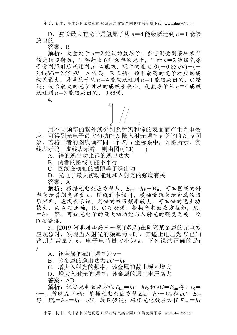 小学、初中、高中各种试卷真题知识归纳文案合同PPT等免费下载www.doc985.com选择题8波粒二象性和原子物理考向1波粒二象性和原子结构1.以下关于光子说的基本内容,不正确的说法是()A.光子的能量跟它的频率有关B.紫光光子的能量比红光光子的能量大C.光子是具有质量、能量和体积的实物微粒D.在空间传播的光是不连续的,而是一份一份的,每一份叫一个光子答案:C解析:根据E=hν判断出光子的能量与光子的频率成正比关系,故A项正确;在可见光的范围内,紫光的频率最大,而红光的频率最小,根据公式E=hν可得紫光的能量大,故B项正确;光子具有能量,但没有静止质量,也没有具体的体积,它不是实物粒子,故C项错误;光是在空间传播的电磁波,是不连续的,是一份一份的能量,每一份叫作一个光子,故D项正确;本题选择不正确的,故选C.2.甲、乙光子的能量之比为2:1,它们都能使某种金属发生光电效应,且所产生的光电子最大初动能为E1、E2,该金属的逸出功为()A.E1-E2B.E1+E2C.E1-2E2D.E1+2E2答案:C解析:由光子能量公式E=hν=知:E1=2E0-W,E2=E0-W,联立得:W=E1-2E2,故C项正确,A、B、D三项错误.3.[2019·河北唐山高三二模]图示为氢原子能级示意图,已知大量处于n=2能级的氢原子,当它们受到某种频率的光线照射后,可辐射出6种频率的光子,下面说法中正确的是()A.n=2能级氢原子受到照射后跃迁到n=5能级B.n=2能级氢原子吸收的能量为2.55eVC.频率最高的光子是氢原子从n=3能级跃迁到n=1能级放出的小学、初中、高中各种试卷真题知识归纳文案合同PPT等免费下载www.doc985.com小学、初中、高中各种试卷真题知识归纳文案合同PPT等免费下载www.doc985.comD.波长最大的光子是氢原子从n=4能级跃迁到n=1能级放出的答案:B解析:大量处于n=2能级的氢原子,当它们受到某种频率的光线照射后,可辐射出6种频率的光子,可知n=2能级氢原子受到照射后跃迁到n=4能级,吸收的能量为(-0.85eV)-(-3.4eV)=2.55eV,A错误,B正确;频率最高的光子对应的能级差最大,是氢原子从n=4能级跃迁到n=1能级放出的,C错误;波长最大的光子对应的能级差最小,是氢原子从n=4能级跃迁到n=3能级放出的,D错误.4.用不同频率的紫外线分别照射钨和锌的表面而产生光电效应,可得到光电子最大初动能Ek随入射光频率ν变化的Ekν图象,若将二者的图线画在同一个Ekν坐标系中,如图所示,实线表示钨,虚线表示锌,则由图可知()A.锌的逸出功比钨的逸出功大B.两者的图线可能不平行C.图线在横轴的截距等于逸出功D.光电子最大初动能还和入射光的强度有关答案:A解析:根据光电效应方程知,Ekm=hν-W0,可知图线的斜率表示普朗克常量h,图线斜率相同,横轴截距表示金属的极限频率,虚线表示锌,则锌的极限频率较大,可知锌的逸出功较大,故A项正确,B、C项错误;根据光电效应方程知,Ekm=hν-W0,可知光电子的最大初动能与入射光的强度无关.故D项错误.5.[2019·河北唐山高三一模](多选)在研究某金属的光电效应现象时,发现当入射光的频率为ν时,其遏止电压为U.已知普朗克常量为h,电子电荷量大小为e,下列说法正确的是()A.该金属的截止频率为ν-B.该金属的逸出功为eU-hνC.增大入射光的频率,该金属的截止频率增大D.增大入射光的频率,该金属的遏止电压增大答案:AD解析:根据光电效应方程Ekm=hν-hν0和eU=Ekm得:ν0=ν-,所以A正确;根据光电效应方程Ekm=hν-W0和eU=Ekm得,W0=hν0=hν-eU,故B错误;根据光电效应方程Ekm=hν小学、初中、高中各种试卷真题知识归纳文案合同PPT等免费下载www.doc985.com小学、初中、高中各种试卷真题知识归纳文案合同PPT等免费下载www.doc985.com-hν0和eU=Ekm得eU=hν-W0.可知,增大入射光的频率,该金属的遏止电压增大,而截止频率是该金属的固有属性,是不变的,所以C错误,D正确.6.[2019·安徽省宣城市第二次调研]图中四幅图涉及不同的物理知识,其中说法正确的是()A.图甲:卢瑟福通过分析α粒子散射实验结果,发现了质子和中子B.图乙:用中子轰击铀核使其发生聚变,链式反应会释放出巨大的核能C.图丙:...
