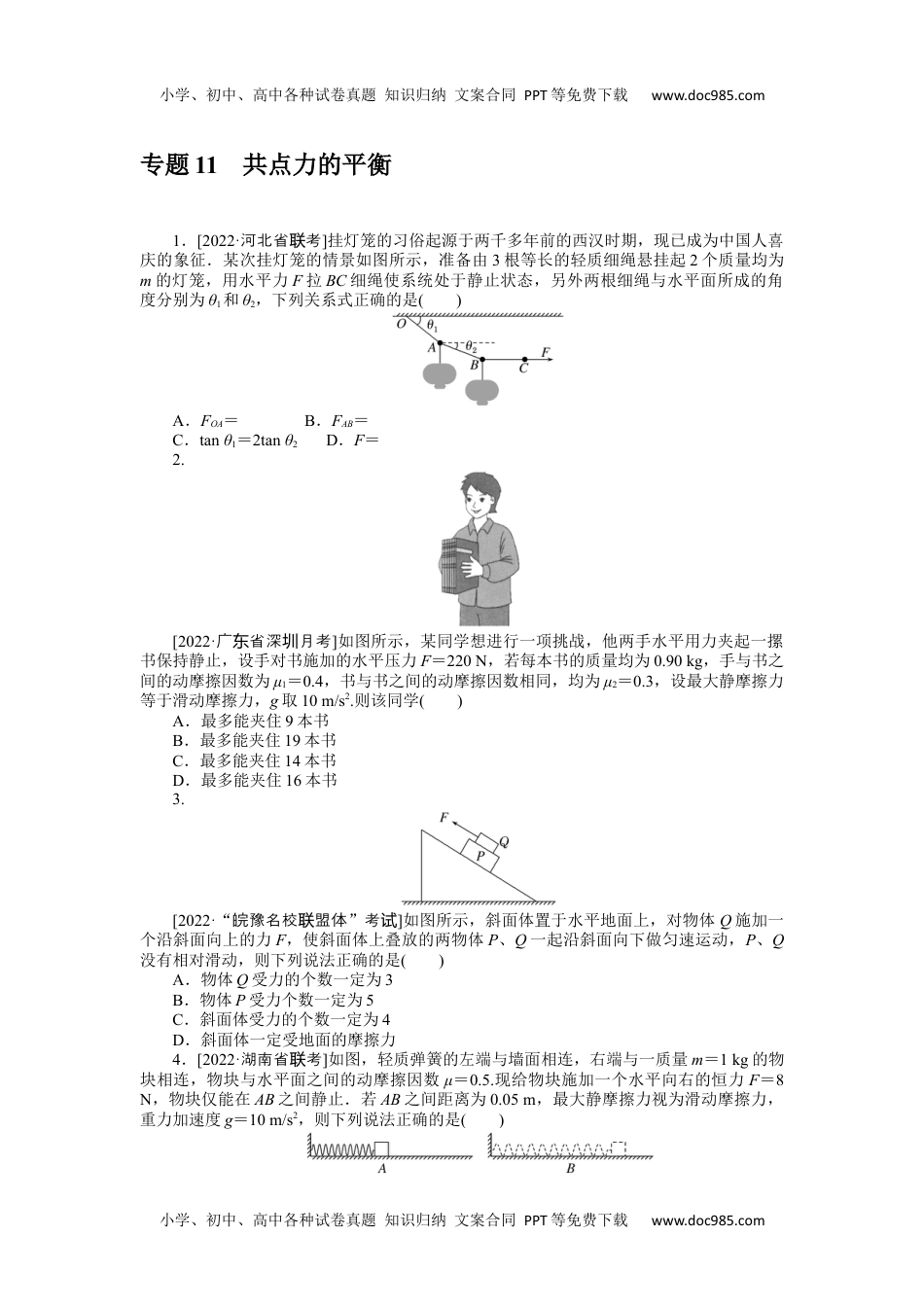 小学、初中、高中各种试卷真题知识归纳文案合同PPT等免费下载www.doc985.com专题11共点力的平衡1.[2022·河北省考联]挂灯笼的习俗起源于两千多年前的西汉时期,现已成为中国人喜庆的象征.某次挂灯笼的情景如图所示,准备由3根等长的轻质细绳悬挂起2个质量均为m的灯笼,用水平力F拉BC细绳使系统处于静止状态,另外两根细绳与水平面所成的角度分别为θ1和θ2,下列关系式正确的是()A.FOA=B.FAB=C.tanθ1=2tanθ2D.F=2.[2022·广省深月考东圳]如图所示,某同学想进行一项挑战,他两手水平用力夹起一摞书保持静止,设手对书施加的水平压力F=220N,若每本书的质量均为0.90kg,手与书之间的动摩擦因数为μ1=0.4,书与书之间的动摩擦因数相同,均为μ2=0.3,设最大静摩擦力等于滑动摩擦力,g取10m/s2.则该同学()A.最多能夹住9本书B.最多能夹住19本书C.最多能夹住14本书D.最多能夹住16本书3.[2022·“皖豫名校盟体联”考试]如图所示,斜面体置于水平地面上,对物体Q施加一个沿斜面向上的力F,使斜面体上叠放的两物体P、Q一起沿斜面向下做匀速运动,P、Q没有相对滑动,则下列说法正确的是()A.物体Q受力的个数一定为3B.物体P受力个数一定为5C.斜面体受力的个数一定为4D.斜面体一定受地面的摩擦力4.[2022·湖南省考联]如图,轻质弹簧的左端与墙面相连,右端与一质量m=1kg的物块相连,物块与水平面之间的动摩擦因数μ=0.5.现给物块施加一个水平向右的恒力F=8N,物块仅能在AB之间静止.若AB之间距离为0.05m,最大静摩擦力视为滑动摩擦力,重力加速度g=10m/s2,则下列说法正确的是()小学、初中、高中各种试卷真题知识归纳文案合同PPT等免费下载www.doc985.com小学、初中、高中各种试卷真题知识归纳文案合同PPT等免费下载www.doc985.comA.弹簧原长位置在A点右侧B.弹簧原长位置在AB之间C.弹簧劲度系数k=200N/mD.弹簧劲度系数k=260N/m5.[2022·浙江省考联]质量为m的小球,用细线AB悬挂在竖直的墙壁上,细线与墙壁的夹角为60°,如图甲所示,当小球受到拉力F1时,拉力与细线的夹角为120°,小球正好静止不动.如图乙所示,当小球受到拉力F2时,与细线的夹角为150°,小球正好静止不动,重力加速度为g,下列说法正确的是()A.两种情况下,细线AB的拉力与重力的合力的大小之比为1∶B.两种情况下,细线AB的拉力相同C.两种情况下,细线AB的拉力之比为2∶1D.F1、F2的比值为2∶6.[2022·云南省昆明检测]如图,两个轻滑轮通过细绳悬挂在天花板上,轻绳跨过滑轮连接两个质量为m的物体,将一与质量为M的物体连接的动滑轮放到轻绳上后系统保持静止,滑轮质量不计.此时悬挂在天花板上的轻绳与竖直方向的夹角为30°,则M与m的比值关系正确的是()A.1∶1B.1∶2C.2∶1D.1∶37.[2022·宁沈月考辽阳]如图所示,质量为m的匀质细绳,一端系在天花板上的A点,另一端系在竖直墙壁上的B点,平衡后最低点为C点.现测得AC段绳长是BC段绳长的n倍,且过绳子B端的切线与墙壁的夹角为α.以下说法正确的是()A.绳子在C处弹力大小为mgtanαB.绳子在B处弹力大小为C.绳子在A处弹力大小为D.绳子A端的切线与竖直方向夹角也为α小学、初中、高中各种试卷真题知识归纳文案合同PPT等免费下载www.doc985.com小学、初中、高中各种试卷真题知识归纳文案合同PPT等免费下载www.doc985.com小学、初中、高中各种试卷真题知识归纳文案合同PPT等免费下载www.doc985.com