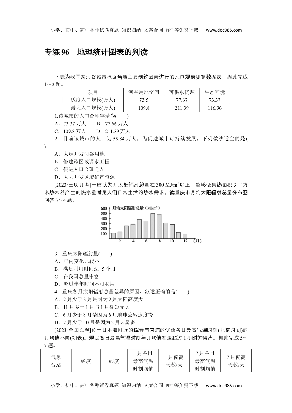 小学、初中、高中各种试卷真题知识归纳文案合同PPT等免费下载www.doc985.com专练96地理统计图表的判读下表我某河谷城市根据地主要制因素行的人口模算据表。为国当约进规测数据此完成1~2题。项目河谷用地空间可供水资源生态环境适度人口规模(万人)73.577.6773.37最大人口规模(万人)109.8211.39116.961.该城市的人口合理容量为()A.73.37万人B.77.66万人C.109.8万人D.211.39万人2.目前该城市的人口为55.84万人,为促进城市可持续发展,下列做法适宜的是()A.大肆开发河谷用地B.修建跨区域调水工程C.促进人口合理迁入D.大力开发区域矿产资源[2023·三明月考]一般月太射量在认为阳辐总300MJ/m2以上,能使集面够热积3平方米水器生的水量足人日常生活的水需求。重市月均太射量分布热产热满们热读庆阳辐总图回答3~4题。3.重庆太阳辐射量()A.年内变化比较小B.满足利用时间达5个月C.在我国总量丰富D.超过半年时间不可利用4.重庆各月太阳辐射总量差异的原因,叙述正确的是()A.2月少于3月是因为2月太阳高度大B.11月多于1月与1月昼短无关C.6月少于8月是因为6月地球公转速度慢D.2月少于10月是因为2月云雾多[2023·全乙卷国]位于日本海附近的春的源各日最高刻珲与内陆辽气温时(北京时间)的月均不同值(如表)。定各日最高刻月均相差超规气温时与值过1小偏离。时为据此完成5~7题。气象台站经度纬度1月各日最高气温时刻均值1月偏离天数/天7月各日最高气温时刻均值7月偏离天数/天小学、初中、高中各种试卷真题知识归纳文案合同PPT等免费下载www.doc985.com小学、初中、高中各种试卷真题知识归纳文案合同PPT等免费下载www.doc985.com珲春130.35°E42.86°N约14时00分20.8约14时40分19.6辽源125.15°E42.90°N约13时20分14.4约13时50分17.25.珲春7月各日最高气温时刻均值滞后当地正午约()A.1小时40分钟B.2小时00分钟C.2小时40分钟D.3小时20分钟6.珲春的最高气温时刻月均值滞后当地正午的时间长于辽源,原因是珲春()A.降水多B.受海洋影响强C.风力强D.受山地影响强7.辽源冬季偏离天数少,说明辽源冬季多()A.雨雪天气B.温带气旋C.晴朗天气D.冷锋过境[2023·州苏调研]下图为“美、英、中、日四首次房年住房自有率国购龄与图”。读图,回答8~9题。8.据图,下列说法正确的是()①美国的购房压力最大②英国的住房自有率与美国相同③日本的购房压力最大④中国的首次购房年龄小于日本A.①②B.②④C.①③D.③④9.图中,中国购房特征的成因可能是()①“先购房,后结婚”的观念②与另三国相比,投资渠道狭窄③日本的购房压力最大④中国的首次购房年龄小于日本A.①②B.②③C.③④D.①④[2023·福建高三专题练习]粮食安全乎家大局,建家高准田是粮食安全的关国设国标农重要保障。下我部分省行政图为国级区2020年高准田建成模标农规(位:千万单亩)统计图。读图,完成10~12题。小学、初中、高中各种试卷真题知识归纳文案合同PPT等免费下载www.doc985.com小学、初中、高中各种试卷真题知识归纳文案合同PPT等免费下载www.doc985.com10.高标准农田规模大于五千万亩的省区主要集中于()A.青藏地区B.西北地区C.北方地区D.南方地区11.为提高高标准农田的质量,各省做法合理的是()A.河北—大水漫灌,防止水土流失B.江苏—退耕还林,修建水平梯田C.四川—治理盐碱,提高复种指数D.云南—科学培肥,提高土壤肥力12.我国保障粮食安全的措施有()①加强农田水利设施建设②提高粮食进口比重③激励农业科技创新④调动农民种粮积极性⑤积极增加劳动力投入A.①②③B.①③④C.②③④D.②③⑤[2023·晋江质检]花植物百分比是指正在花的植物占可花植物的百分比开开种类开种类。下示意图“北半球不同度高山花植物百分比年化纬开内变”。图据此完成13~14题。13.导致图中20°N到70°N高山开花植物开花季节逐渐缩短的主要气候要素是()A.光热B.降水C.温度D.气压14.70°N开花植物百分比始终低于30°N,可推测70°N各类开花植物()A.数量较少B.花期较短C.种类较少D.花朵较小小学、初中、高中各种试卷真题知识归纳文案合同PPT等免费下载www.doc985.com