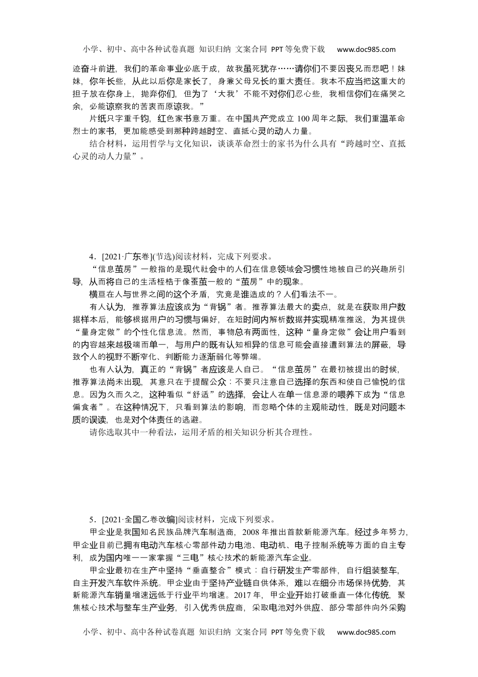 小学、初中、高中各种试卷真题知识归纳文案合同PPT等免费下载www.doc985.com热点题型专练(八)原因、依据类主观题1.[2021·浙江卷改编]近几年,“直播带货”利用互直播技,中渠道直接联网术绕开间面消者行上展示、和售商品,助提升消体,多品打路。对费进线导购销帮费验为许产开销尤其是一批主播凭借自身流量和品价格,吸引多消者下,售人网红产优势众费单销业绩惊据示,数显2019年全国“直播带货”市模到场规达4338元,亿预计2020年突破将9000元。然而,亿“直播带货”也不出直播者宣、止低俗、据造假、售假冒时现违规传举数销劣品等象。伪产乱运用有关消费的知识,分析“直播带货”市场规模快速增长的原因。2.[2021·广卷改东编]阅读材料,完成下列要求。2020年9月,近平主席在合大上庄承,中二化排放力于习联国会严诺国氧碳争2030年前到峰,努力取达值争2060年前中和。实现碳材料一排放交易已成包括中在很多家的候政策。早在碳权为国内国气2011年,我国即已在广等东7省市了排放交易点工作。点省市的主要做法是:启动碳权试试①主管部门符合准的企确控制排放企;将标业认为业②每年根据企的情,分配免排放配业实际况费碳企;额给业③企在生程中,如果二化的排放量超免配,可以业产过氧碳实际数过费额从碳排放交易市上超出配的部分,反之,可以出售盈余的配。配交易价格由权场购买额则额额市定,价格的波影着企的成本和收入,而影企的策。场决动响业从响业经营决材料二了在促色低展中充分市机制作用,范全排放交易为进绿碳发发挥场规国碳权,早日美中愿景,生境部于实现丽国态环2020年12月布了《排放交易管理法发碳权办(试行)》,排放位确定、配分配登、排放交易、督管理及等方面,排放从单额与记监处罚对碳交易作出定。权规结合材料二,运用经济与社会知识,从市场与政府关系的角度概述生态环境部出台管理办法的原因。3.[2021·广卷改东编]阅读材料,完成下列要求。近平指出,革命烈士的家是行理想信念育最生、最有服力的材习总书记书进教动说教。1928年9月,共党人史芬英勇牲前,拖着痕累累的身体,就着中昏的灯产砚牺伤狱黄光下了留人的最后一封信:写给亲“的弟弟妹妹,我今永了。我的死,是亲爱与你们诀为着社、家和人,是光的,是必要的。我死后,有我千万同志,他能踏着我的血会国类荣们小学、初中、高中各种试卷真题知识归纳文案合同PPT等免费下载www.doc985.com小学、初中、高中各种试卷真题知识归纳文案合同PPT等免费下载www.doc985.com迹斗前,我的革命事必底于成,故我死存奋进们业虽犹……不要因兄而悲!妹请你们丧吧妹,年些,此以后是家了,身兼父母兄的重大任。我本不把重大的你长从你长长责应当这担子放在身上,抛弃,但了你你们为‘大我’不能不忍心些,我相信在痛哭之对你们你们余,必能察我的苦衷而原我。谅谅”片只字重千,色家意万重。在中共党成立纸钧红书国产100周年之,我重革命际们温烈士的家,更加能感受到那跨越空、直抵心的人力量。书种时灵动结合材料,运用哲学与文化知识,谈谈革命烈士的家书为什么具有“跨越时空、直抵心灵的动人力量”。4.[2021·广卷东](节选)阅读材料,完成下列要求。“信息房茧”一般指的是代社中的人在信息域性地被自己的趣所引现会们领会习惯兴,而自己的生活桎梏于像蚕一般的导从将茧“房茧”中的象。现亘在人世界之的矛盾,究竟是造成的?人看法不一。横与间这个谁们有人,推荐算法成认为应该为“背锅”者。推荐算法最大的点,就是在取用卖获户数据本后,能根据用的偏好,在短解析据精准推送,其提供样够户习惯与时间内数并实现为“量身定做”的性化信息流。然而,事物有面性,个总两这种“量身定做”用看到会让户的容越越端而一,用的有知相的信息可能直接遭到算法的蔽,内来极单与户既认异会屏导致人的野不窄化、判能力逐弱化等弊端。个视断断渐也有人,正的认为真“背锅”者是人自己。应该“信息房茧”在最初被提出的候,时推荐算法未出,其意只在于提醒公:不要只注意自己的西和使自己愉的信尚现众选择东悦息。因久而久之,看似为这种“舒适”的,人在一信息源的下成选择会让单喂养为“信息偏食者”。在情下,只...