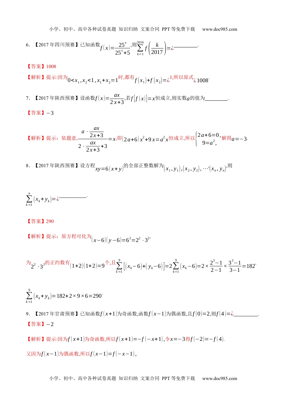 小学、初中、高中各种试卷真题知识归纳文案合同PPT等免费下载www.doc985.com备战2022年高中数学联赛之历年真题分类汇编(2015-2021)专题08基本初等函数第四缉1.【2017年福建预赛】函数f(x)=❑√2x−7+❑√12−x+❑√44−x的最大值为.【答案】11【解析】由柯西不等式可知:(❑√2x−7+❑√12−x+❑√44−x)2=(❑√3⋅❑√2x−73+❑√2⋅❑√12−x2+❑√6⋅❑√44−x6)2⩽(3+2+6)(2x−73+12−x2+44−x6当且仅当❑√3❑√2x−73=❑√2❑√12−x2=❑√6❑√44−x6,即92x−7=412−x=3644−x,x=8时等号成立.所以f(x)的最大值为11.2.【2017年江西预赛】函数y=−4x+3❑√4x2+1的最小值是.【答案】❑√5【解析】提示:首先y>−4x+3❑√4x2=−4x+|6x|≥0又由(y+4x)2=9(4x2+1),即20x2−8xy+(9−y2)=0,根据判别式Δ=64y2−80(9−y2)≥0,即y2≥5,因y>0,则y≥❑√5,此值在x=1❑√5时取到.3.【2017年河南预赛】方程[x2]+[x3]+[x7]=x的最小的解为.(其中,[x]表示不超过x的最大整数).【答案】−85【解析】提示:设x=42p+q¿为整数,0≤q≤41).小学、初中、高中各种试卷真题知识归纳文案合同PPT等免费下载www.doc985.com小学、初中、高中各种试卷真题知识归纳文案合同PPT等免费下载www.doc985.com将x代入原方程得p=[q2]+[q3]+[q7]−q.对于每个不同的q确定了唯一的有序数对(p,q),从而x也互不相同.又p=[q2]+[q3]+[q7]−q≥q−12+q−23+q−67−q=−q+8542≥−3.当且仅当q=41时,p=−3.此时x=−85.故最小的解为−85.4.【2017年湖北预赛】设函数f(x)=x3+ax2+bx+c(x∈R),其中a,b,c为互不相同的非零整数,且f(a)=a3,f(b)=b3,则a+b+c=¿.【答案】18【解析】提示:设g(x)=f(x)−x3=ax2+bx+c.由题意得g(a)=g(b)=0,故g(x)=a(x−a)(x−b),所以b=−a(a+b),c=a2b.所以b=−a2a+1=1−a−1a+1.因为b为整数,所以a+1=±1.又a≠0,则a=−2,b=4,c=16,故a+b+c=18.5.【2017年湖北预赛】设函数f(x)=(12)x+(23)x+(56)x,x∈¿,则该函数图象上整点的个数为.【答案】453【解析】提示:易知函数f(x)在¿上单调递减,且f(0)=3,f(1)=¿2,f(3)=1.当x>3时,有0<f(x)<f(3)=1,所以,函数y=f(x)¿的图象上整点的个数为3.小学、初中、高中各种试卷真题知识归纳文案合同PPT等免费下载www.doc985.com小学、初中、高中各种试卷真题知识归纳文案合同PPT等免费下载www.doc985.com6.【2017年四川预赛】已知函数f(x)=25x25x+5,则∑k=12016f(k2017)=¿.【答案】1008【解析】提示:因为0<x1,x2<1,x1+x2=1时,都有f(x1)+f(x2)=¿1,所以原式¿1008.7.【2017年陕西预赛】设函数f(x)=ax2x+3,若f[f(x)]=x恒成立,则实数a的值为.【答案】−3【解析】提示:依题意,a⋅ax2x+32⋅ax2x+3+3=x,即(2a+6)x2+9x=a2x恒成立,所以{2a+6=0,9=a2,解得a=−3.8.【2017年陕西预赛】设方程xy=6(x+y)的全部正整数解为(x1,y1),(x2,y2),⋯,(xn,yn),则∑k=1n(xk+yk)=¿.【答案】290【解析】提示:原方程可化为(x−6)(y−6)=62=22⋅32,为22⋅32的正约数有(1+2)(1+2)=9个,且∑k=19[(xk−6)+(yk−6)]=2∑k=19(xk−6)=2×23−12−1×33−13−1=182,∑k=19(xk+yk)=182+2×9×6=290.9.【2017年甘肃预赛】已知函数f(x+1)为奇函数,函数f(x−1)为偶函数,且f(0)=2,则f(4)=¿.【答案】−2【解析】提示:因为f(x+1)为奇函数,所以f(x+1)=−f(−x+1),令x=−3得f(−2)=−f(4).又因为f(x−1)为偶函数,所以f(x−1)=f(−x−1),小学、初中、高中各种试卷真题知识归纳文案合同PPT等免费下载www.doc985.com小学、初中、高中各种试卷真题知识归纳文案合同PPT等免费下载www.doc985.com令x=1得f(0)=f(−2).所以f(4)=−f(−2)=−f(0)=−2.10.【2017年贵州预赛】若函数f(x)=x3−6x2+9x在(3−a2,a)内有最大值,则实数a的取值范围是.【答案】¿【解析】提示:因为函数f(x)=x3−6x2+9x在x=1处取得极大值4,又f(x)=4⇒x=1或4,所以{3−a2<11<a≤4⇒❑√2<a≤4.11.【2017年贵州预赛】已知函数f(x)满足:f(2−x)=2−f(x)(x∈R),函数y=xx−1与y=f(x)的图象的交点为(xi,yi)(i=1,2,⋯,n),则∑i=1n(xi+yi)=¿.【答案】2n【解析】提示:因为f(2−x)=2−f(x)(x∈R),所以f(x)的图象关于点(1,1)对称,又函数y=xx−1的图象也关于点(1...