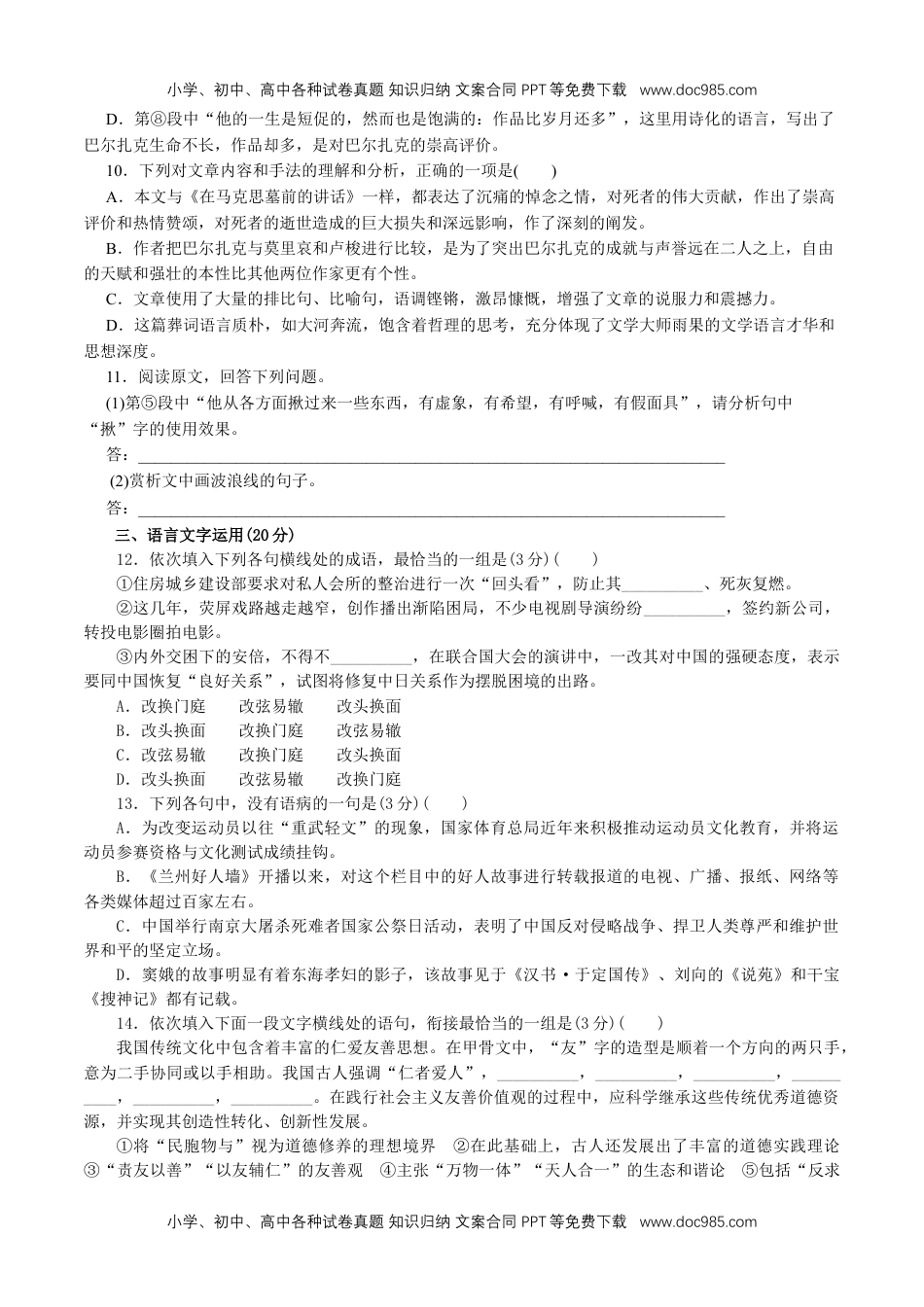 小学、初中、高中各种试卷真题知识归纳文案合同PPT等免费下载www.doc985.com10.1《在〈人民报〉创刊纪念会上的演说》同步练习一、基础知识测试1.下列各组词语中画线字注音无误的一项是()A.悼词(dào)估量(gǔ)芜杂(wú)B.豁然(huò)肤浅(fū)卓越(zhuó)C.撰稿(zuàn)嫉恨(jì)诬蔑(miè)D.诅咒(chòu)诽谤(fēi)给予(jǐ)2.下列四组词语书写无误的一项是()A.尊敬爱戴答覆B.遭受隐弊涂抹C.衷心毕生激励D.逻辑损失粉繁3.下面有错别字的一项是()A.嫉恨诬蔑驱逐衷心喜悦B.莱茵河不可估量纷繁竞相C.豁然开琅诅咒给与答复D.爱戴永垂不朽唯物辩证法4.下列词语中字解释有误的一项是()A.纷繁芜杂芜:草长得杂乱B.永垂不朽垂:传下去,传留后世C.卓有成效卓:高超的,不平凡的D.豁然开朗豁:免除5.句中横线处填入词语最恰当的一组是()一生中能有这样两个发现,该是很够了。只能作出一个这样的发现,已经是幸福的了。马克思在他所研究的每一个领域,在数学领域,都有独到的发现,这样的领域是很多的,其中任何一个领域他都不是浅尝辄止.A.即使也但是甚至而且B.只要就而况甚至而且C.只要就但是特别况且D.即使也而况特别况且6.下列各句标点符号使用完全正确的一项是()A.这个人的逝世,对于欧美战斗着的无产阶级、对于历史科学,都是不可估量的损失B.等我们再进去的时候,便发现他在安乐椅上安静地睡着了——但已经是永远地睡着了C.千百万革命战友无不对他表示尊敬,爱戴和悼念;而我敢大胆地说:“他可能有过许多敌人,但未必有一个私敌!”D.各国政府:无论专制政府或共和政府,都驱逐他资产者:无论保守派或极端民主派,都竞相诽谤他,诅咒他7.下列句子中画线成语使用有误的一项()A.这两家企业在偷税内容方面有所不同,但在方法上如出一辙B.对于团体赛中谁先上的问题,两位教练的意见大相径庭,没有很大分歧C.我们离别已整整十年,想不到今天在火车上不期而遇D.损人利己是一切剥削阶级立身处世的原则8.“对爱好文科的学生,加强文科辅助是必要的,但是否可以忽视理科的学习呢?还要不要他们学好数学、物理、化学和生物呢?”从下面四句中选出能与它衔接的句子()A.从长远的观点看,我们认为这样做是很不恰当的B.如果我们缺乏战略眼光,在实际工作中就可能作出错误的回答C.为了使学生有合理的知识结构,我们的回答是肯定的D.只要认真想一想中等教育的培养目标,人们会说:不可以二、阅读能力测试小学、初中、高中各种试卷真题知识归纳文案合同PPT等免费下载www.doc985.com小学、初中、高中各种试卷真题知识归纳文案合同PPT等免费下载www.doc985.com阅读下面的文字,完成文后题目。巴尔扎克葬词雨果各位先生:①方才入土的人是属于那些有公众悲痛送殡的人。在我们今天,一切虚构都消失了。从今以后,众目仰望的不是统治人物,而是思维人物。一位思维人物不存在了,举国都为之震动。今天,人民哀悼的,是死了有天才的人;国家哀悼的,是死了有天才的人。②各位先生,巴尔扎克的名字将打入我们的时代,给未来留下光辉的路线。③巴尔扎克先生参与了19世纪以来在拿破仑之后的强有力的作家一代,正如17世纪一群显赫的作家,涌现在黎塞留之后一样——就像文明发展中,出现了一种规律,促使武力统治者之后出现精神统治者一样。④在最伟大的人物中间,巴尔扎克是第一等的;在最优秀的人物中间,巴尔扎克是最高的一个。他的理智是壮丽的、颖特的,成就不是眼下说得尽的。他的全部书仅仅形成了一本书:一本有生命的、有光亮的、深刻的书,我们在这里看见我们的整个现代文化走动、来去,带着我说不清楚的、和现实打成一片的惊慌与恐怖的感觉。一部了不起的书,他取名喜剧,其实就是取名历史也无不可。⑤愿意也罢,不愿意也罢,同意也罢,不同意也罢,这部庞大而又奇特的作品的作者,就在自己不知道的时候,加入了革命作家的强大的行列。巴尔扎克笔直地奔到目的地,抓住了现代社会肉搏。他从各方面揪过来一些东西,有虚象,有希望,有呼喊,有假面具。他发掘恶习,解剖热情。他探索人、灵魂、心、脏腑、头脑与各个人的深渊。巴尔扎克由于他天赋的自由而强壮的本性,由于理智...